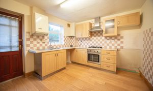 With laminate flooring, kitchen units, oven, gas hob, extractor, boiler, radiator, window and door to the rear garden