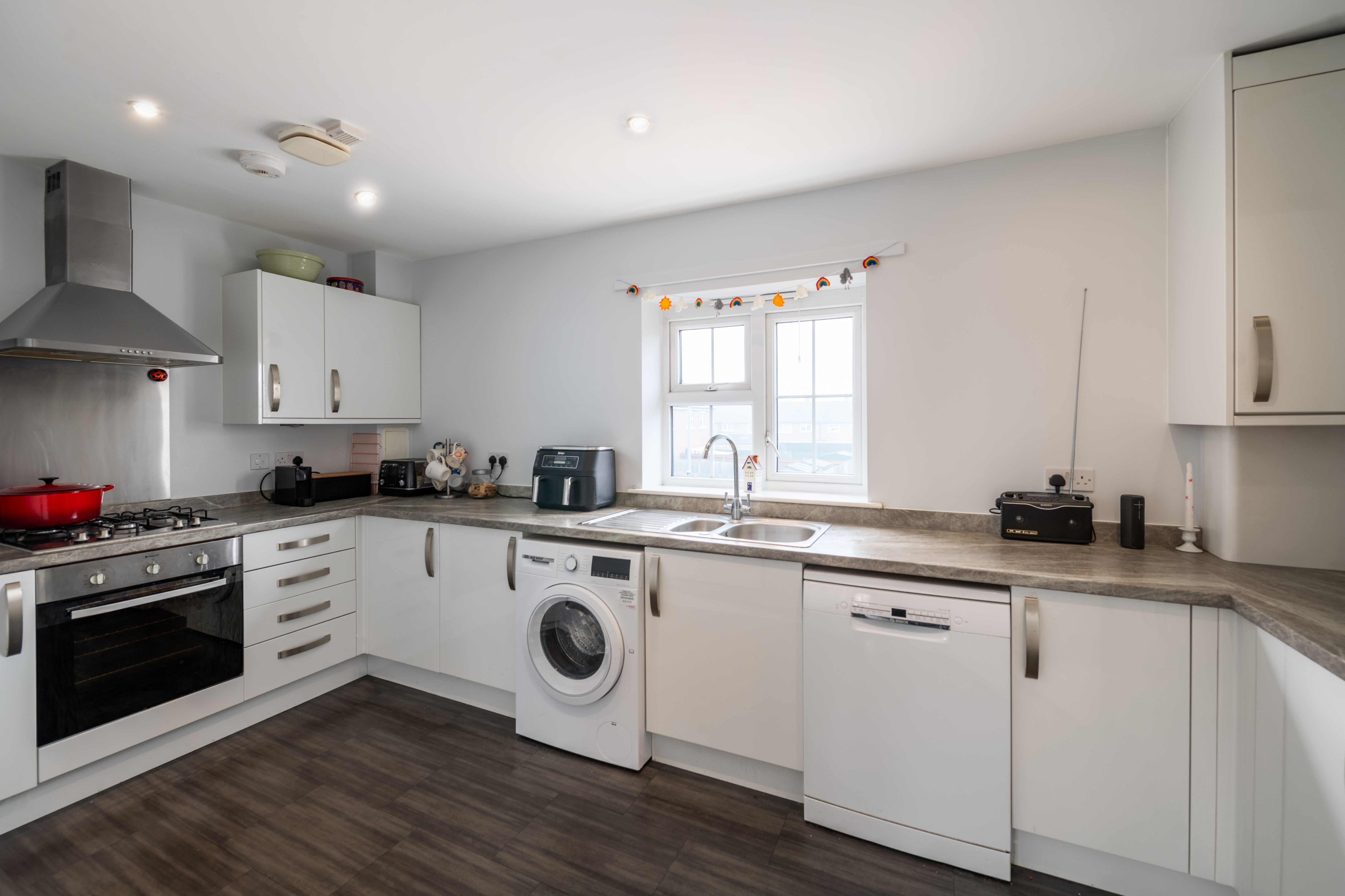 The modern fitted kitchen is well appointed with integrated appliances, ample storage, and sleek work surfaces, making it both practical and attractive for every-day living and entertaining.