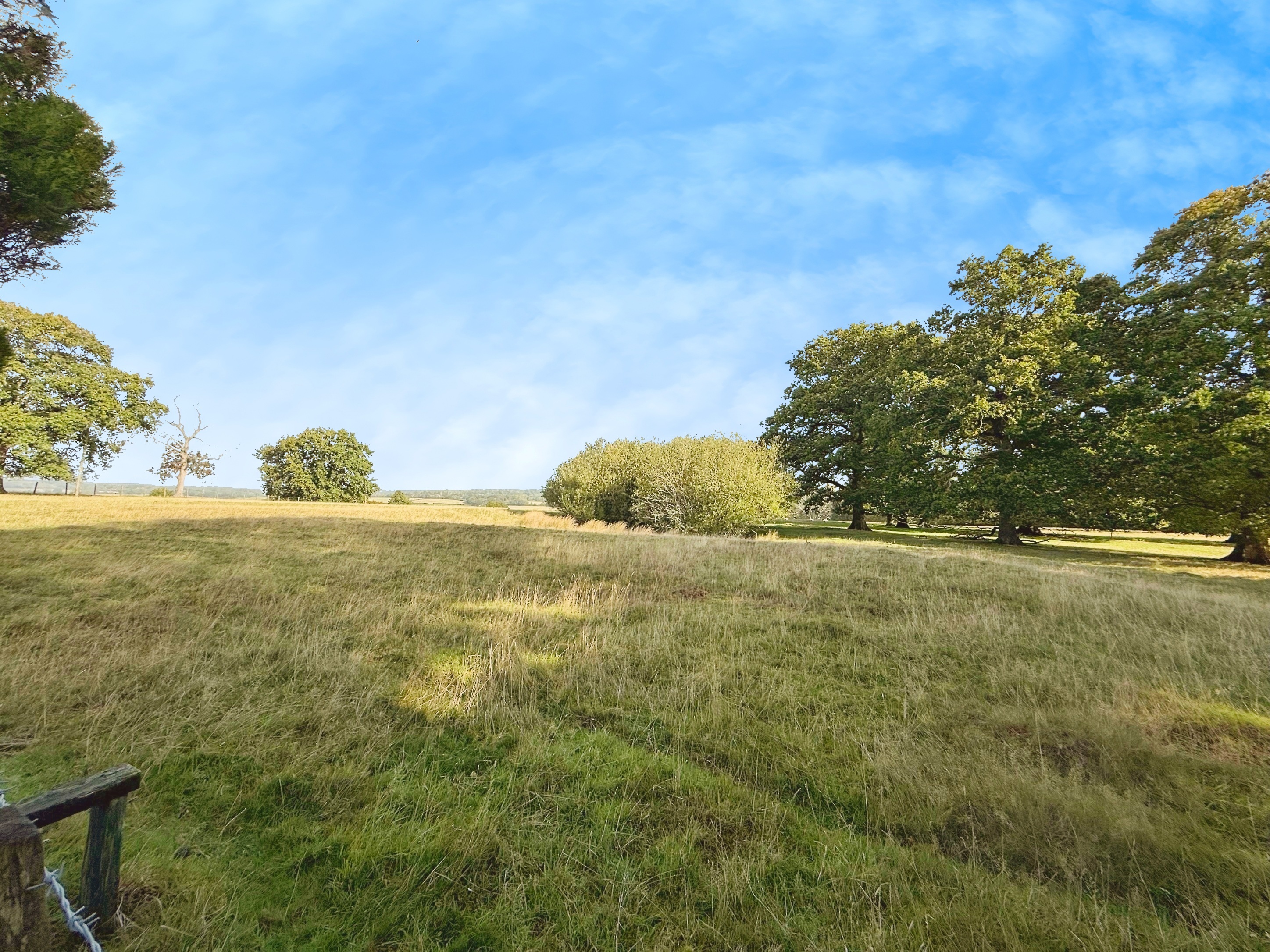 A large area of lawn, views over farmland to the side and rear with views into the Tillingham Valley, a range of trees and outbuildings.