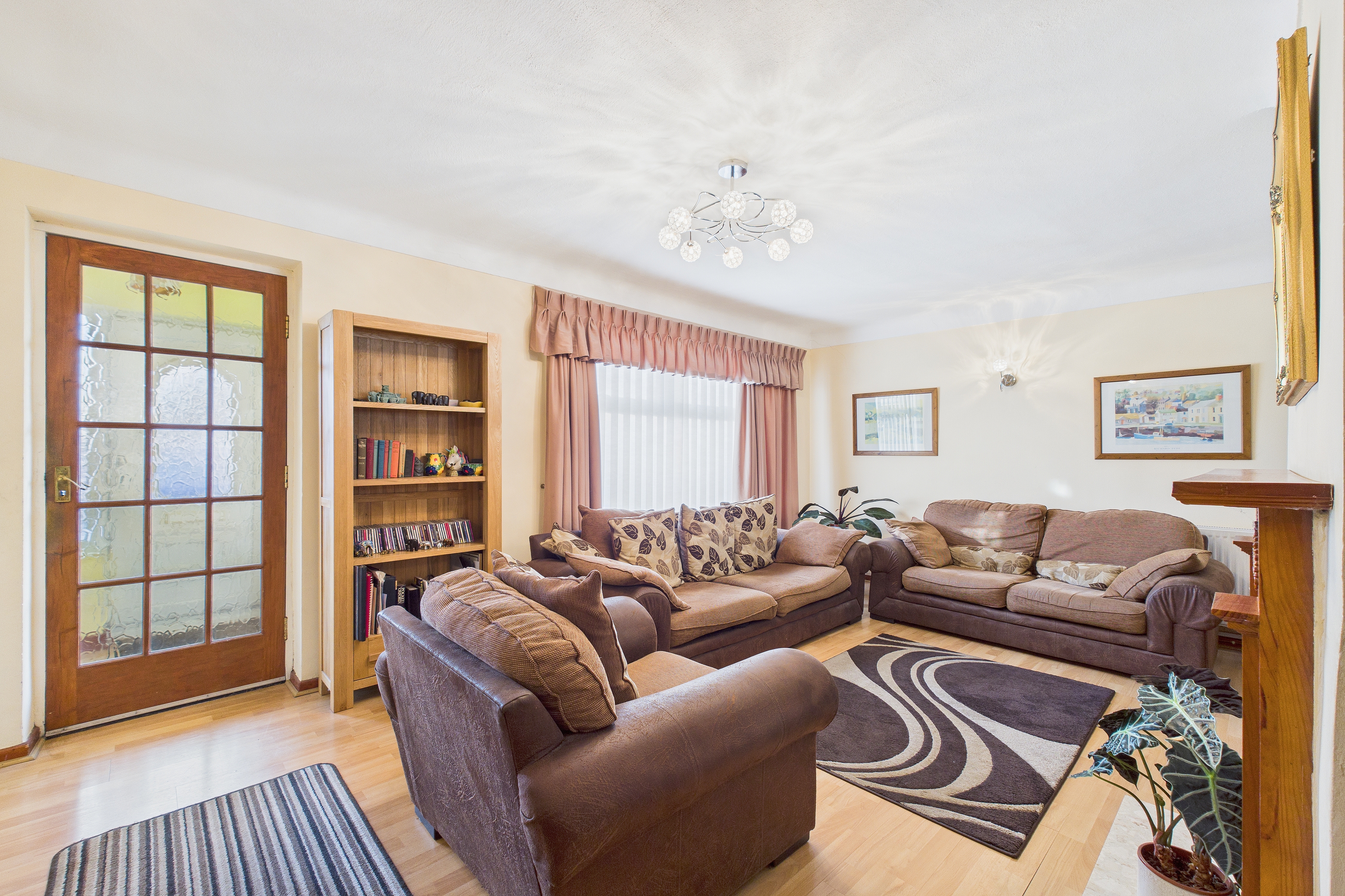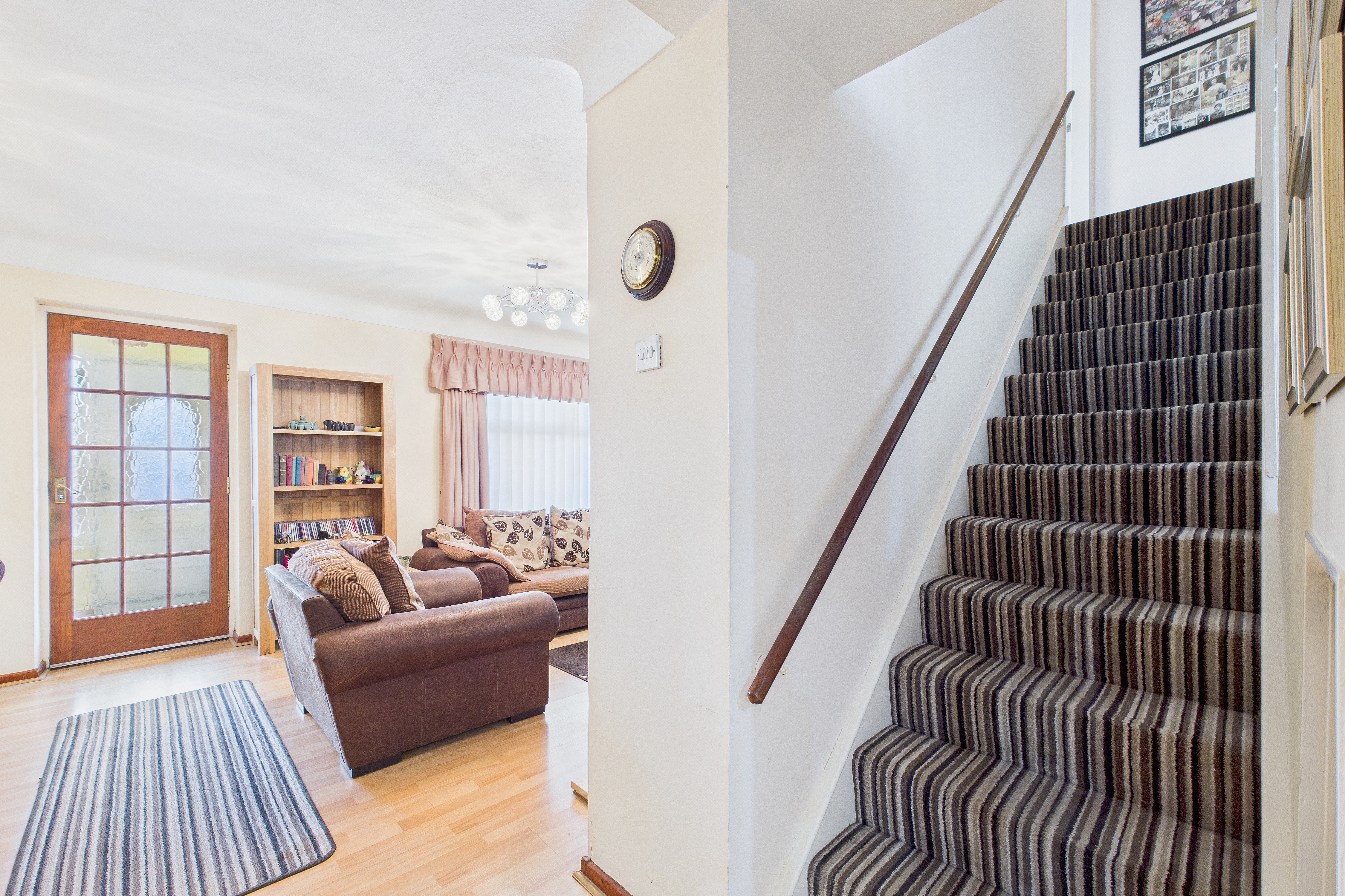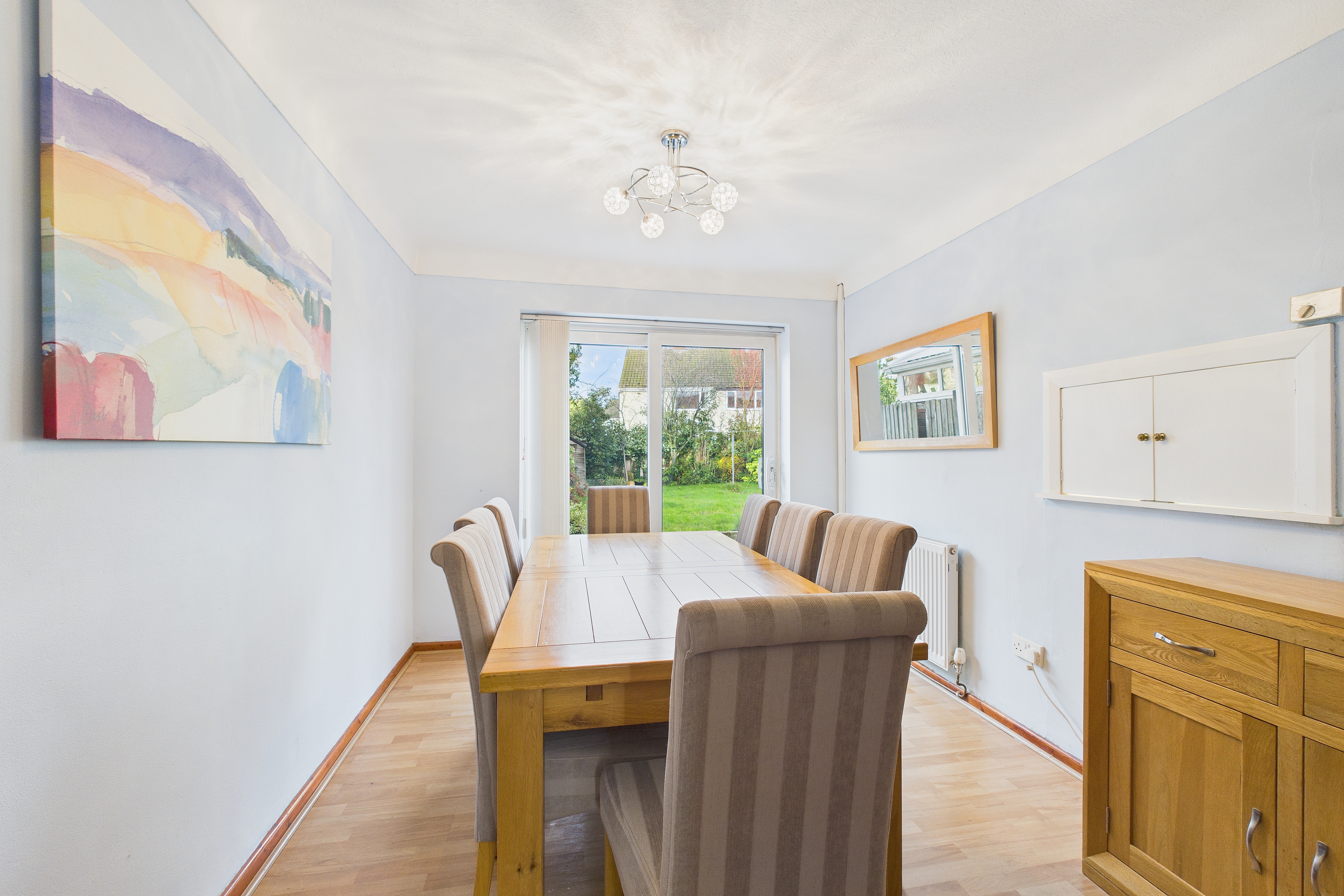 Entry to the home is through a uPVC double-glazed door into the porch – a particularly useful space for coats, shoes, and muddy boots – with a glazed inner door opening into the living room. This is a well-proportioned principal reception space featuring a living-flame gas fire with surround, forming an attractive focal point. A door leads through to the dining room, itself another generous room, with sliding patio doors connecting directly with the rear garden. Both reception rooms feature stylish and practical wood-effect laminate flooring. Returning to the living room, a staircase rises to the first-floor accommodation.