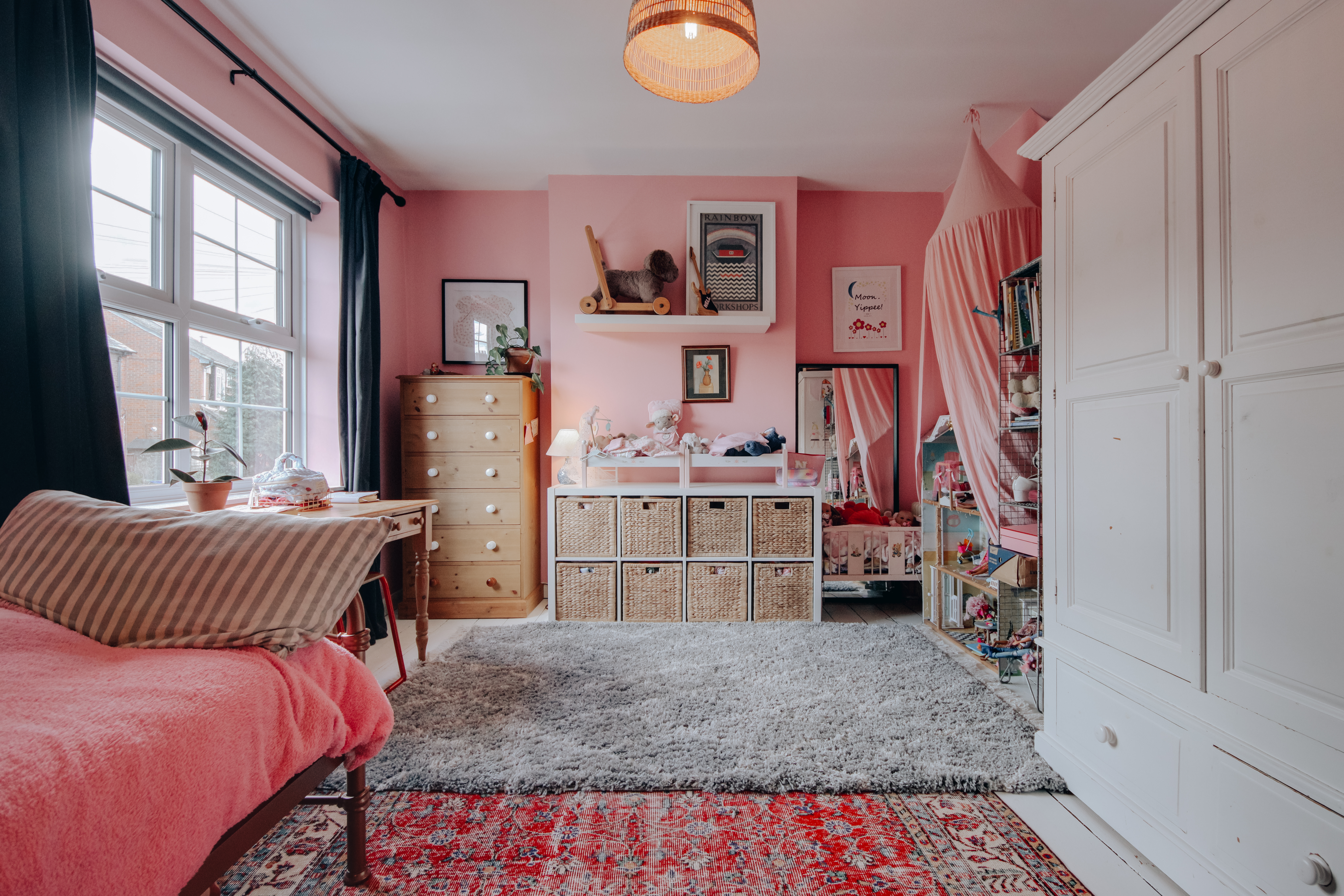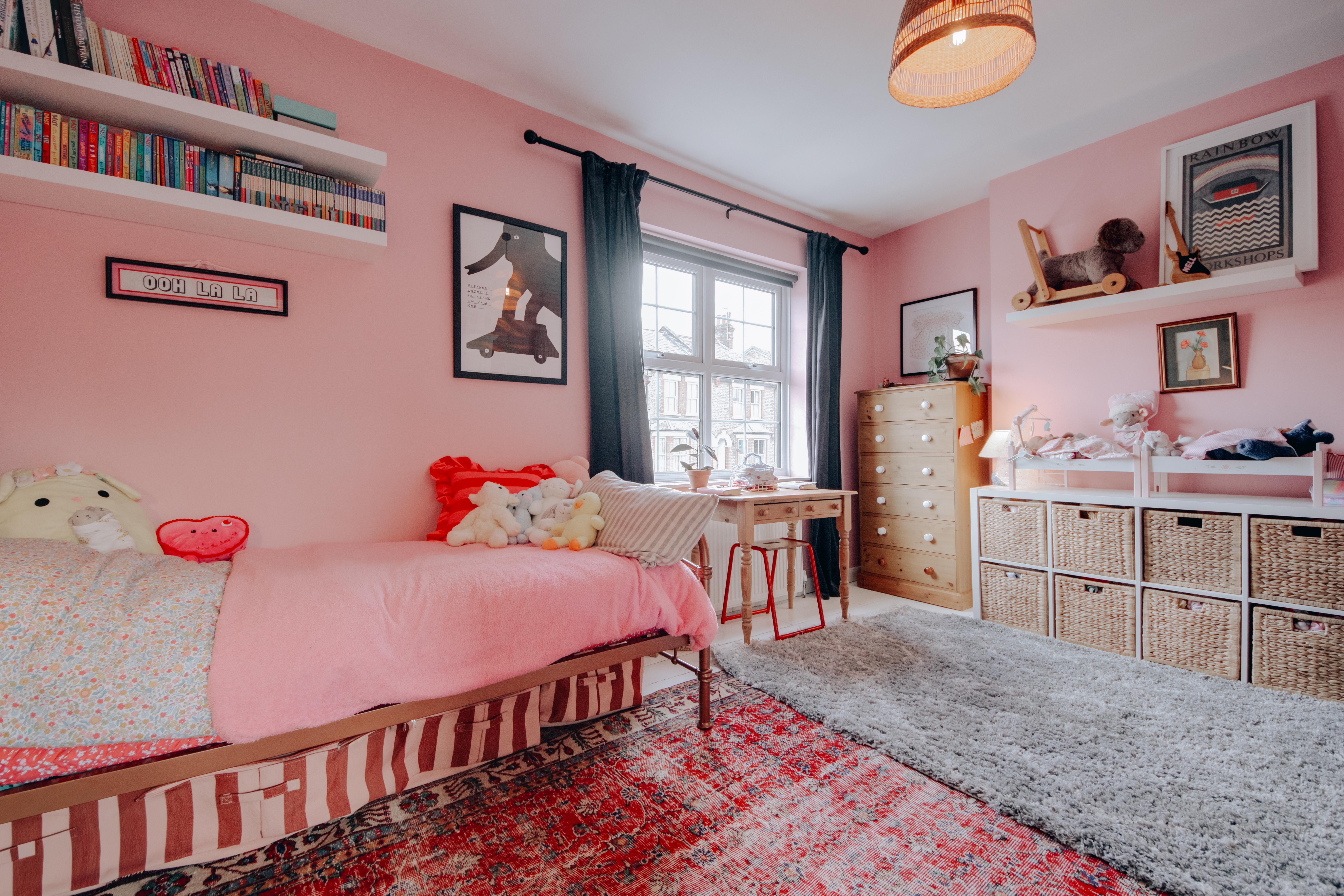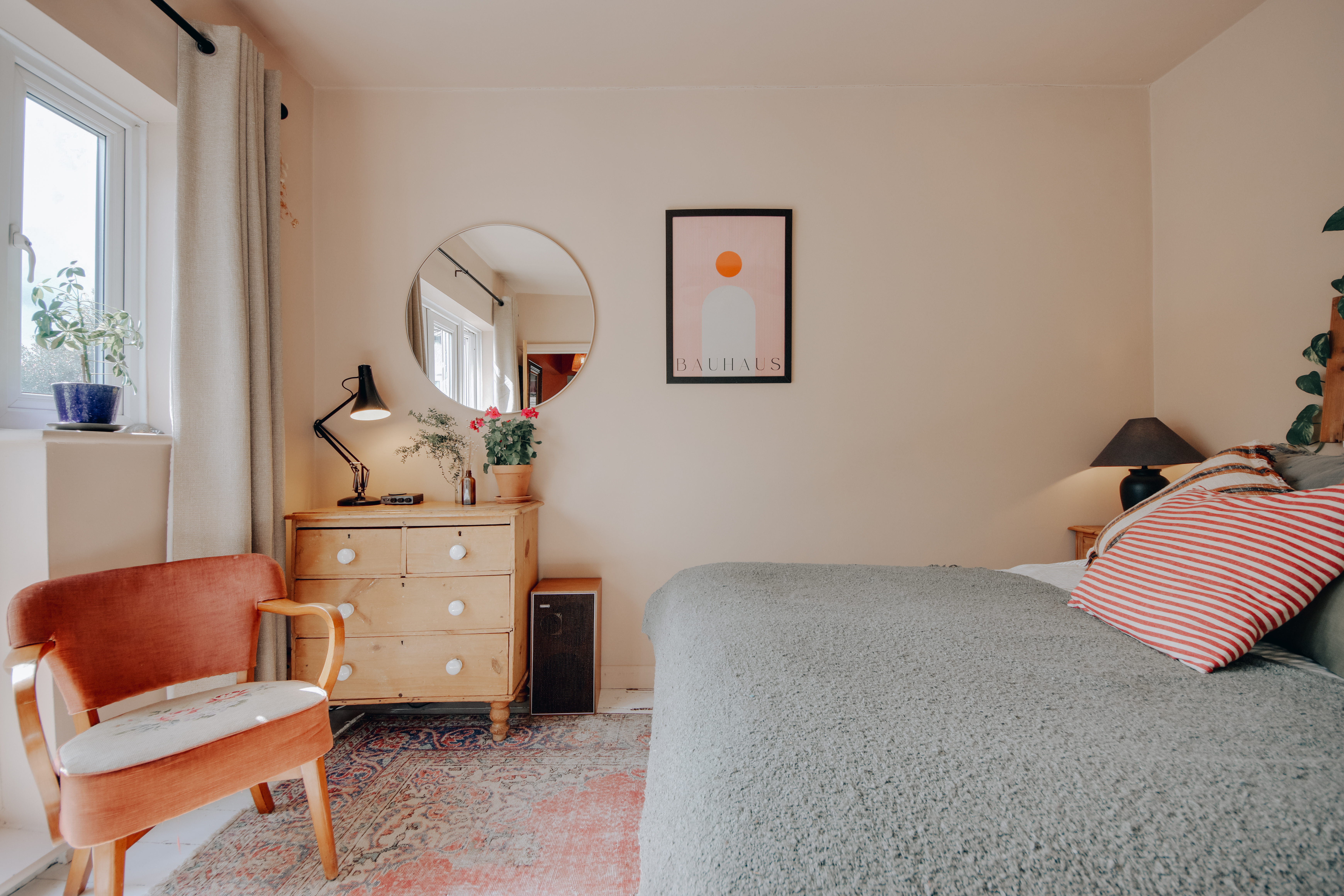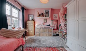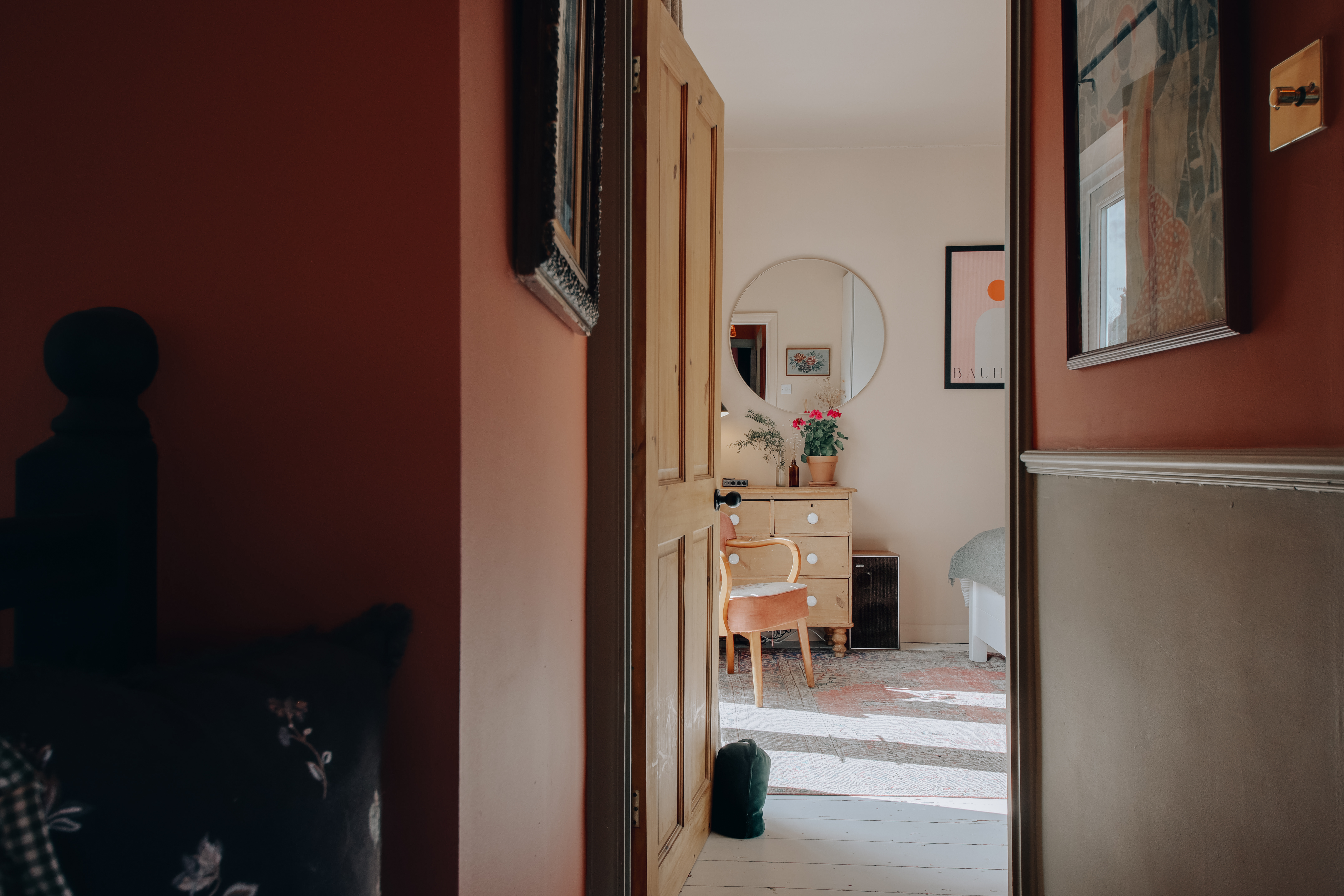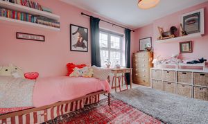 Upstairs, the first floor holds three bedrooms, each carrying the same considered quality as the spaces below. The principal, at 10'11" x 12'7", is anchored by double doors that pull the light in during the late afternoon in a way that is genuinely hard to leave. The two further bedrooms are finished with the same care, and the family bathroom closes the floor beautifully with soft muted tones, crisp white tile and chequerboard flooring.