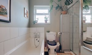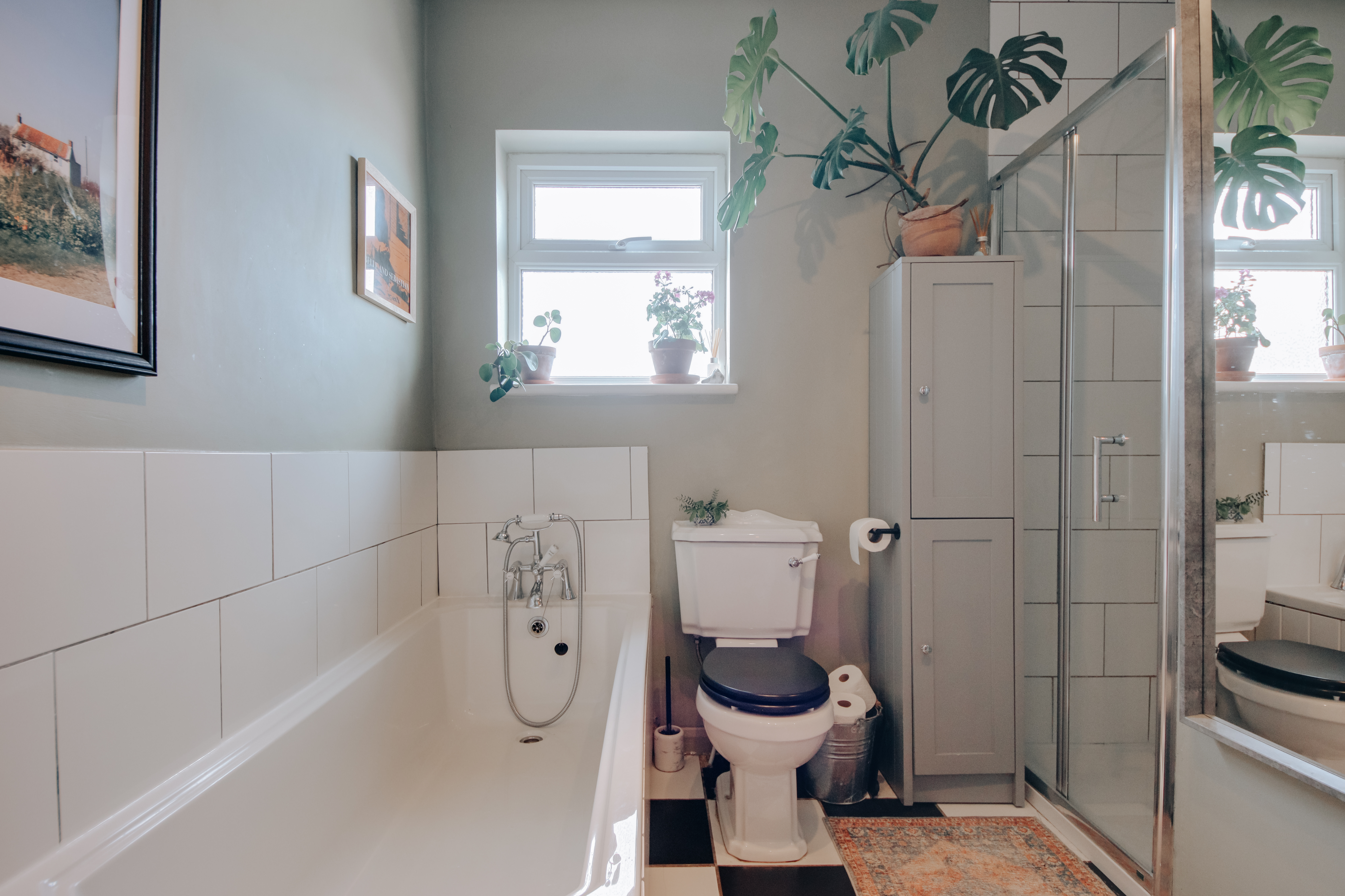 - Family bathroom finished with soft muted tones, crisp white tile and chequerboard flooring