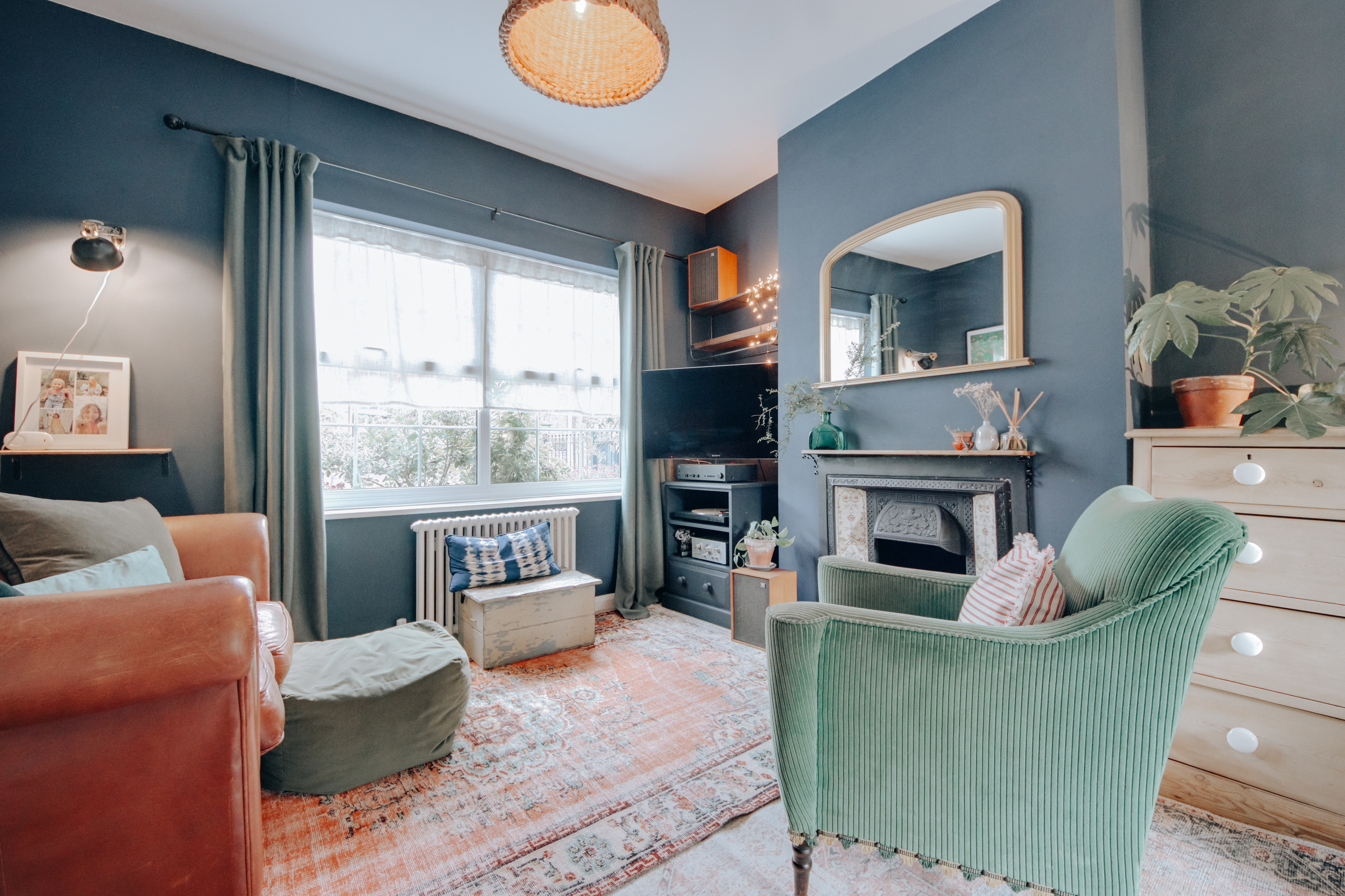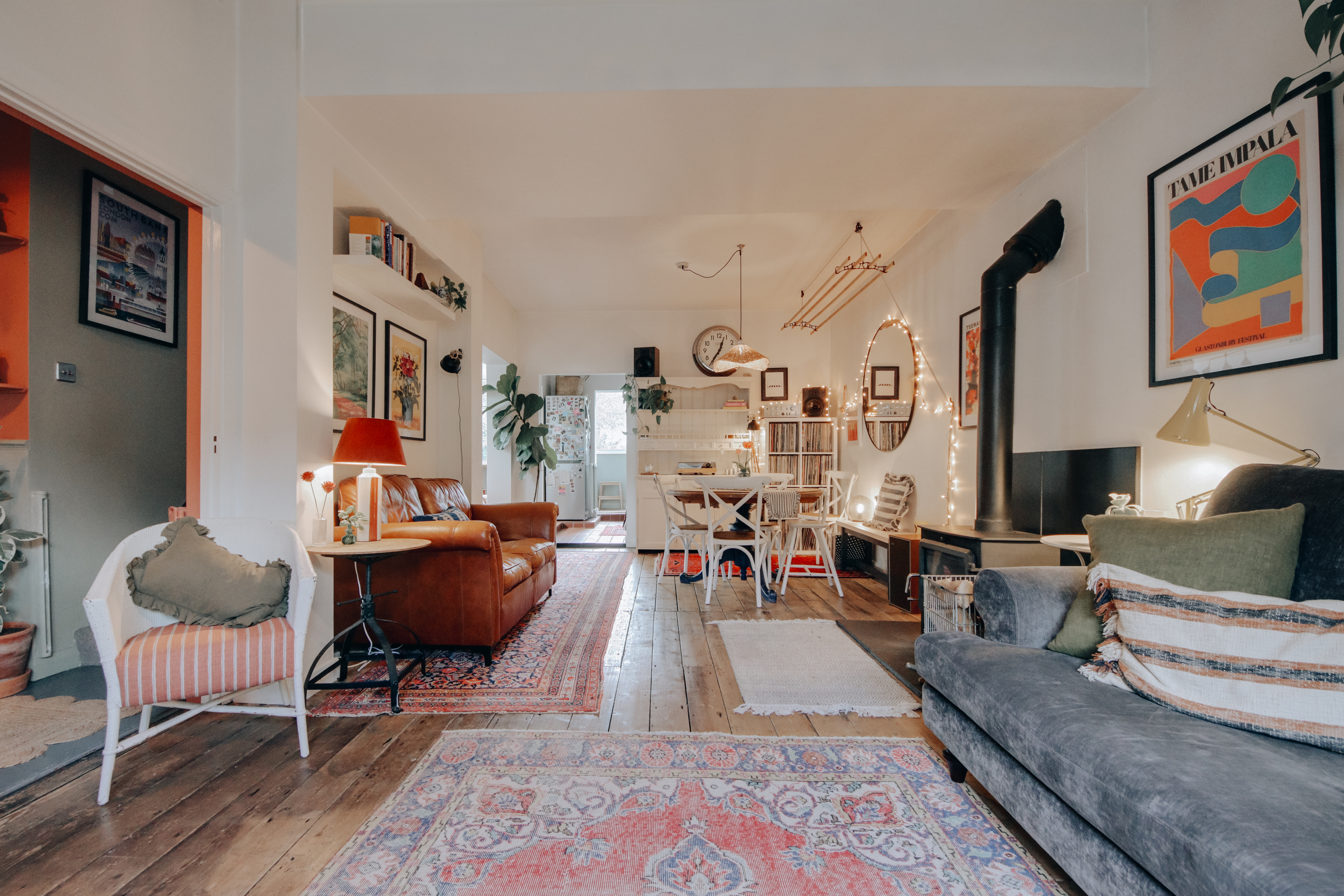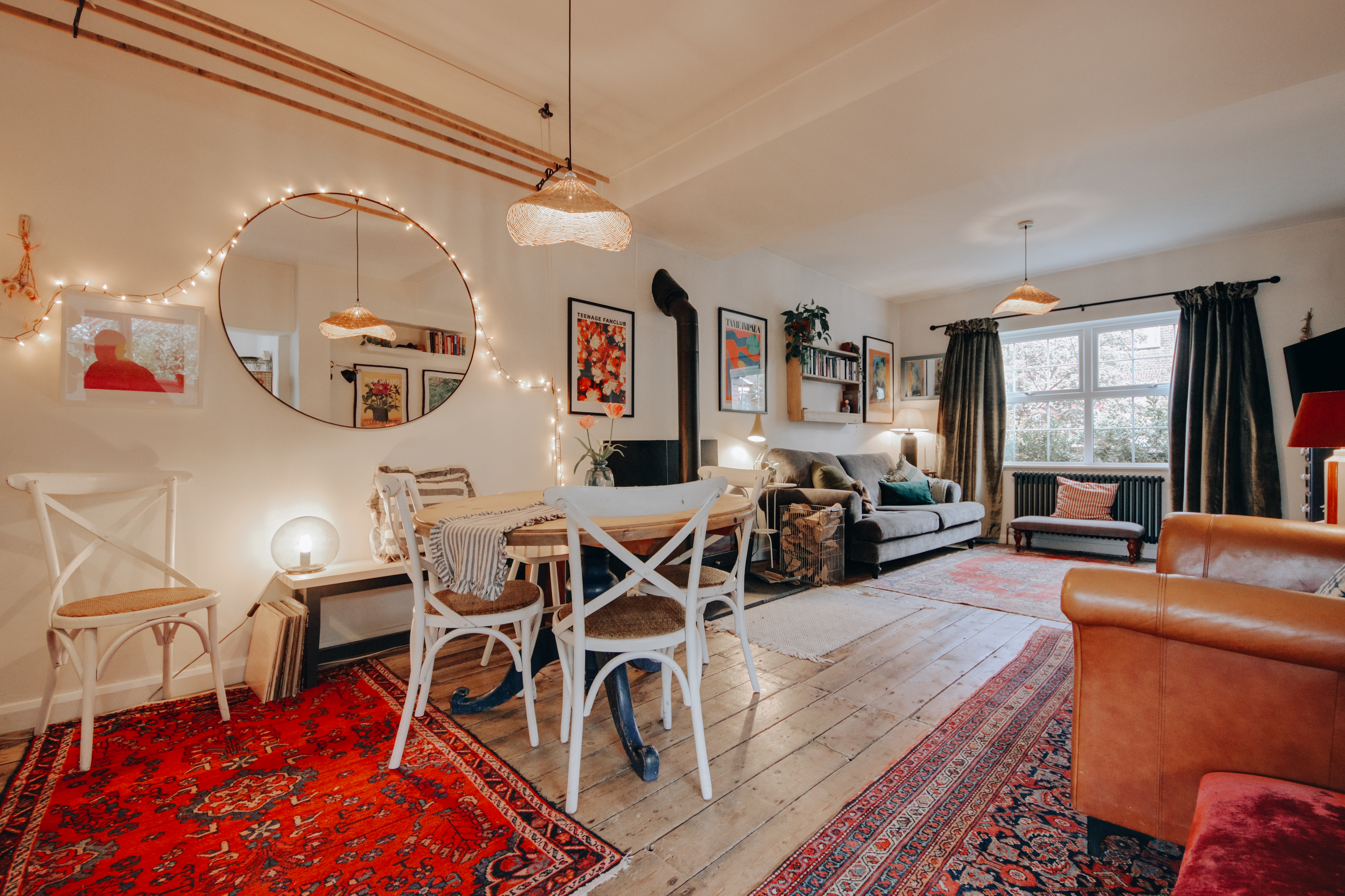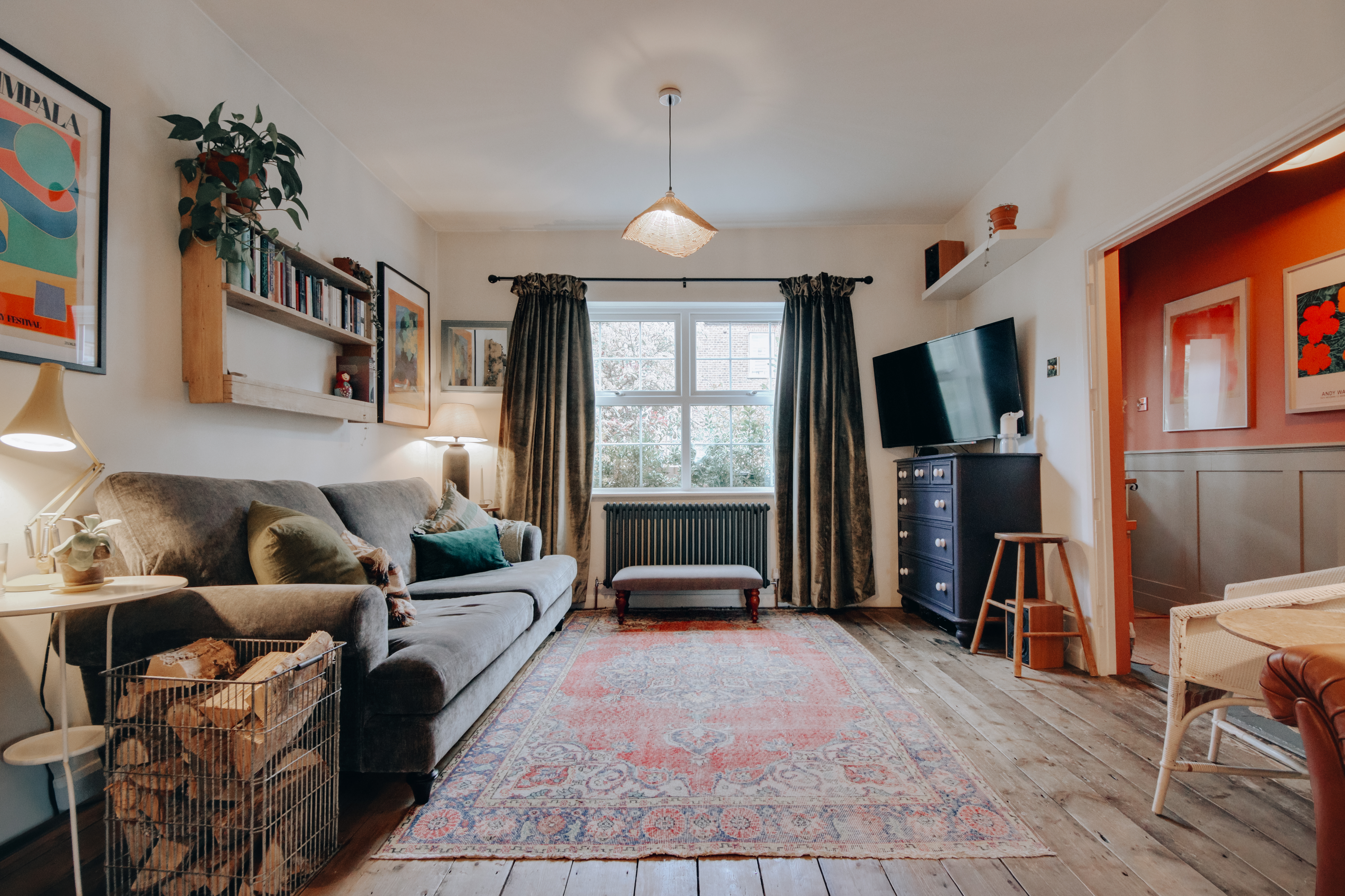Inside, the proportions surprise. The ground floor unfolds around a generous central hallway, with the snug to the left. At 17'3" x 12'2", deeply navy, Anatolian distressed rugs layered across neutral carpet and double doors dissolving the boundary between inside and out, it is the kind of room that slows you down, and that is entirely the point. To the right, the principal living space runs almost 24 feet, with a width that feels frankly improbable given the facade. Reclaimed floorboards, cast iron radiators and a log burner with exposed flue: this is a room that has been assembled over time, with intention, and it shows. Editorial without effort. The kitchen sits open to it but pulled into its own nook, housing a full suite of cabinetry and modern appliances with the kind of quiet functionality that does not ask to be noticed. Beyond, a utility room and a study defined by clean parallel lines bring the ground floor to a close, practical as it stands but holding the quiet flexibility to become a dining room, a second reception, or simply somewhere to sit with a coffee and a garden to look out over.