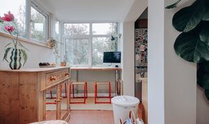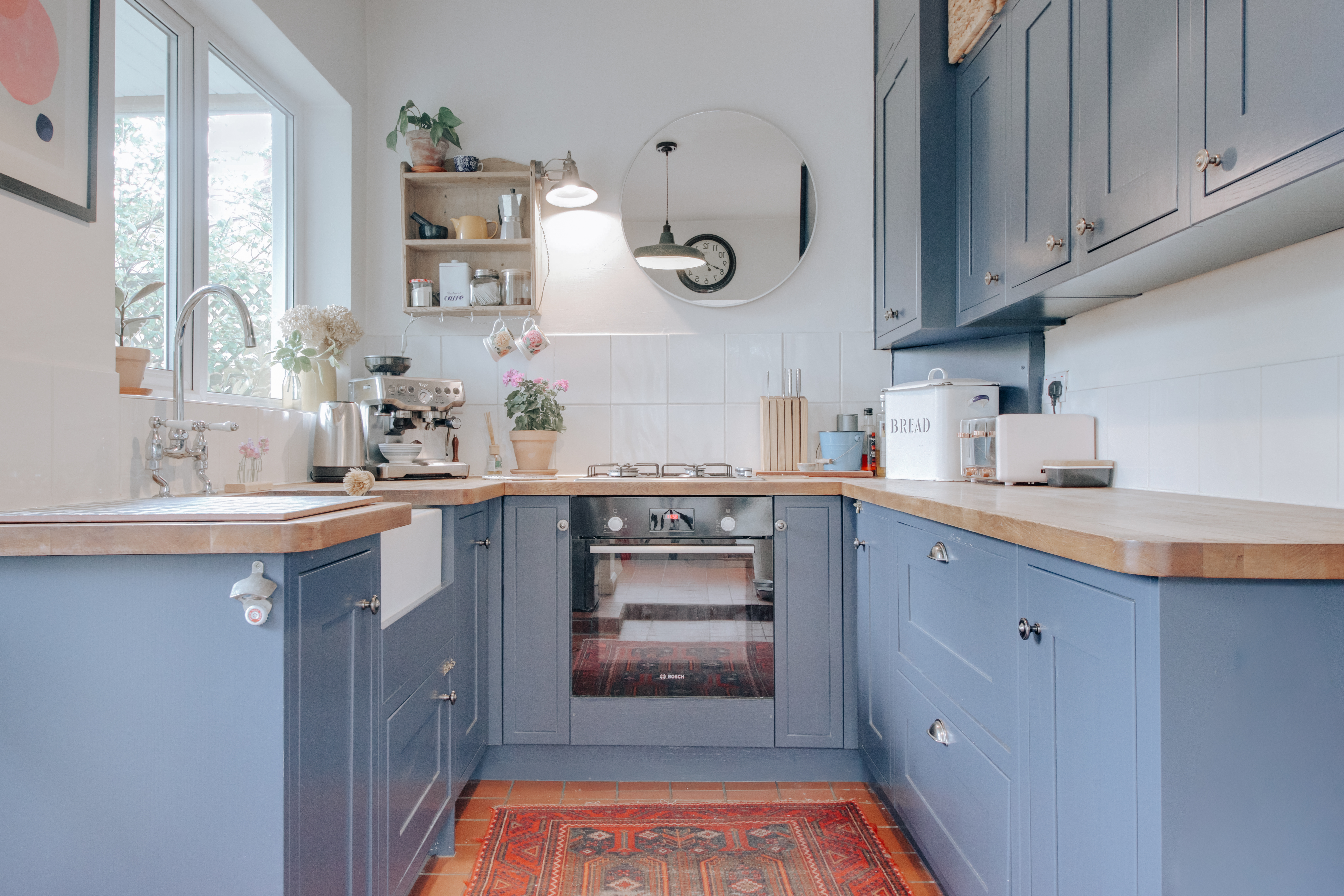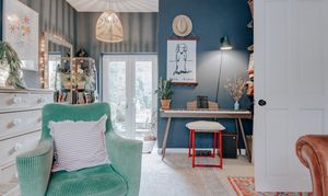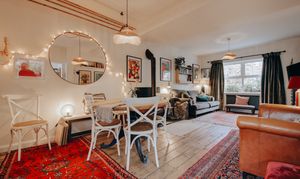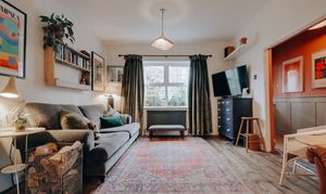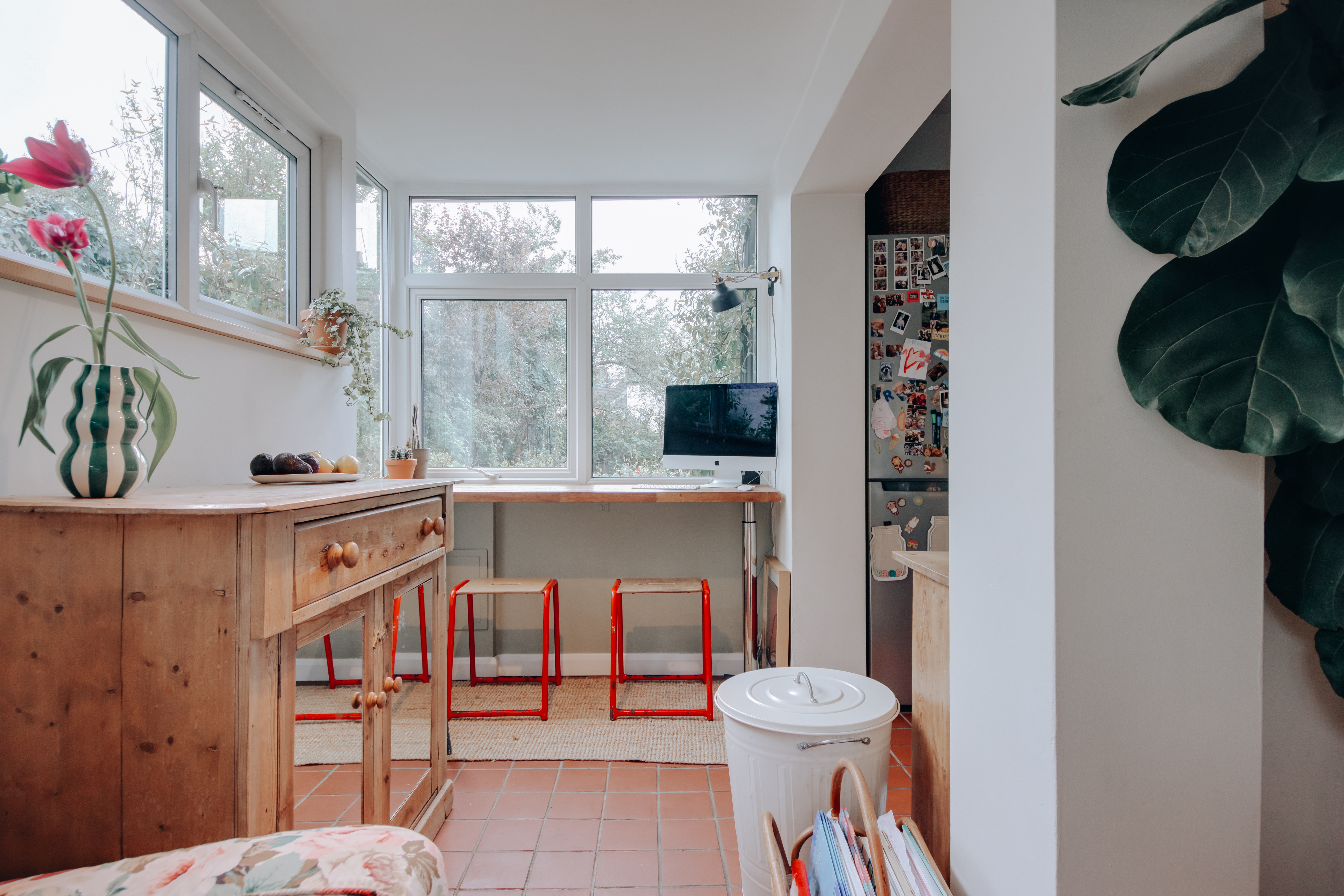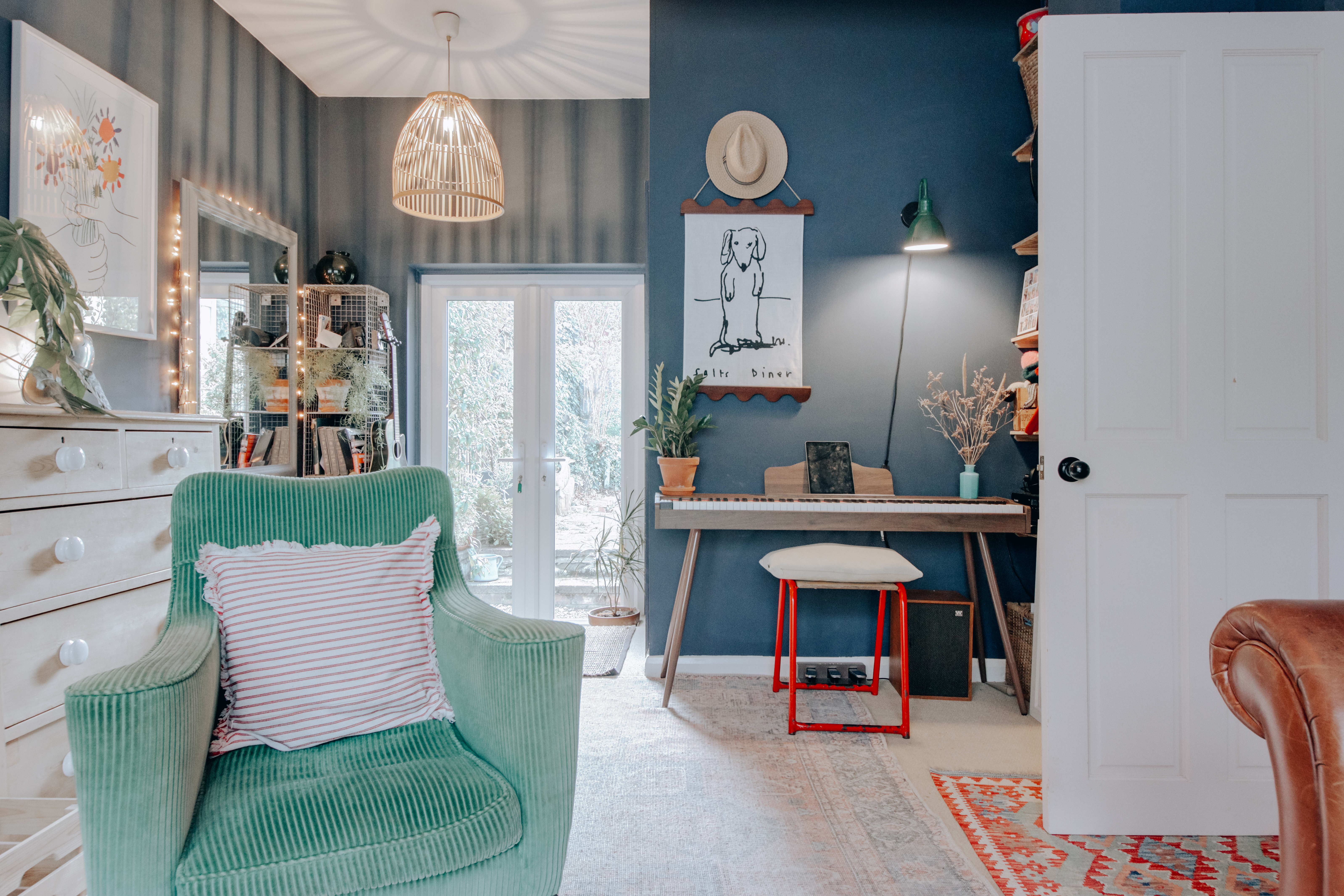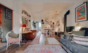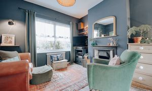 Inside, the proportions surprise. The ground floor unfolds around a generous central hallway, with the snug to the left. At 17'3" x 12'2", deeply navy, Anatolian distressed rugs layered across neutral carpet and double doors dissolving the boundary between inside and out, it is the kind of room that slows you down, and that is entirely the point. To the right, the principal living space runs almost 24 feet, with a width that feels frankly improbable given the facade. Reclaimed floorboards, cast iron radiators and a log burner with exposed flue: this is a room that has been assembled over time, with intention, and it shows. Editorial without effort. The kitchen sits open to it but pulled into its own nook, housing a full suite of cabinetry and modern appliances with the kind of quiet functionality that does not ask to be noticed. Beyond, a utility room and a study defined by clean parallel lines bring the ground floor to a close, practical as it stands but holding the quiet flexibility to become a dining room, a second reception, or simply somewhere to sit with a coffee and a garden to look out over.
