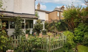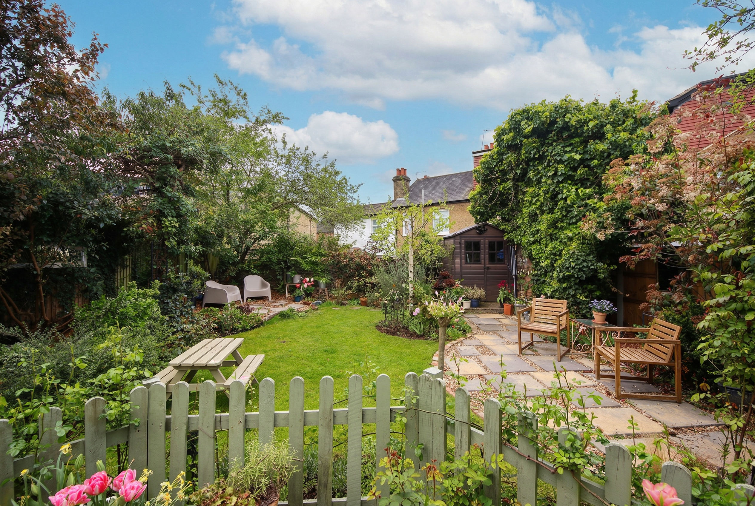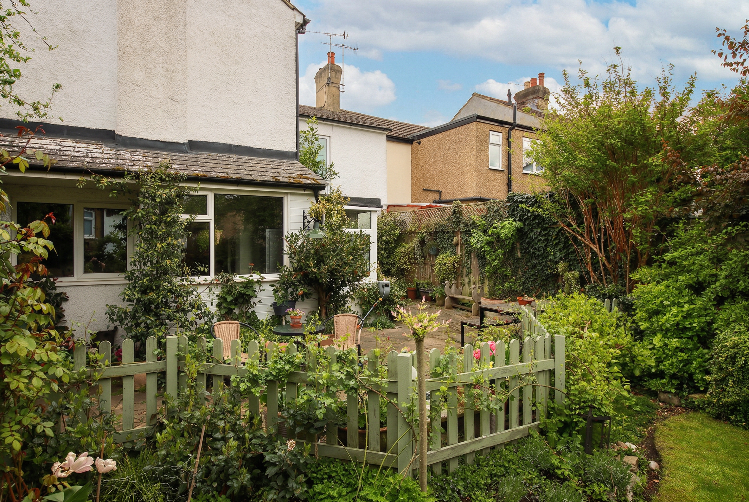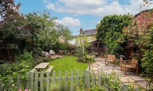 To the rear, a south-westerly garden that has been shaped with restraint and real thought. A levelled patio sits flush with the house and beyond, a gate opens onto a charming cottage garden: a well-maintained lawn framed by planting that softens the boundaries and gives the space a quiet, seasonal character. The kind of outdoor space that earns its place in every season.