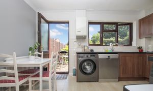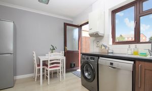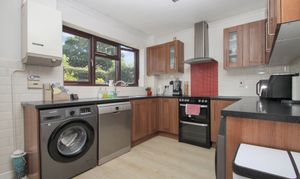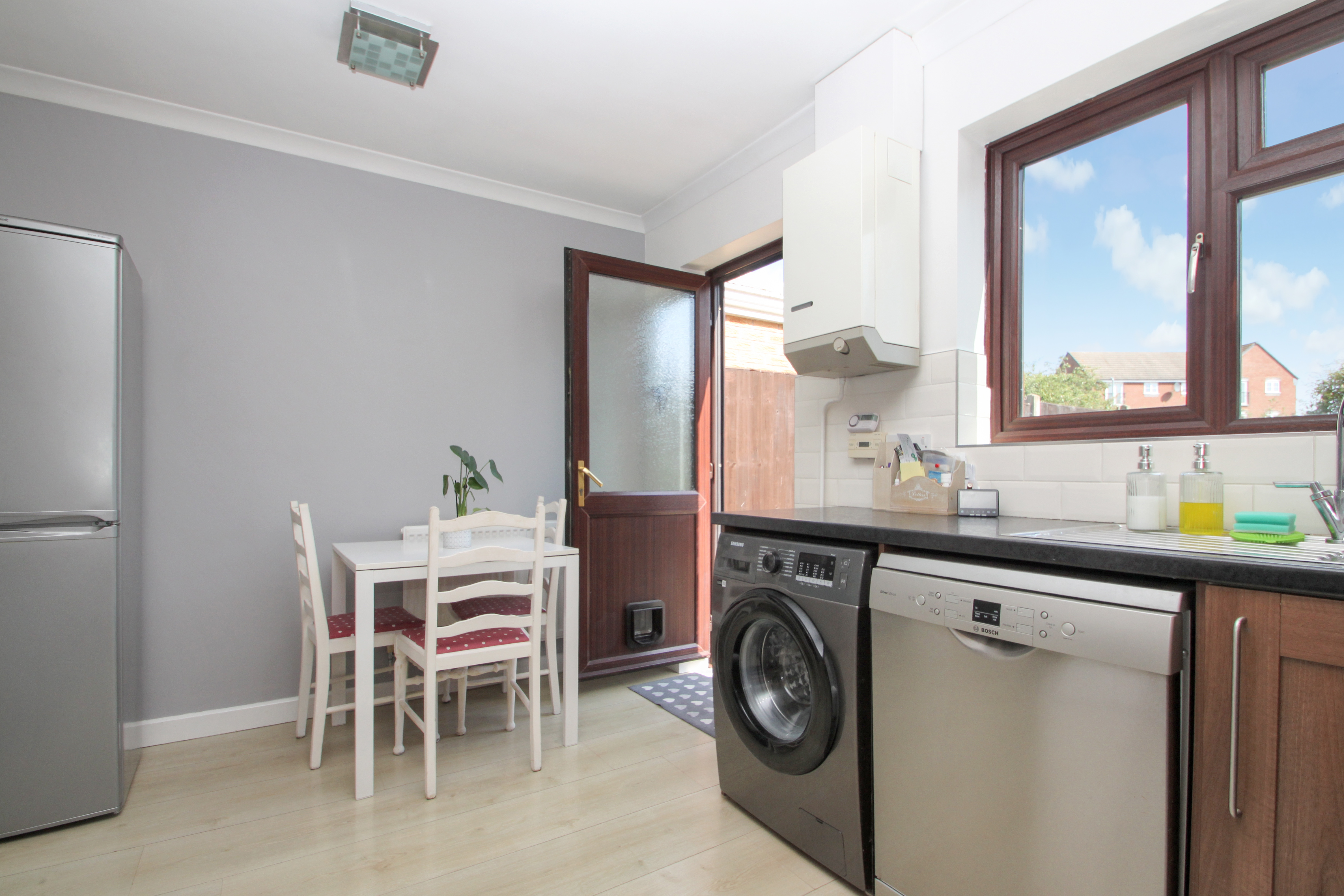 Having wood effect flooring, a range of wall and floor mounted units seated beneath a rolled edge work surface, space with plumbing for two appliances, space for one further freestanding under counter appliance, BRAND NEW wall mounted gas boiler, stainless steel sink with drainer, space for electric oven, stainless steel extractor hood, central heating radiator, upvc double glazed door providing access to the rear, and upvc double glazed window looking out over the rear garden.