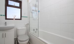 Having tiled flooring, wash basin with vanity unit, low-level button-flush toilet, bath with electric shower, stainless steel centrally heated towel rail, upvc double placed window with frosted glass, half tiled to most walls with full tiling to the bathing areas.