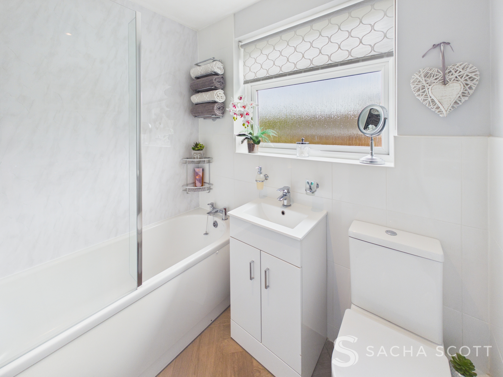 Beautifully presented, the family bathroom offers a shower over bath with screen, vanity sink with storage and a modern toilet.