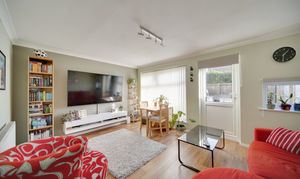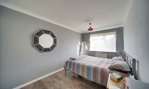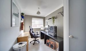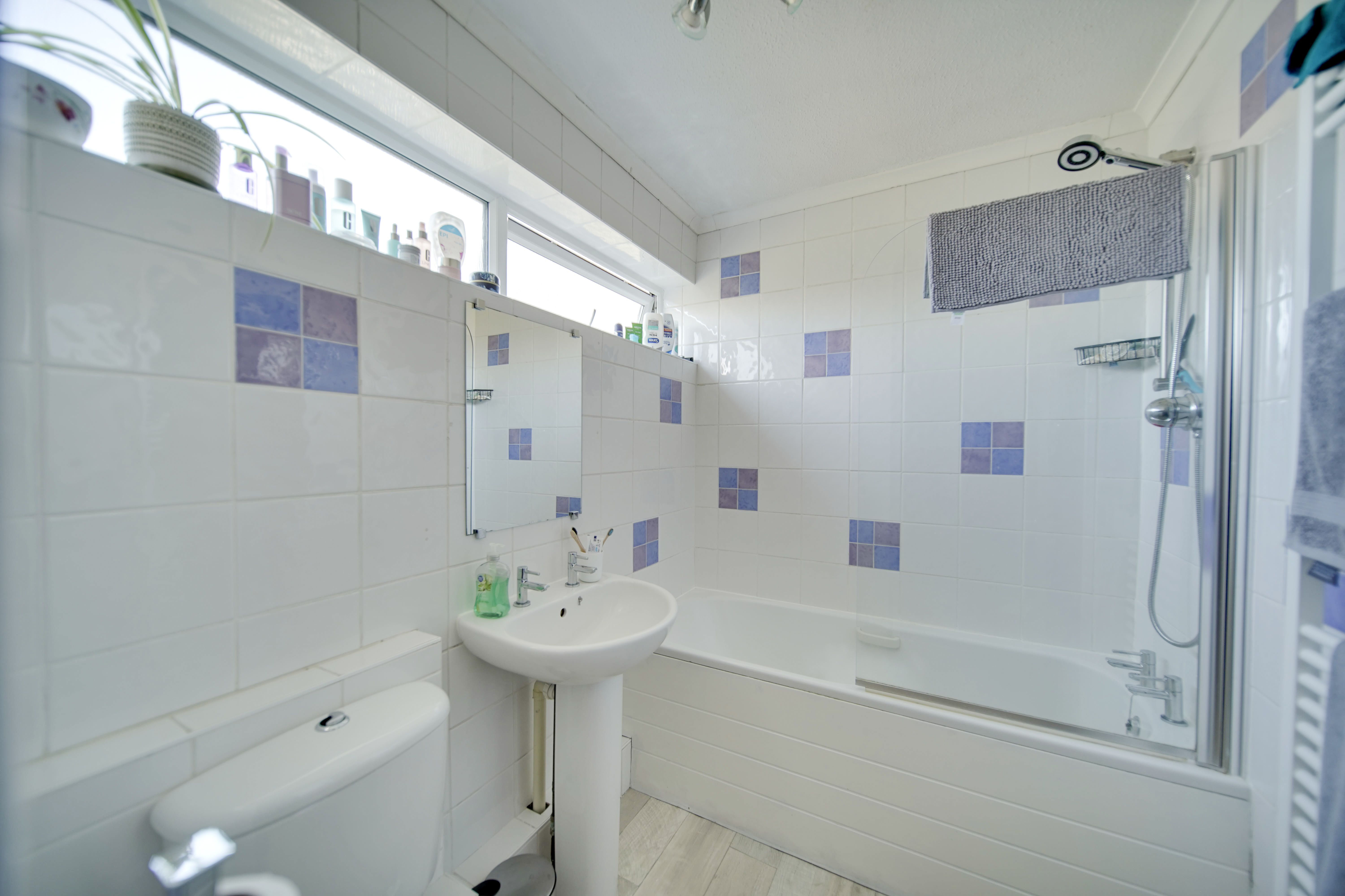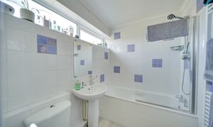 Upstairs, the landing provides access to the loft and an airing cupboard. The main bedroom overlooks the rear garden and features contemporary flooring and a radiator, while the second bedroom also enjoys a rear aspect, built-in storage cupboard, wood-effect flooring and radiator. The bathroom is fitted with a modern white suite comprising a panelled bath with shower over and glass screen, pedestal wash hand basin and low-level WC, with fully tiled walls, vinyl flooring, radiator and high-level double-glazed window.