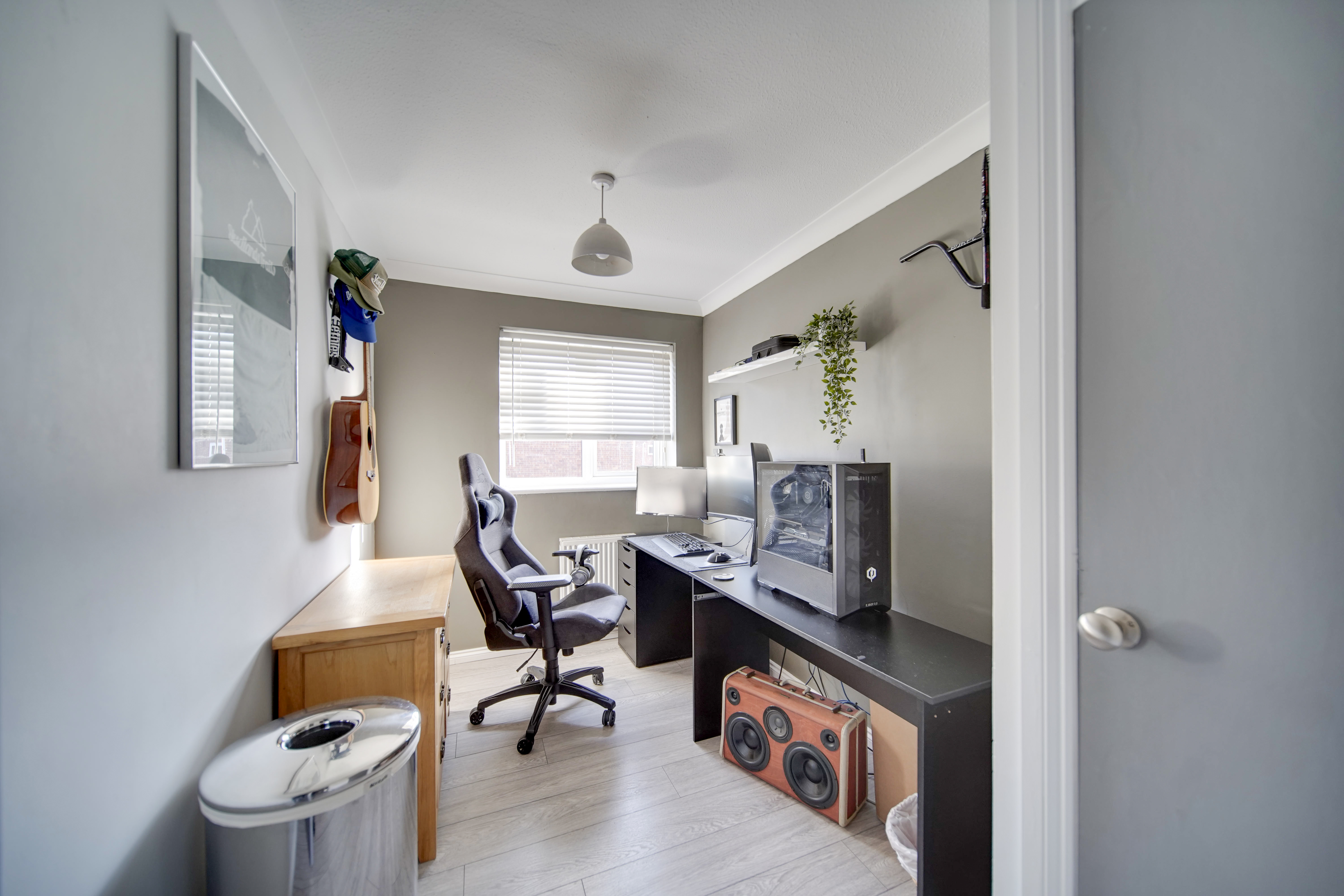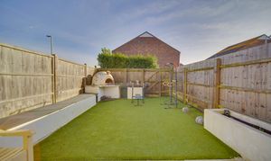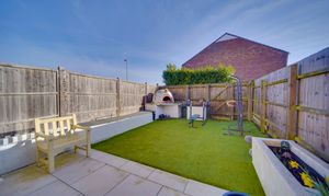Outside, the front garden is enclosed and laid mainly to lawn with a path leading to the front door and pleasant views over green space. To the rear is a fully enclosed garden with a patio area ideal for outdoor dining, artificial lawn, a pizza oven and a selection of planted containers with shrubs and flowers.