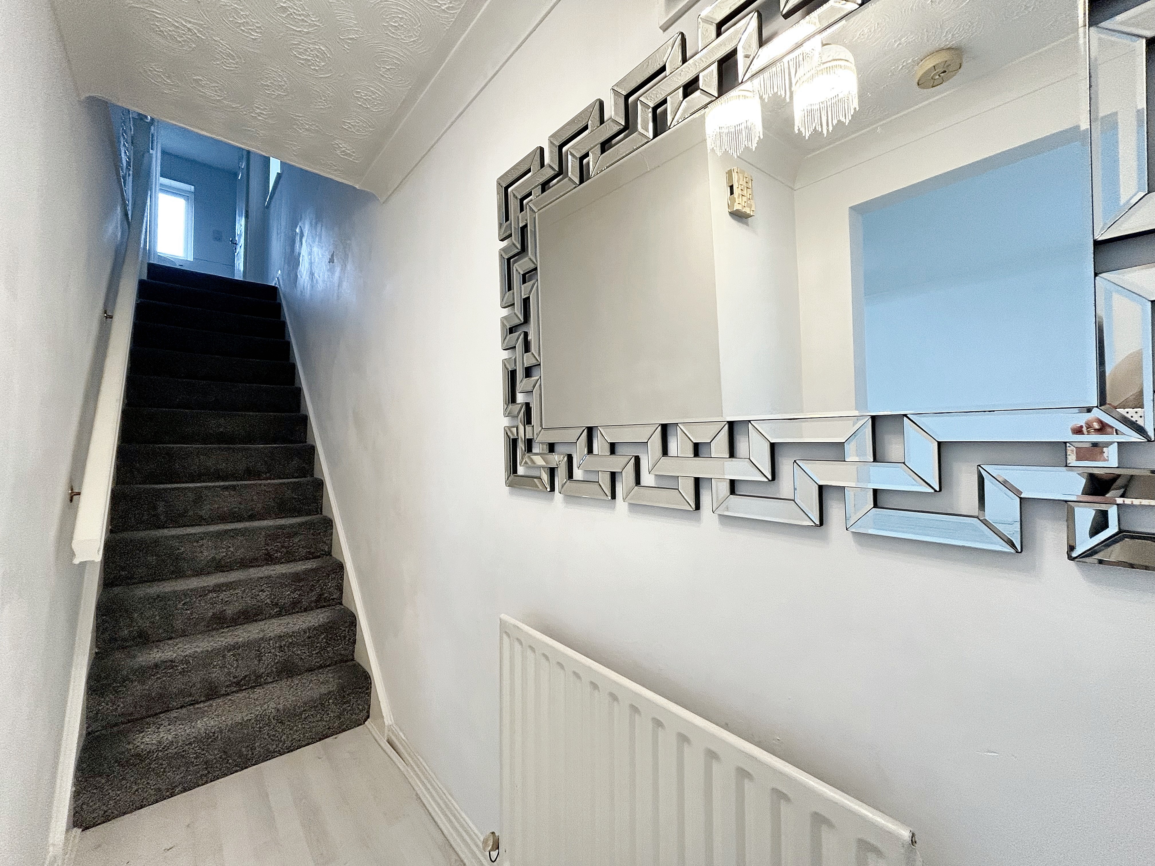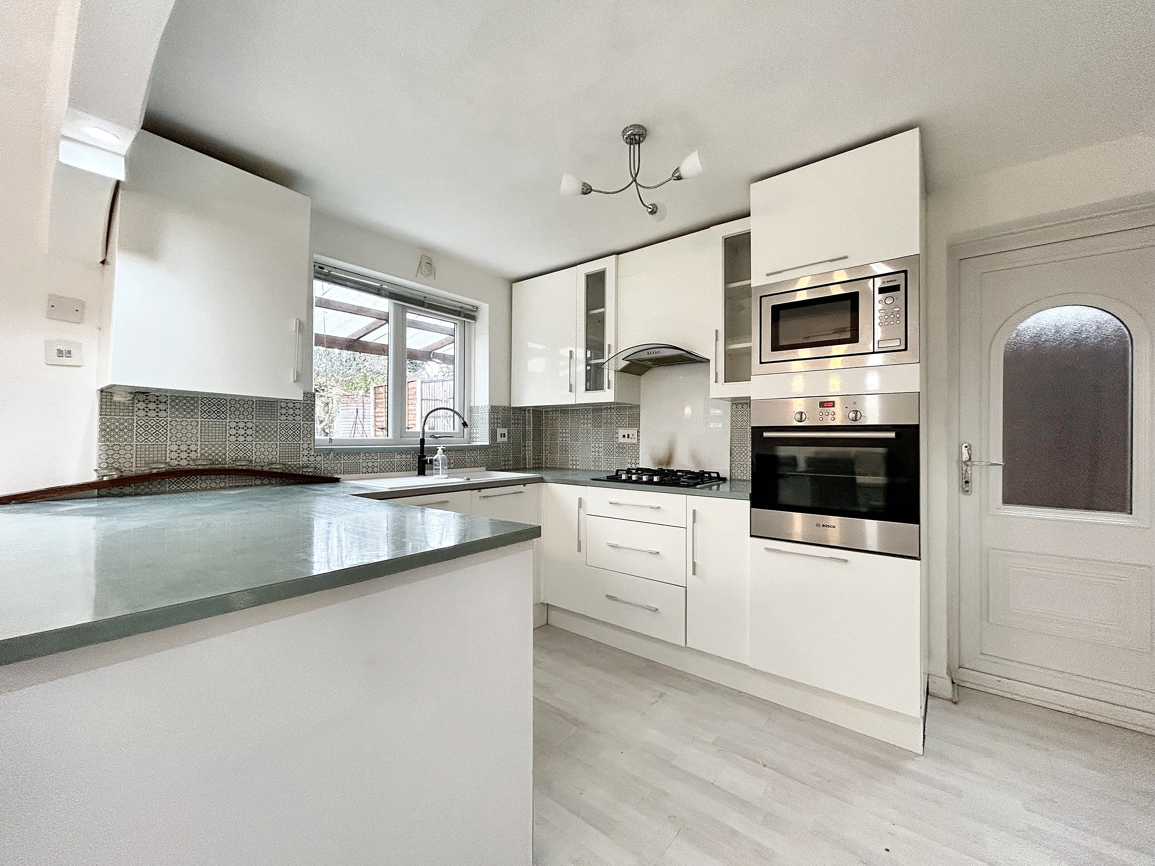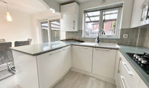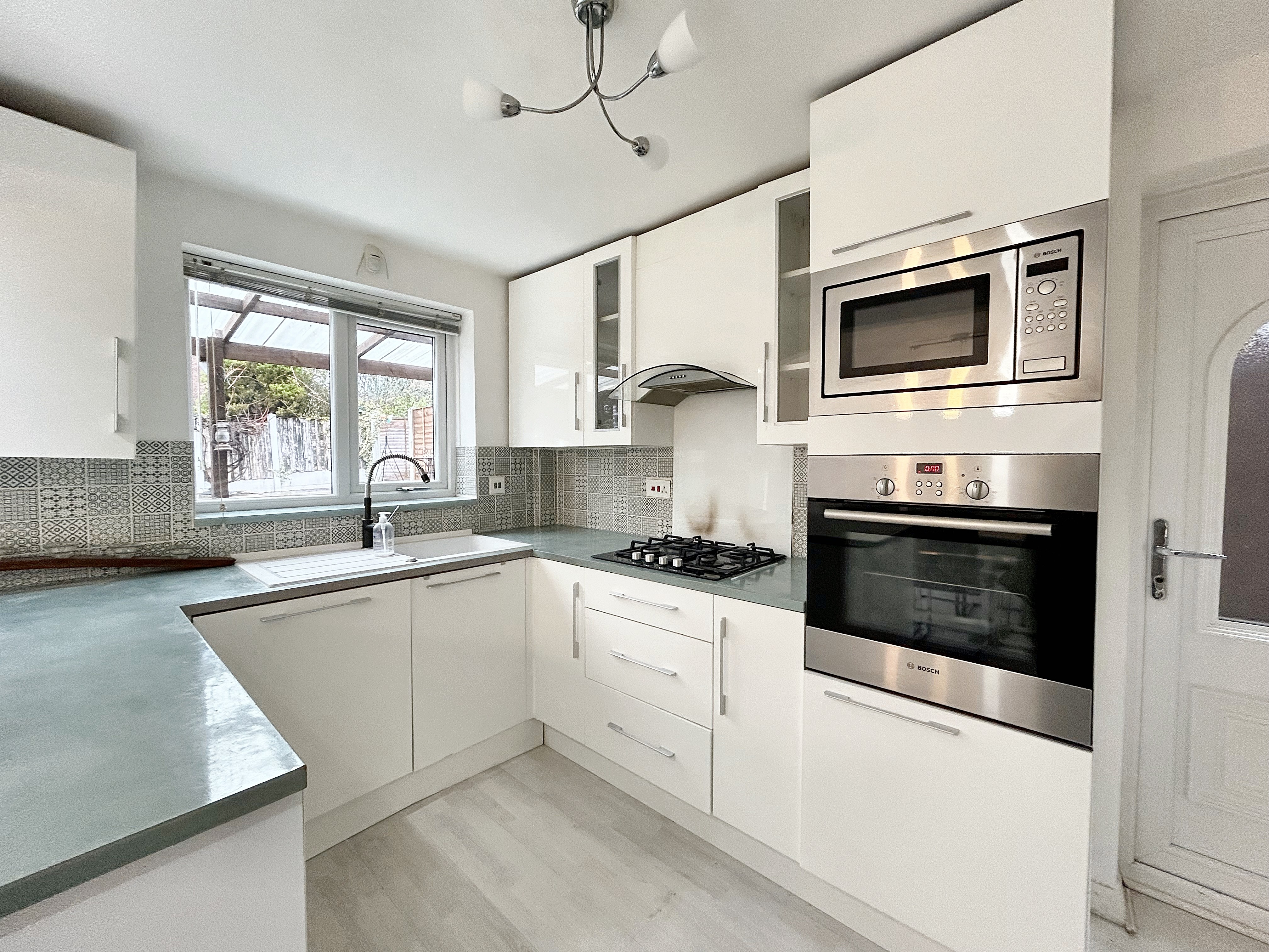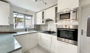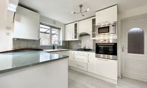 Window to rear elevation. Range of modern wall and base units. Fitted with integrated appliances which include; oven, microwave, gas hob, extractor, dishwasher and washing machine. Internal door to under the stairs storage area. External door to rear elevation.