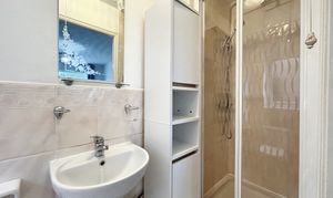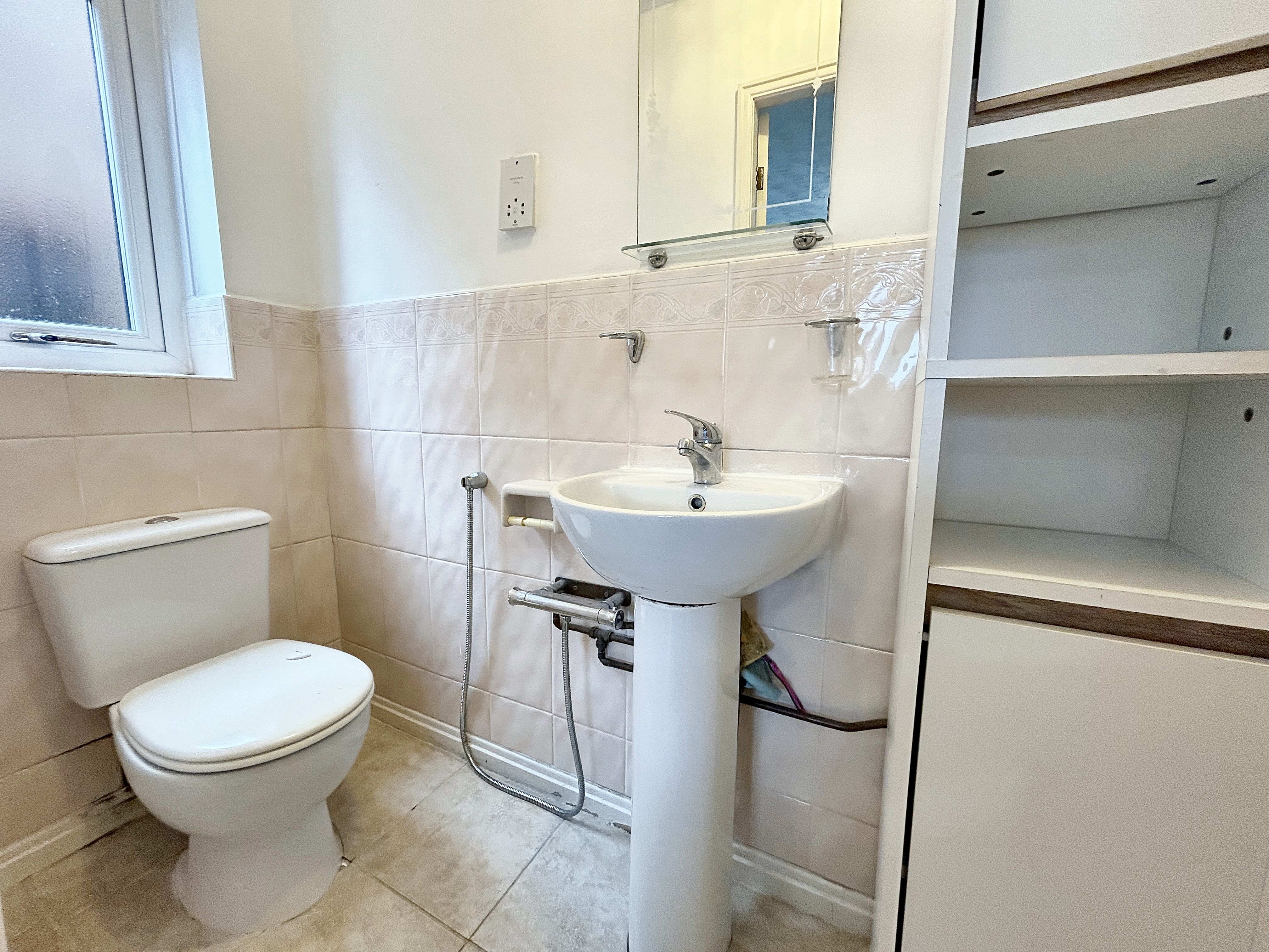 Window to side elevation. Part tiled walls and tiled floor. Fitted with low-level W.C, Pedestal hand wash basin and shower.