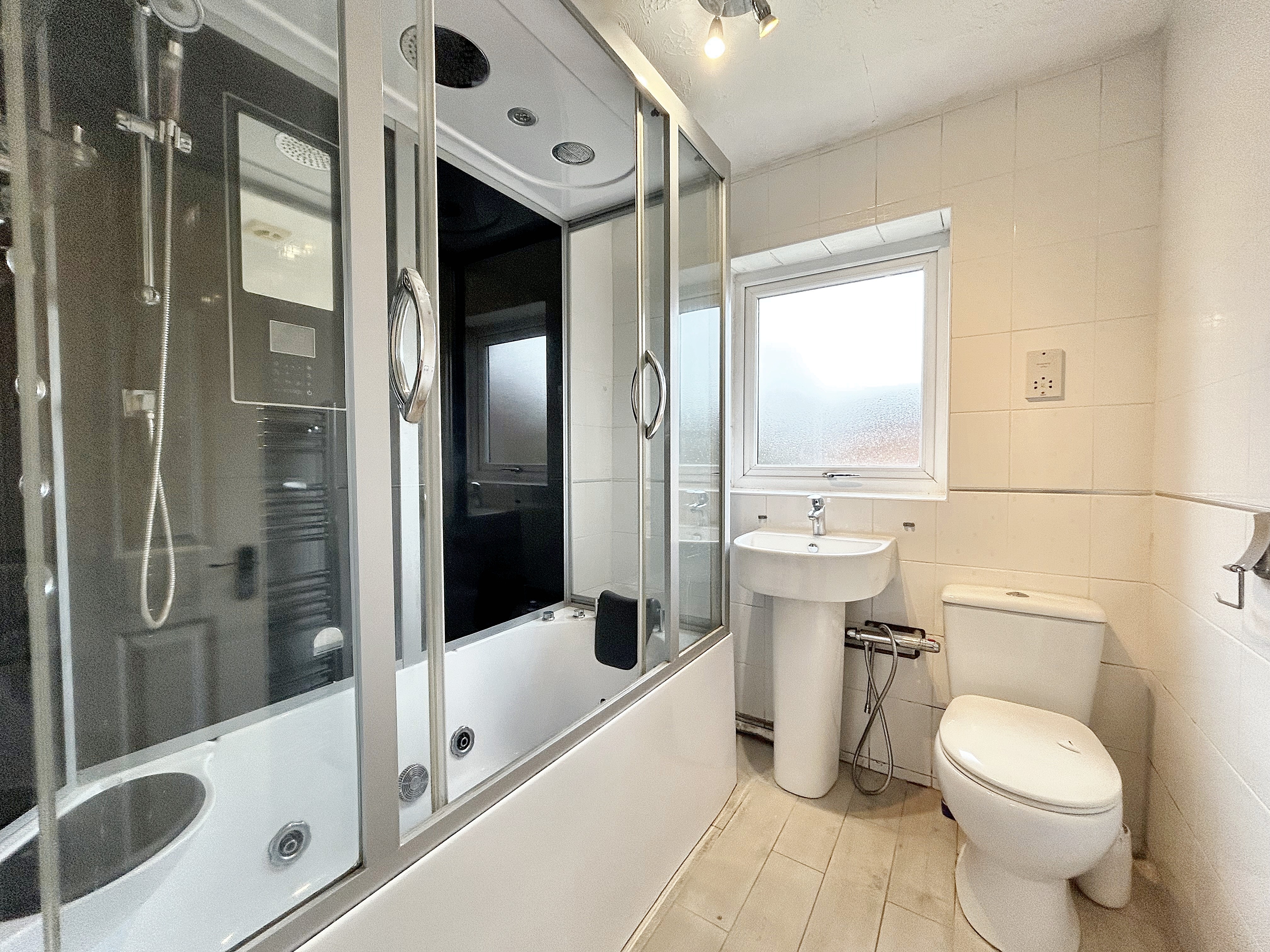 Window to rear elevation. Fitted with low-level W.C, pedestal hand wash basin, cubicle bath with shower over.