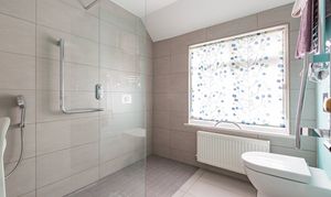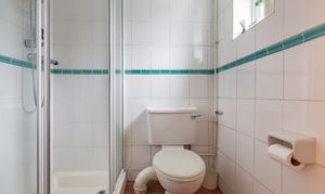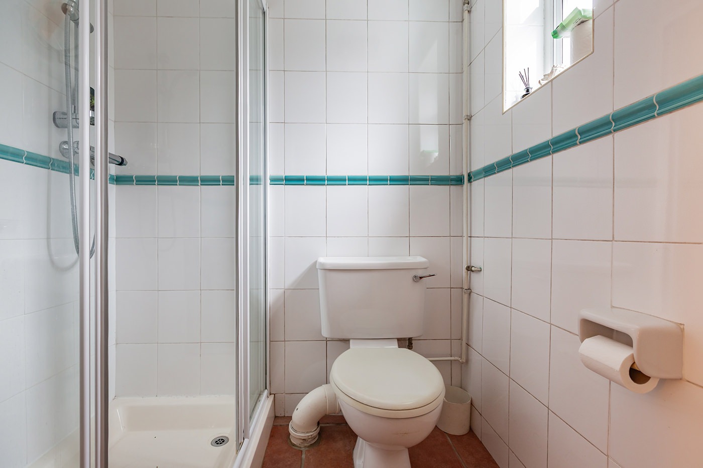 Low level wc, wash hand basin, tiled shower cubicle, obscured window to side, locally tiled walls.