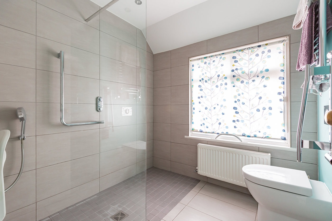 Low level wc, wash hand basin with mixer tap, walk in shower, locally tiled walls, obscured window to rear, towel radiator.