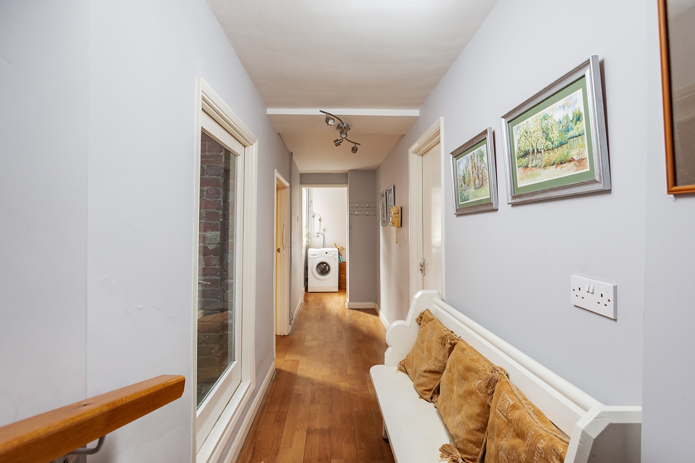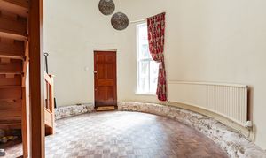 With understairs recess, stairs leading to first floor, external door, plumbing for washing machine and window to rear.