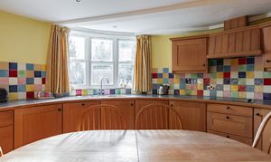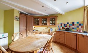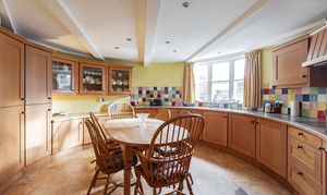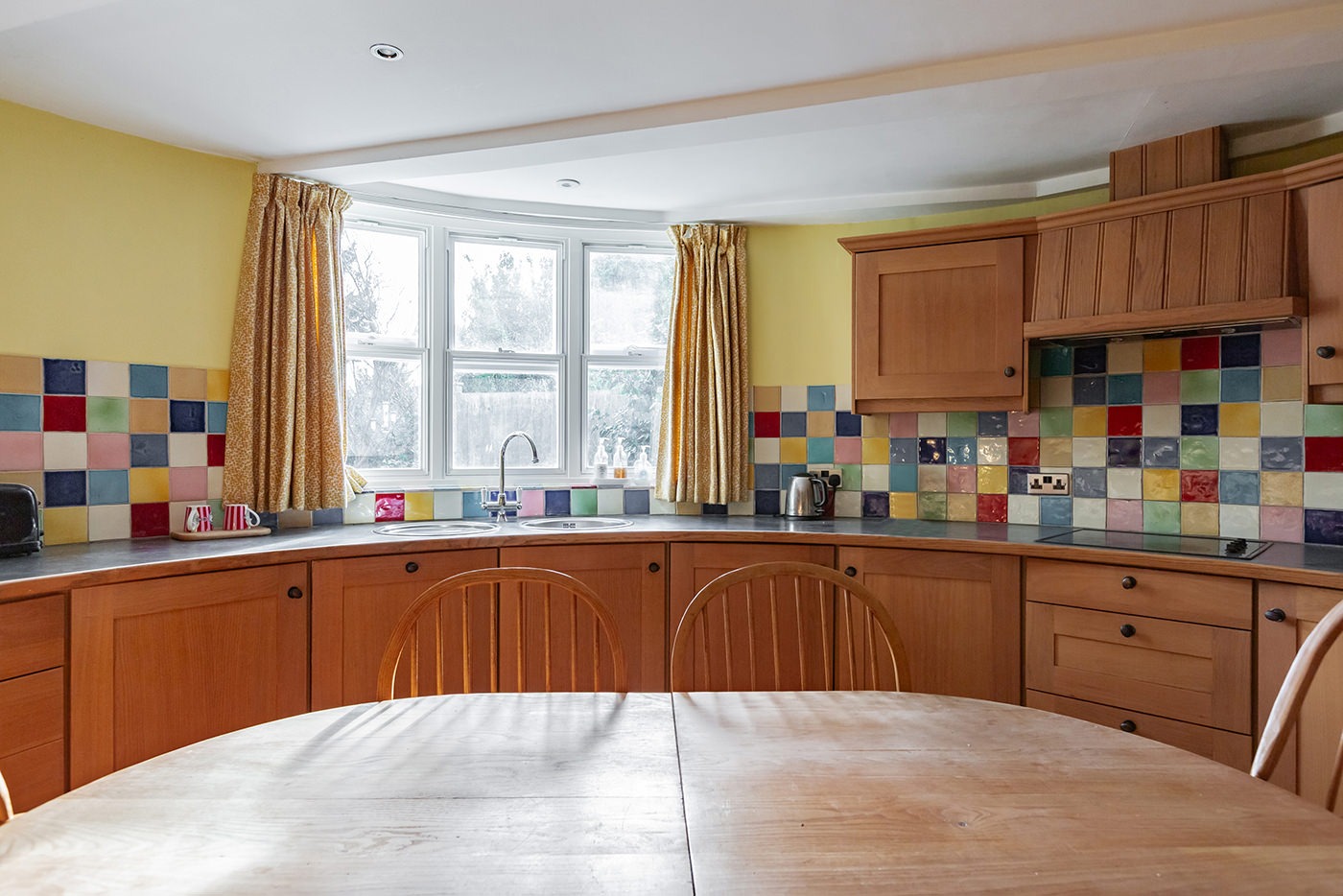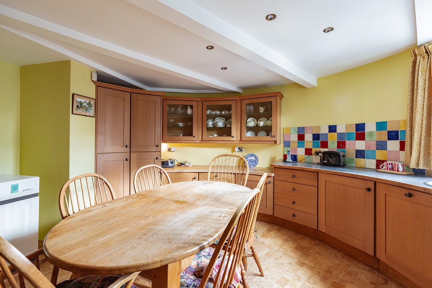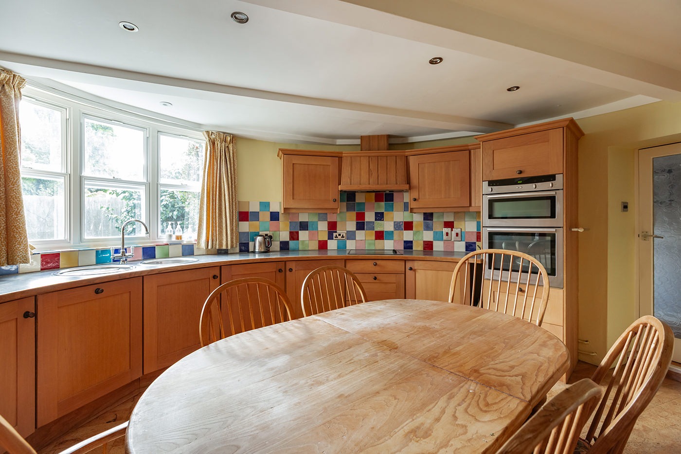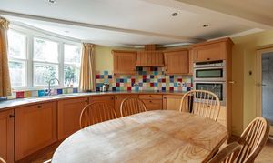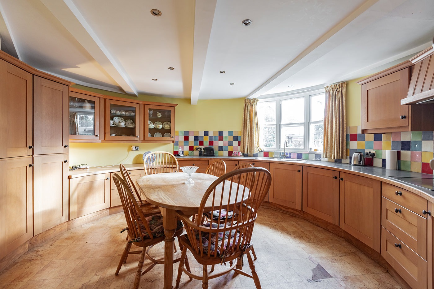 Positioned in one of the roundels, with handmade solid kitchen units beneath works surfaces and additional wall mounted units including display units, window outlook to rear, inset spotlights, floor mounted boiler, inset spotlights, electric hob with extractor fan over, double eye level oven, locally tiled walls, integrated fridge, sink with mixer tap.