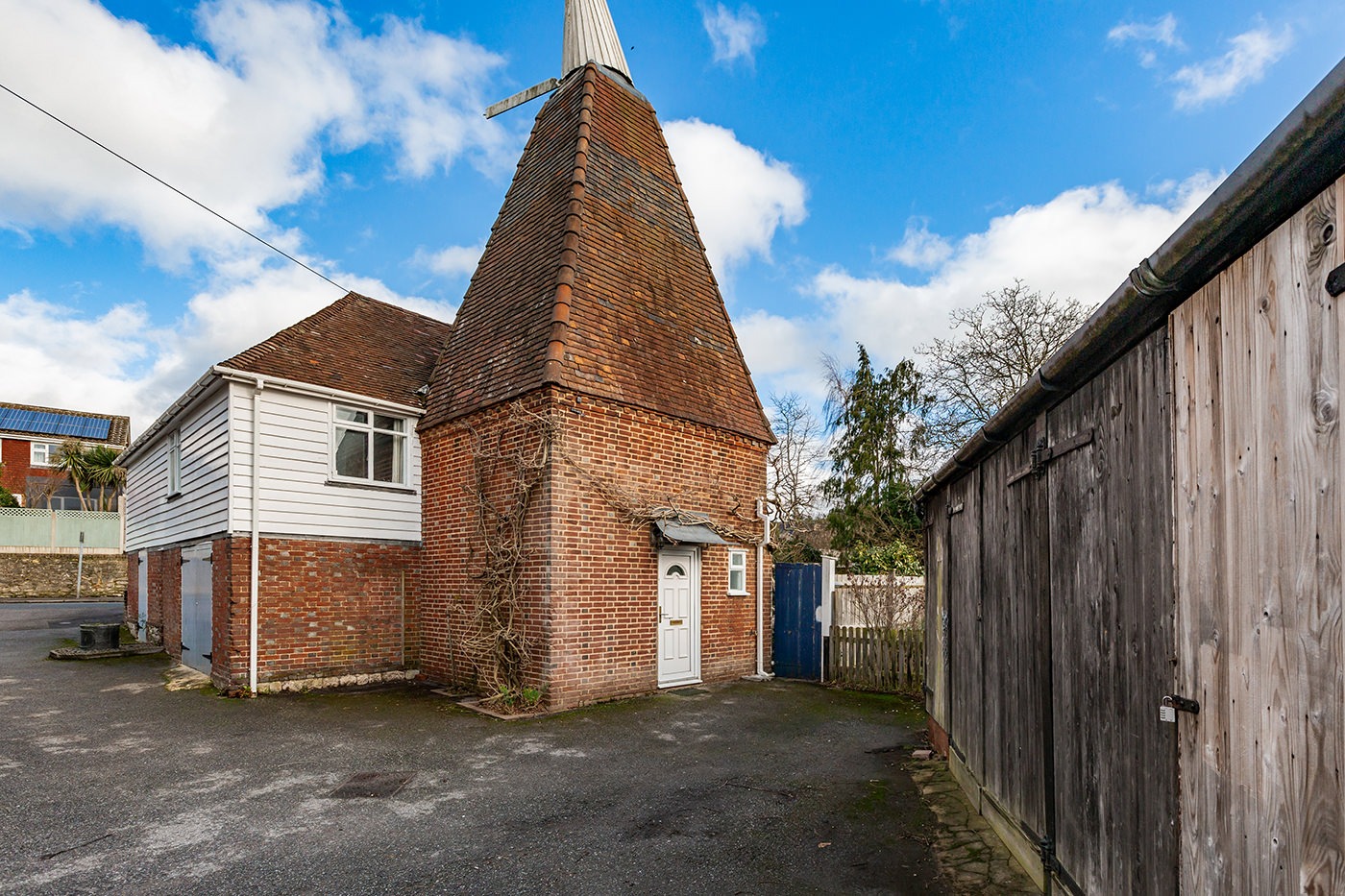 This remarkable four-bedroom detached Oast House and barn conversion presents a rare opportunity to acquire a truly unique residence in the heart of Barming village. Remaining in the same family for over 55 years, this Grade II listed Oast house conversion is offered to the market with no onward chain, making it an attractive prospect for discerning buyers seeking a property with character and potential. The triple Oast configuration, featuring two distinctive roundels, provides a striking architectural focal point, while the expansive interior offers versatile living accommodation ideally suited for family life. The ground floor comprises a welcoming entrance hallway, a well-proportioned kitchen, and a convenient shower room. Upstairs is the wonderful lounge and four generously sized bedrooms complemented by a second shower room, providing flexibility for modern family requirements. The property offers scope for careful restoration and sympathetic remodelling (subject to Grade II listing consent), with the potential to incorporate the existing garage and store room into the main residence if desired. Throughout the home, period features and original details are evident, reflecting the care and pride with which the property has been maintained. Located within walking distance of Barming Primary School and benefitting from excellent transport links, this home represents a wonderful opportunity to secure a piece of local history in a highly sought-after setting.