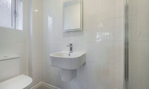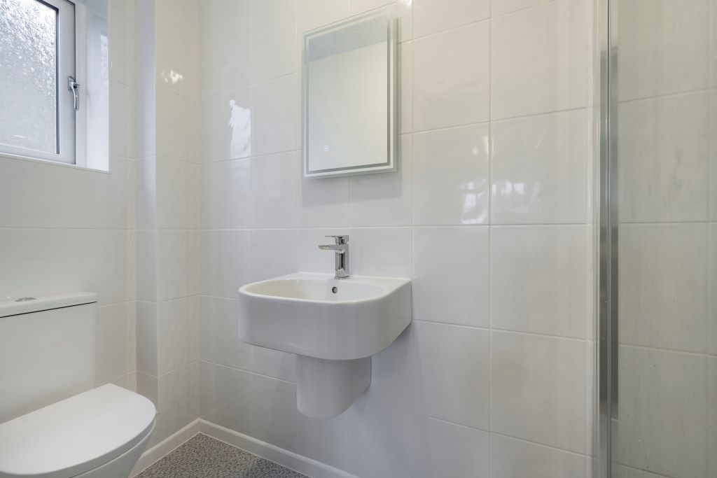 The newly fitted ensuite is glossy and polished with pristine white tiling, an immaculate shower cubicle and designer towel rail, all that is needed is some fluffy towels.