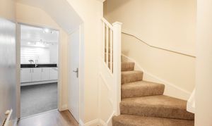 On entering the navy-blue front door, you are welcomed into a hallway with a useful cupboard for shoes and coats and a pleasant cloakroom for guests.