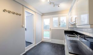 The contemporary Wren kitchen can be accessed from the dining room and hallway, re-fitted in 2021 with a harmonious black and white theme. The tasteful white cabinetry, including two larders, contrasts with the flecked black quartz countertops and premium slate grey vinyl flooring. While washing up at the integrated sink, sun beams in from the southwest facing garden and a day/night blind has been fitted. A focal breakfast island for food preparation and morning breakfast completes the look.
