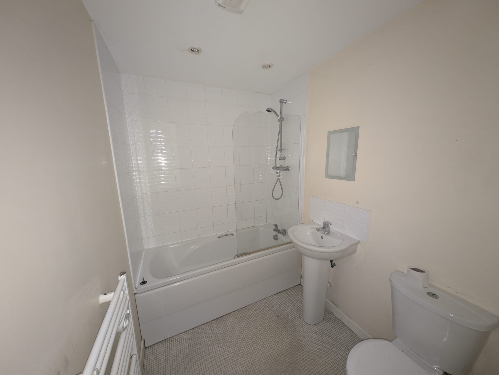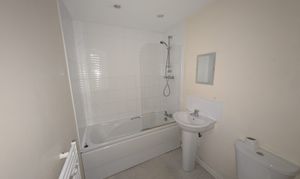 Low level flush toilet, hand wash basin and panel bath with fitted shower head with shower screen. Part tiled walls and towel radiator.