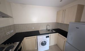 Base and wall units for storage with contrasting work surface. Space for a washing machine and space for a fridge/freezer. Integrated cooker and electric hob.