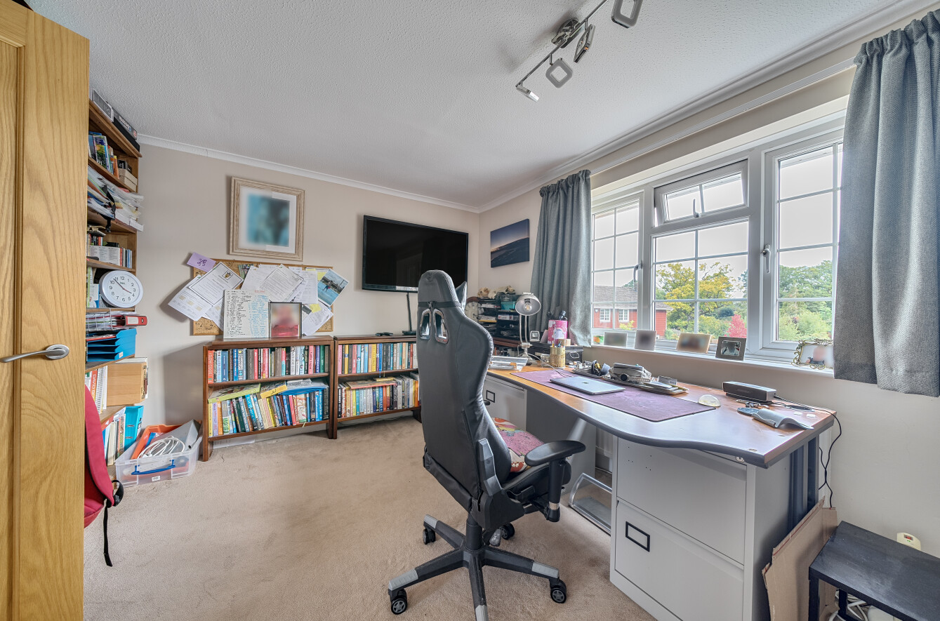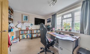 The welcoming hallway provides access to the downstairs cloakroom, study, stairwell to the first floor, dining room, kitchen and sitting room. The study is an ideal space for those working from home. The dining room is a lovely bright space with plenty of natural light. Sliding doors lead into the conservatory which, with fitted blinds and heating, can be enjoyed all year round. The kitchen is fitted with shaker-style units with complementing marble-effect worktops and finished with modern tiling. Appliances include a split-level double oven, induction hob with extractor over, and integrated dishwasher. The utility room provides space with plumbing for a washing machine; an external door makes this ideal as a boot room. The sitting room, to the front of the property, has a feature fireplace and bay window with views across the front garden.