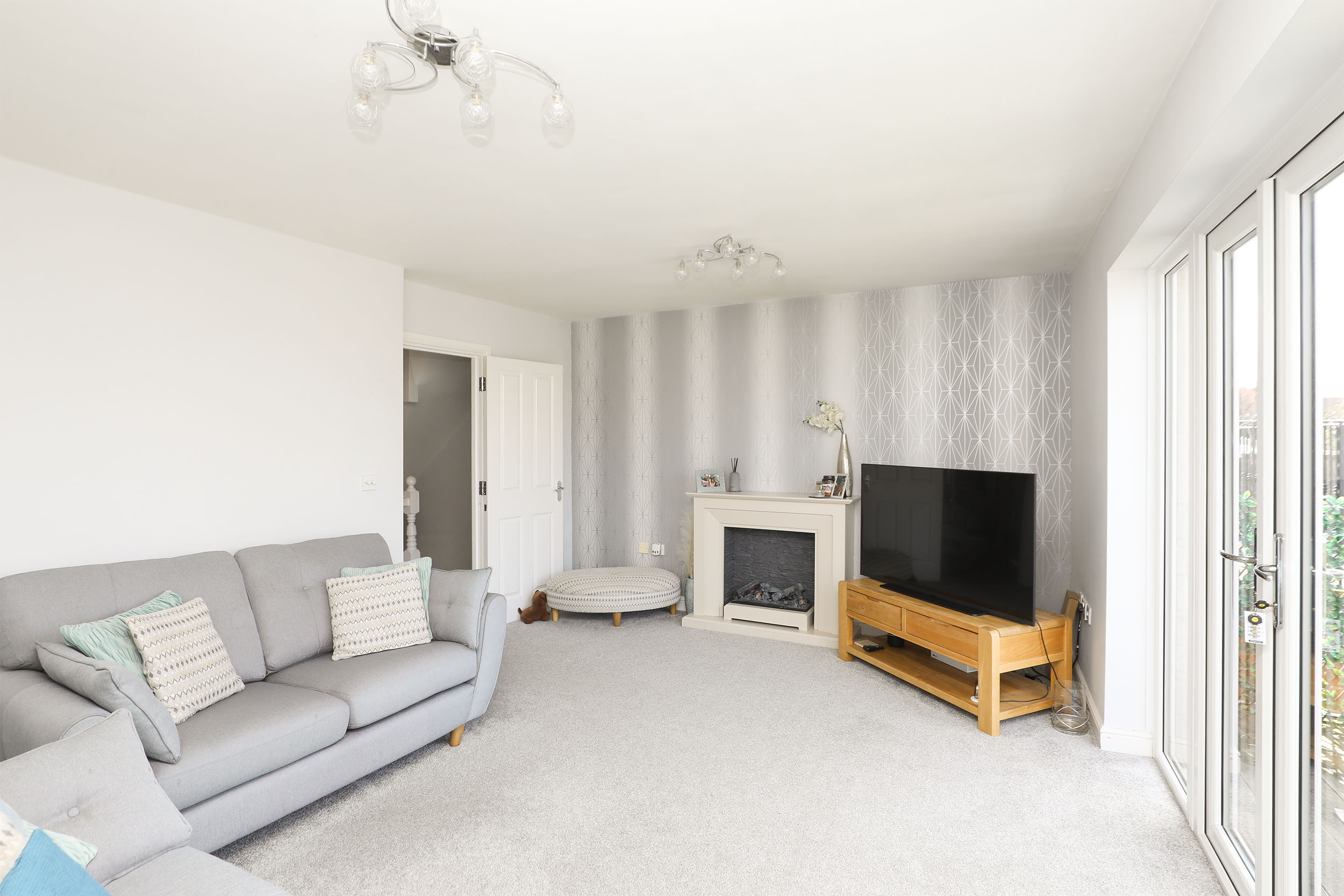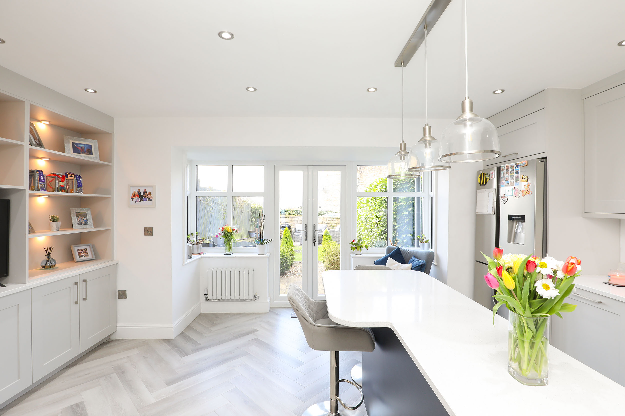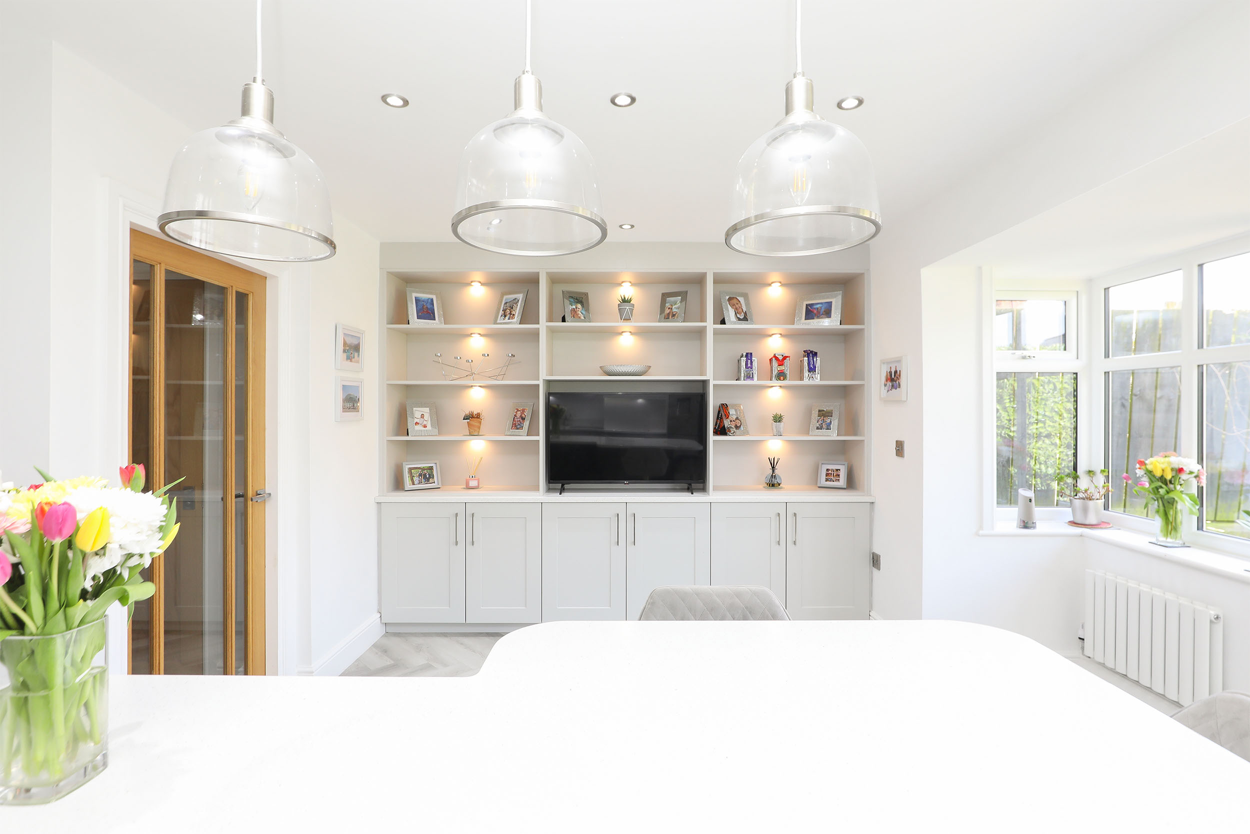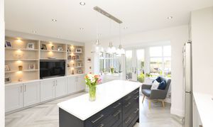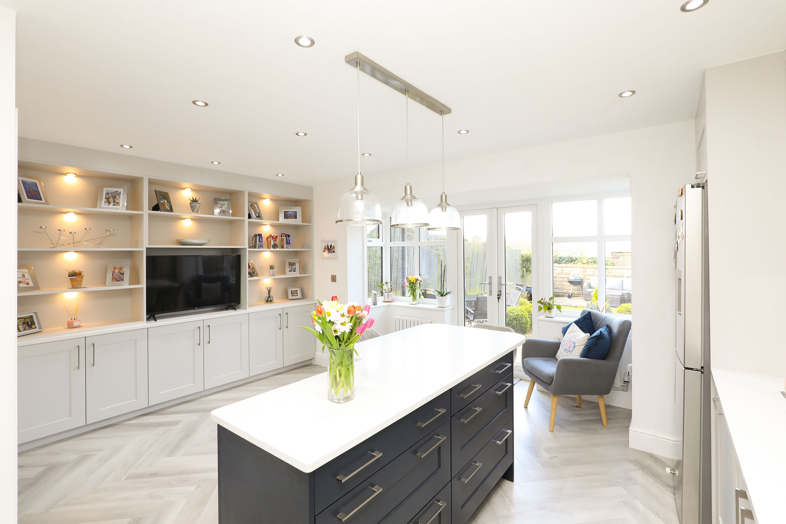 A light and airy entrance hall provides an impressive welcome, leading through to a stunning kitchen and dining space that truly forms the focal point of the home. Beautifully finished with careful attention to detail, the bay-windowed room features a comprehensive range of integrated appliances, sleek granite work surfaces, and a striking central island. Designed with both everyday living and entertaining in mind, the space is further enhanced by doors opening onto the rear garden and a contemporary media wall, creating a sociable and visually impressive environment.