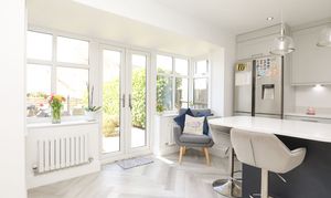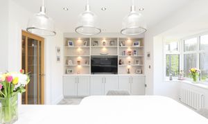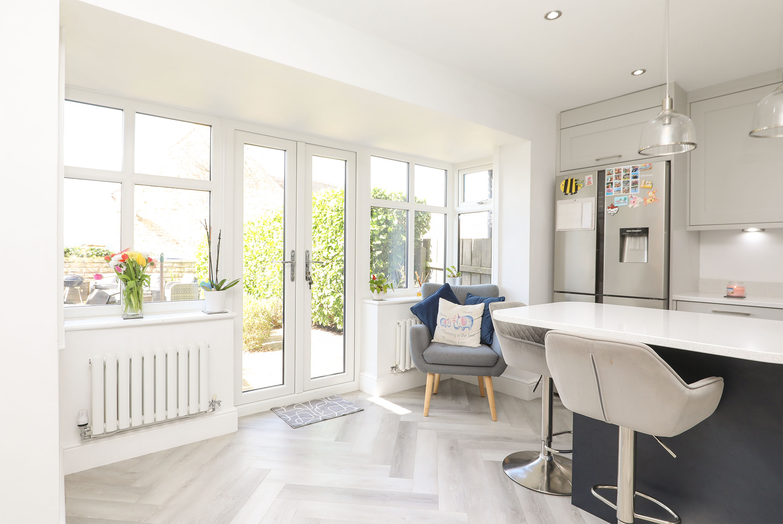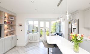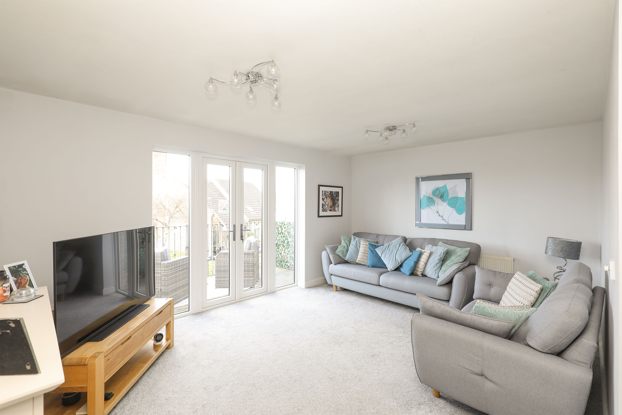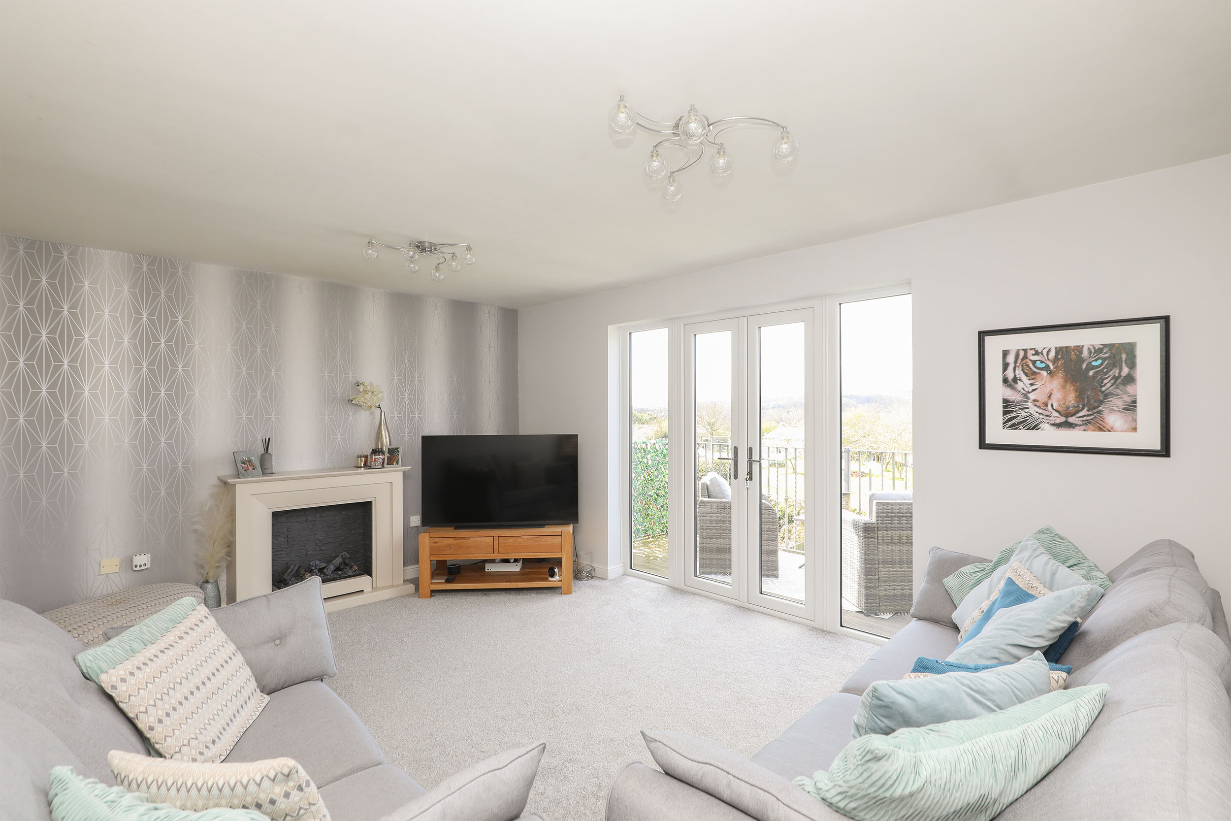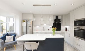 A light and airy entrance hall provides an impressive welcome, leading through to a stunning kitchen and dining space that truly forms the focal point of the home. Beautifully finished with careful attention to detail, the bay-windowed room features a comprehensive range of integrated appliances, sleek granite work surfaces, and a striking central island. Designed with both everyday living and entertaining in mind, the space is further enhanced by doors opening onto the rear garden and a contemporary media wall, creating a sociable and visually impressive environment.