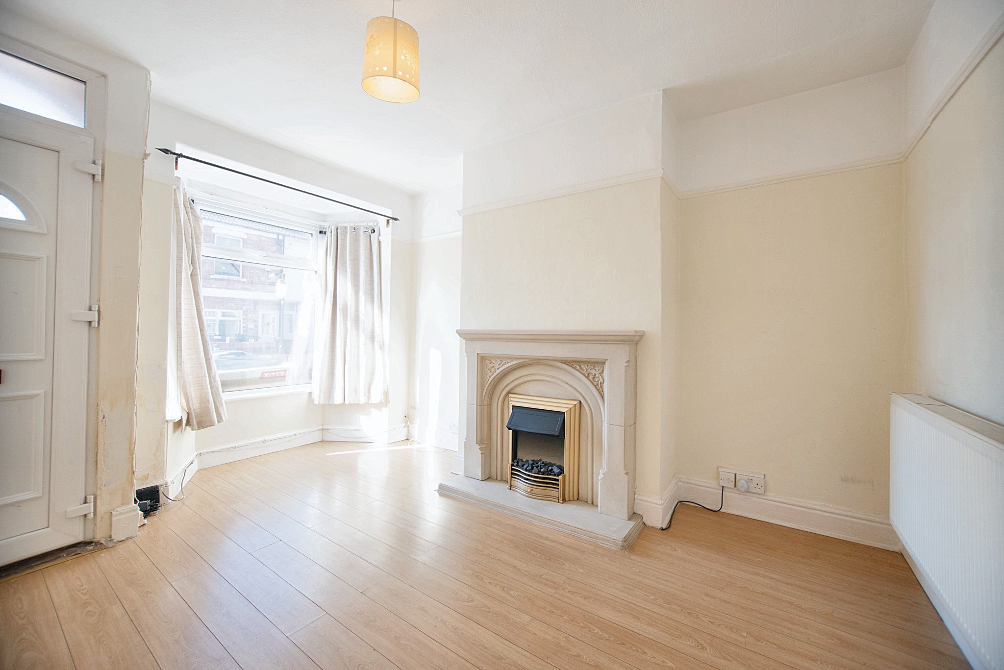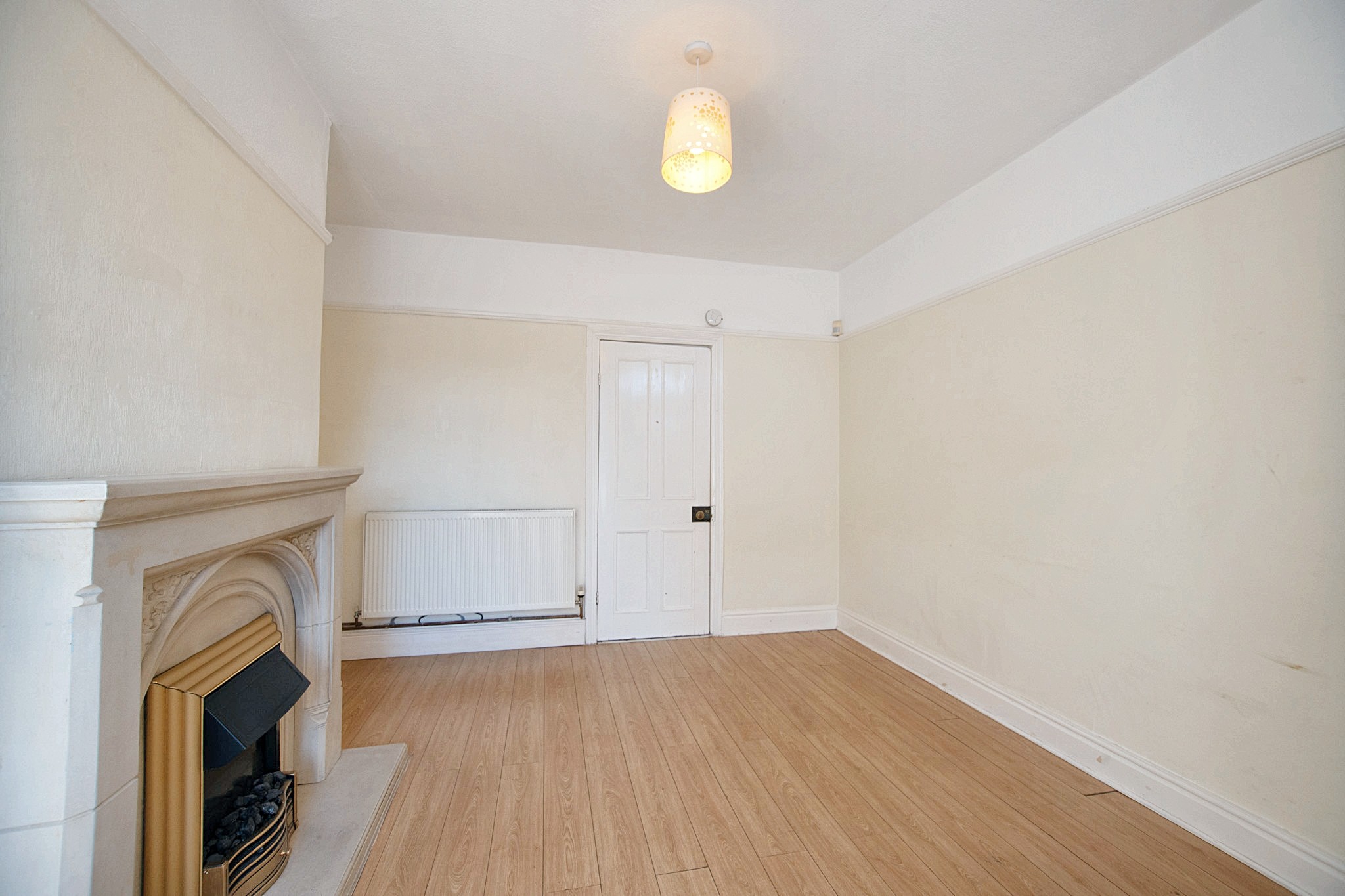 With laminate flooring, electric fireplace, double glazed window, radiator and door leading to the dining area.