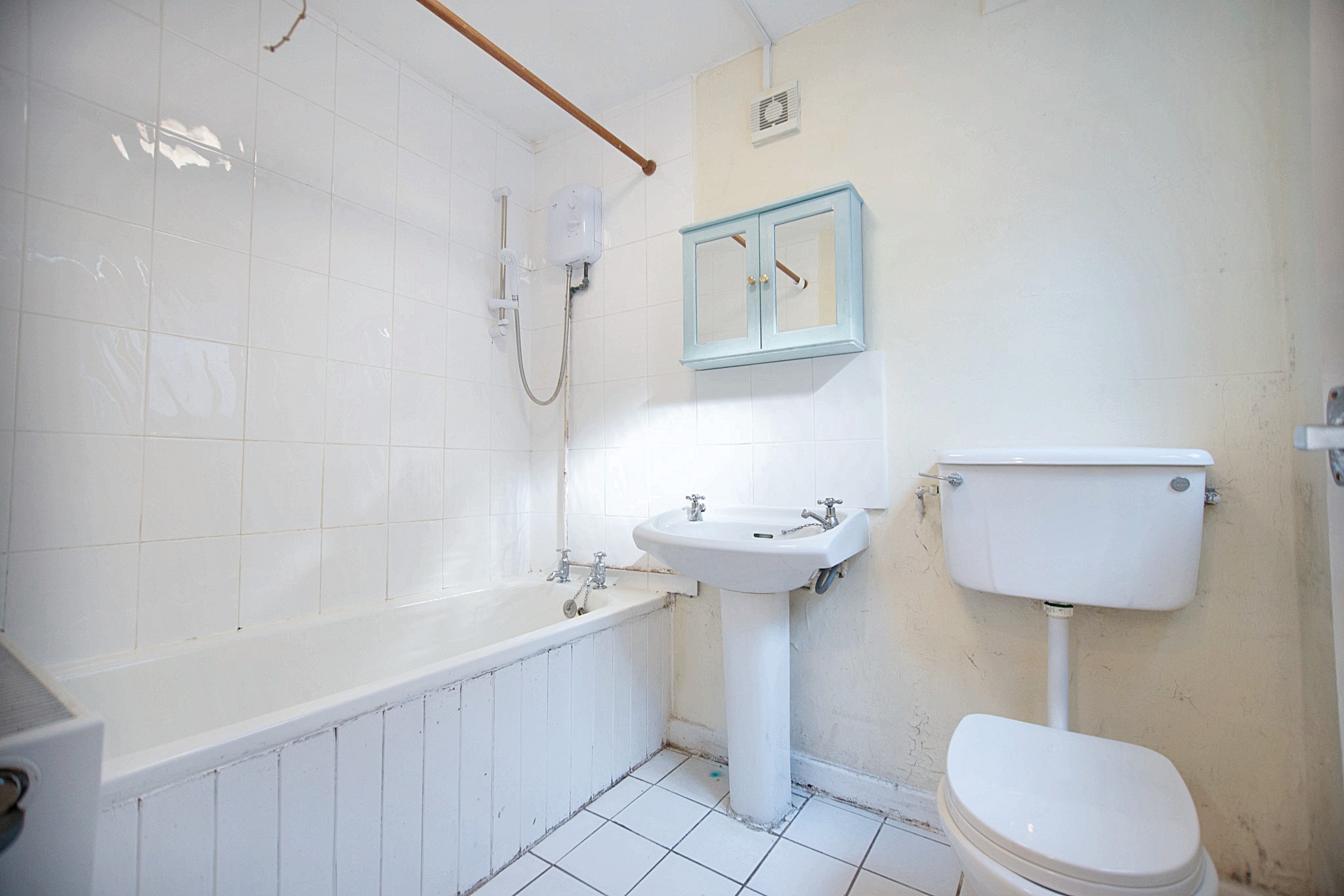 With tiled flooring, hand wash pedestal basin, bath cubicle, shower attachment, WC, radiator and double glazed window.