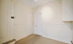 With vinyl flooring, doors leading to the bathroom and rear yard.