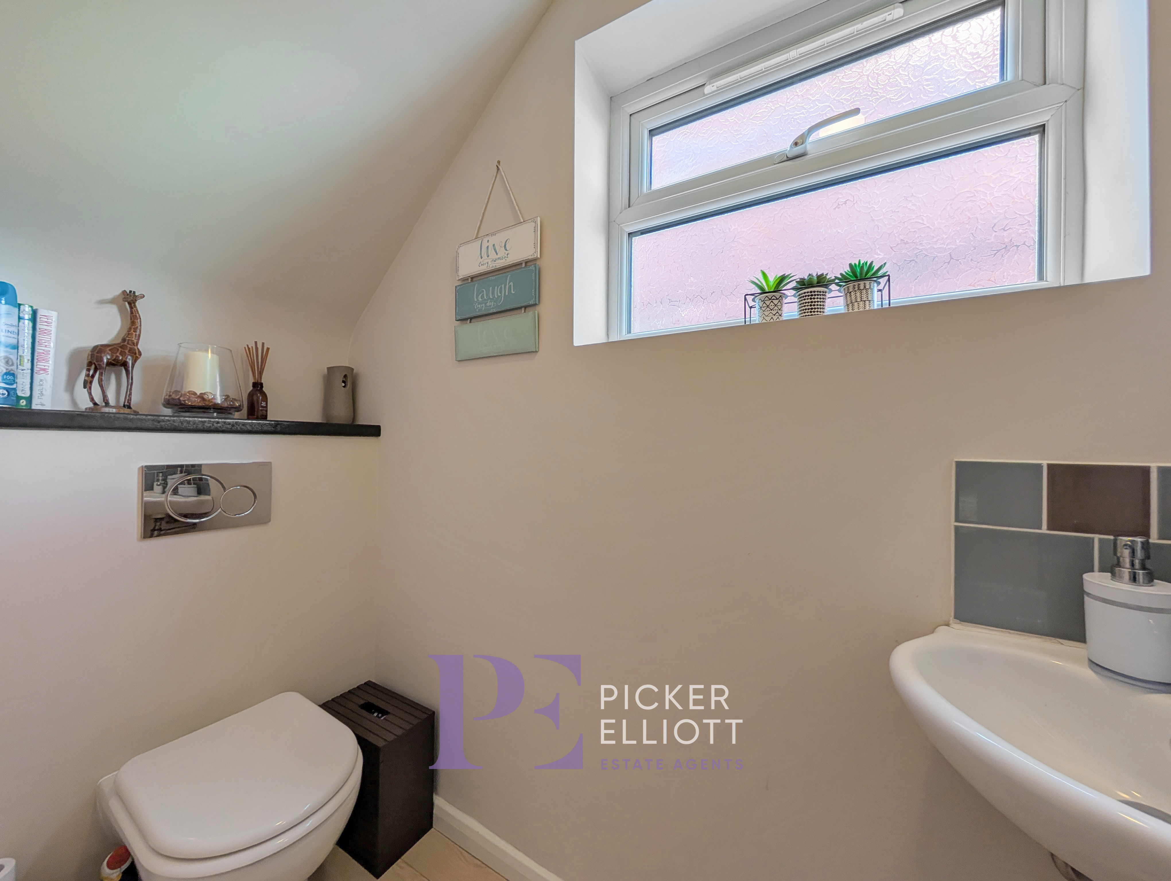 The property includes a downstairs cloakroom with a central heating radiator, a wall-mounted toilet, and a compact wash basin. The room features neutral décor, and natural light is provided by a frosted window.