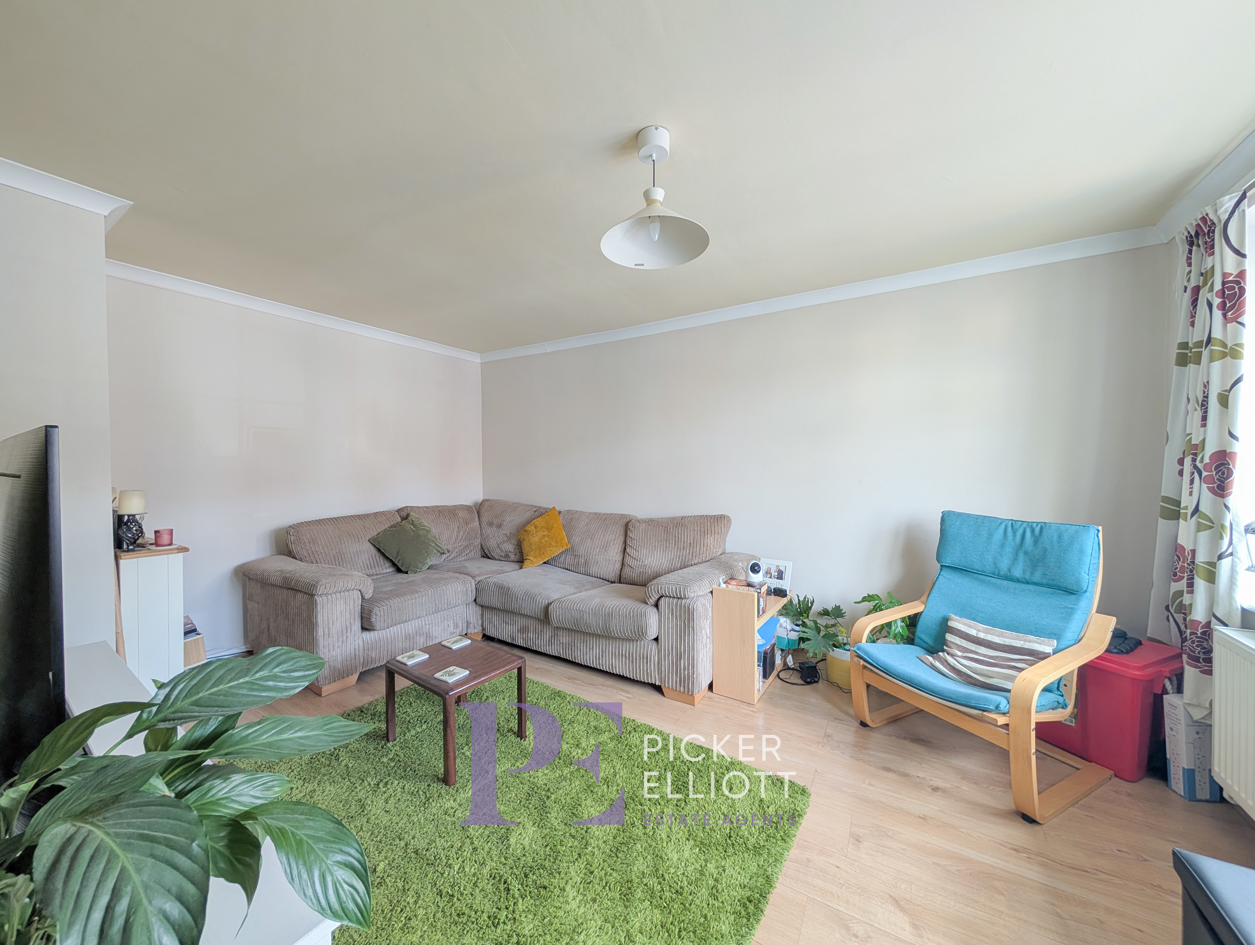 This lounge, positioned at the front of the property, benefits from a central heating radiator and a double-glazed UPVC bay window that allows for ample natural light. The room is finished with wood-effect flooring and neutral décor, and its spacious layout provides room for various furniture arrangements.