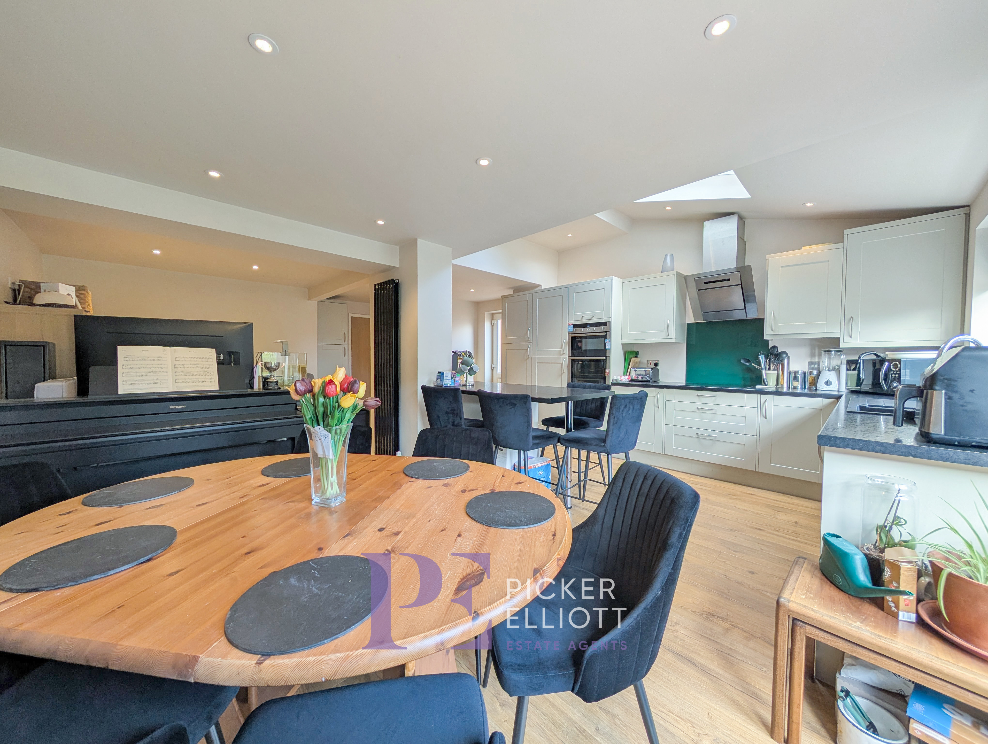 This extended space features a Magnet fitted kitchen finished with a breakfast bar and a range of wall and floor-mounted units. The kitchen includes integrated appliances, comprising a NEFF double oven, and NEFF induction hob, fridge-freezer, dishwasher, and washing machine. A skylight and double-glazed window provide natural light, with a UPVC door offering side access. The dining area is positioned with patio doors that open onto the rear garden, and the entire space is heated by two black vertical central heating radiators.