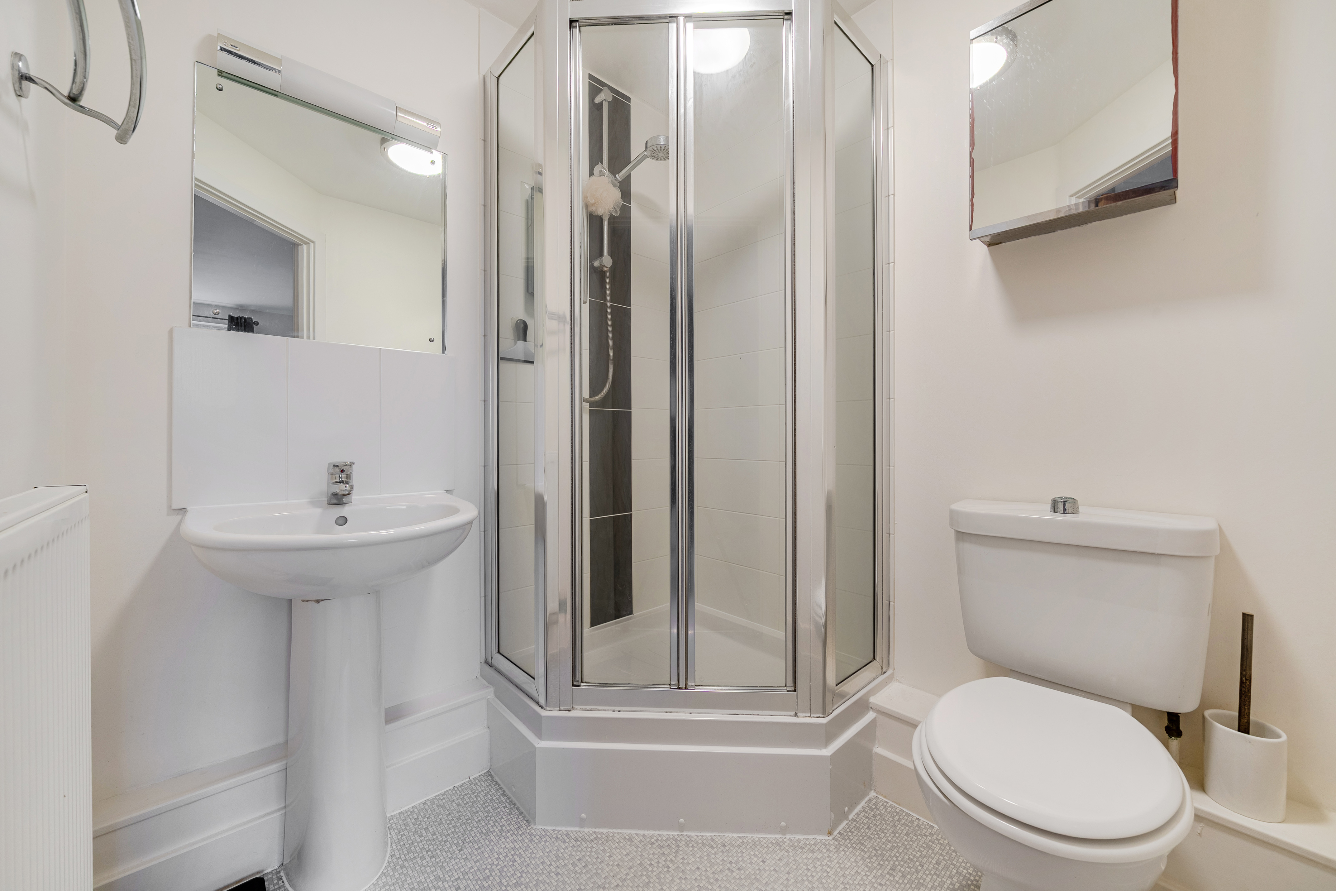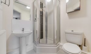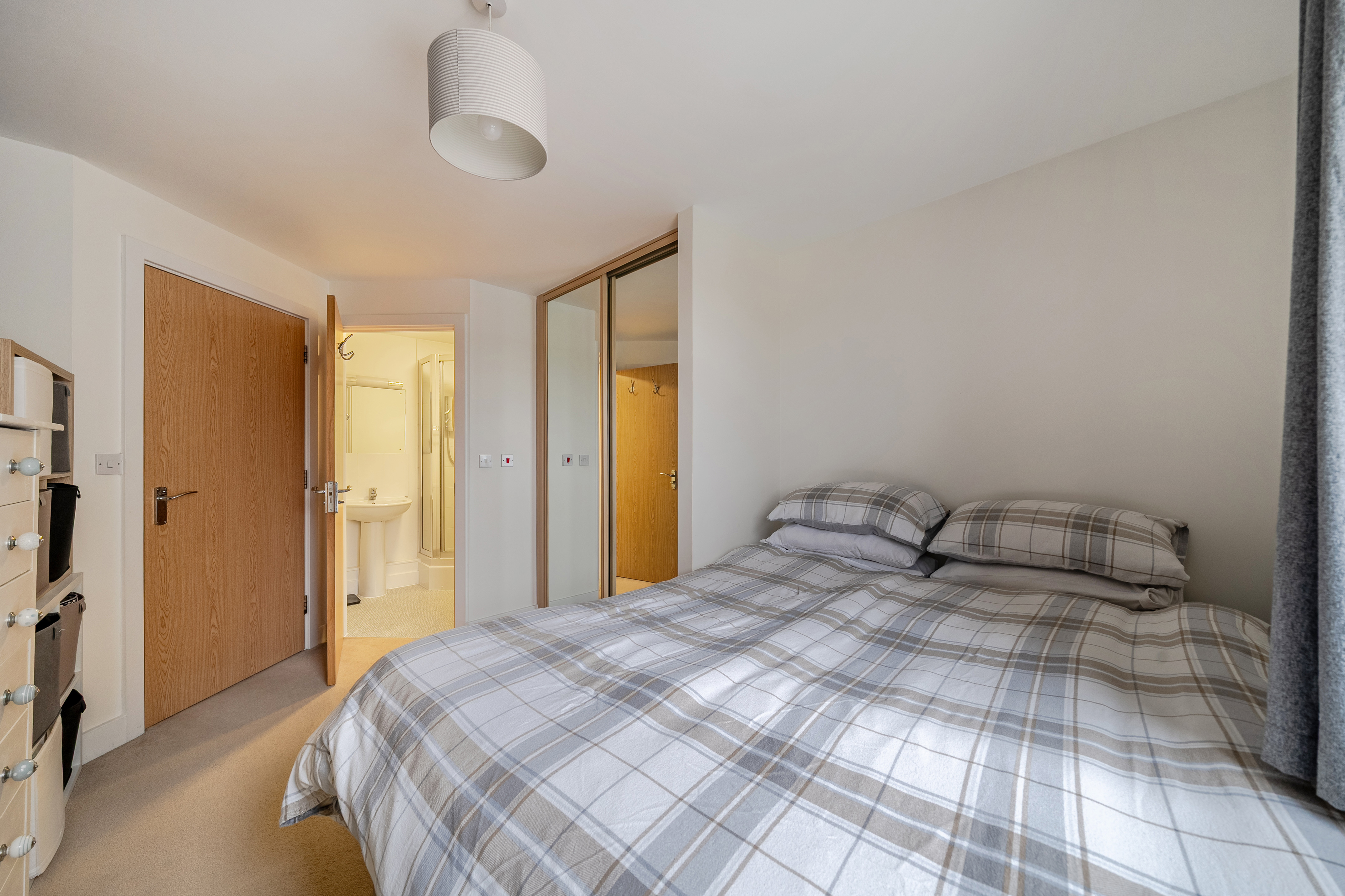 The property is fully double glazed and benefits from gas central heating. The family bathroom includes a bath with shower attachment, WC and pedestal wash basin, with part-tiled walls, mirror and lighting. There are two well-proportioned double bedrooms, making the apartment suitable for sharers, guests or home working. The main bedroom includes built-in wardrobes and an en suite shower room with corner shower, WC and wash basin, finished to match the bathroom.