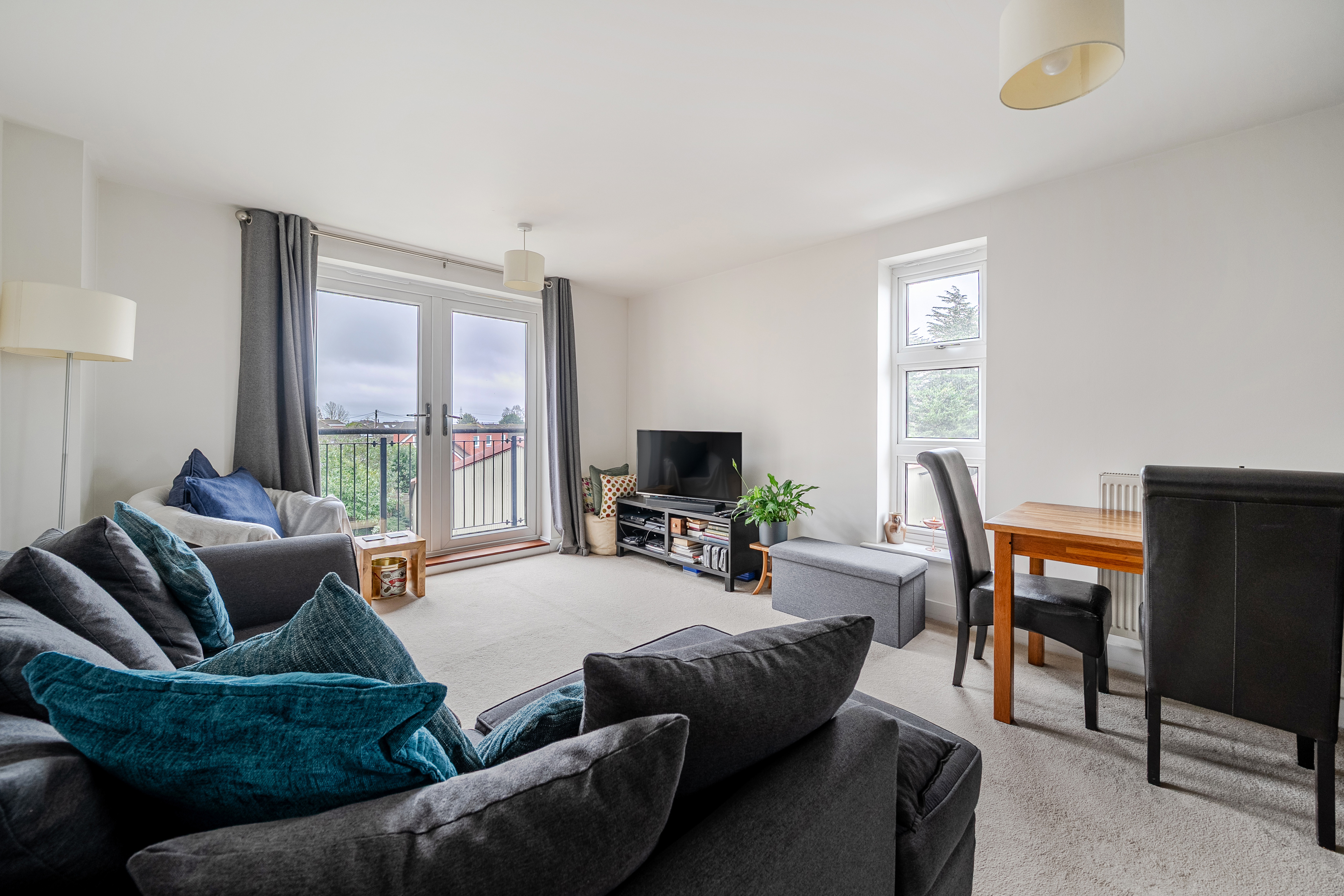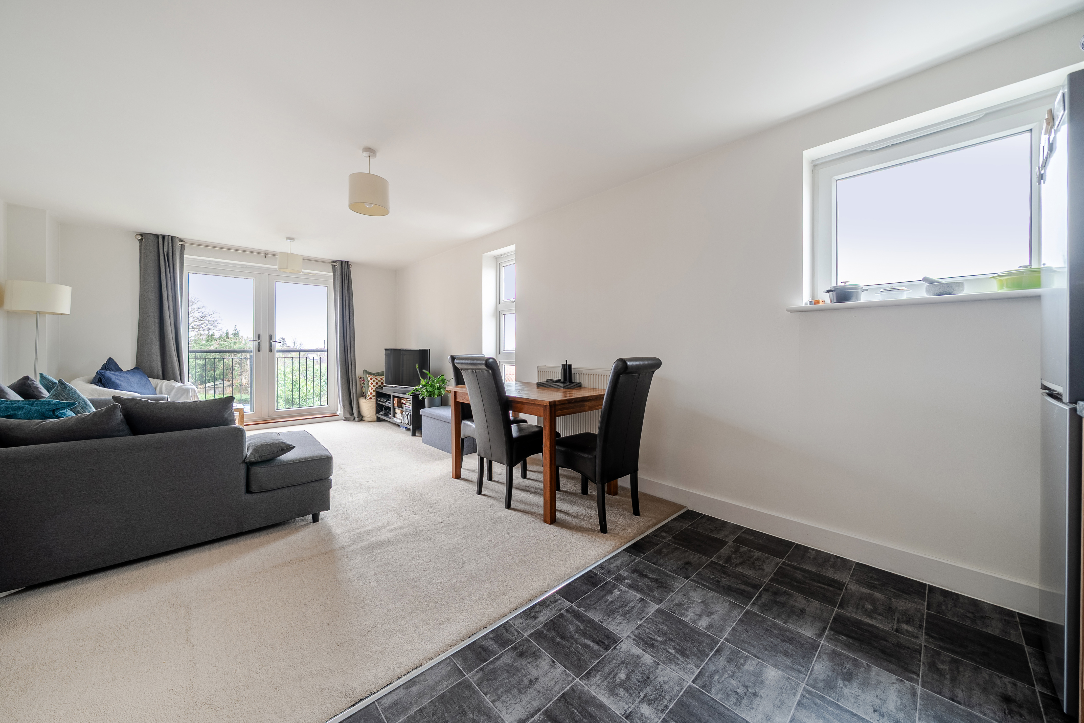 Set within a purpose-built development, the apartment opens into a central hallway with two generous storage cupboards, ideal for coats, shoes and household essentials. The main living space is bright and well laid out, combining kitchen, dining and lounge areas into one comfortable, sociable room. French doors bring in plenty of natural light and open onto a private balcony.