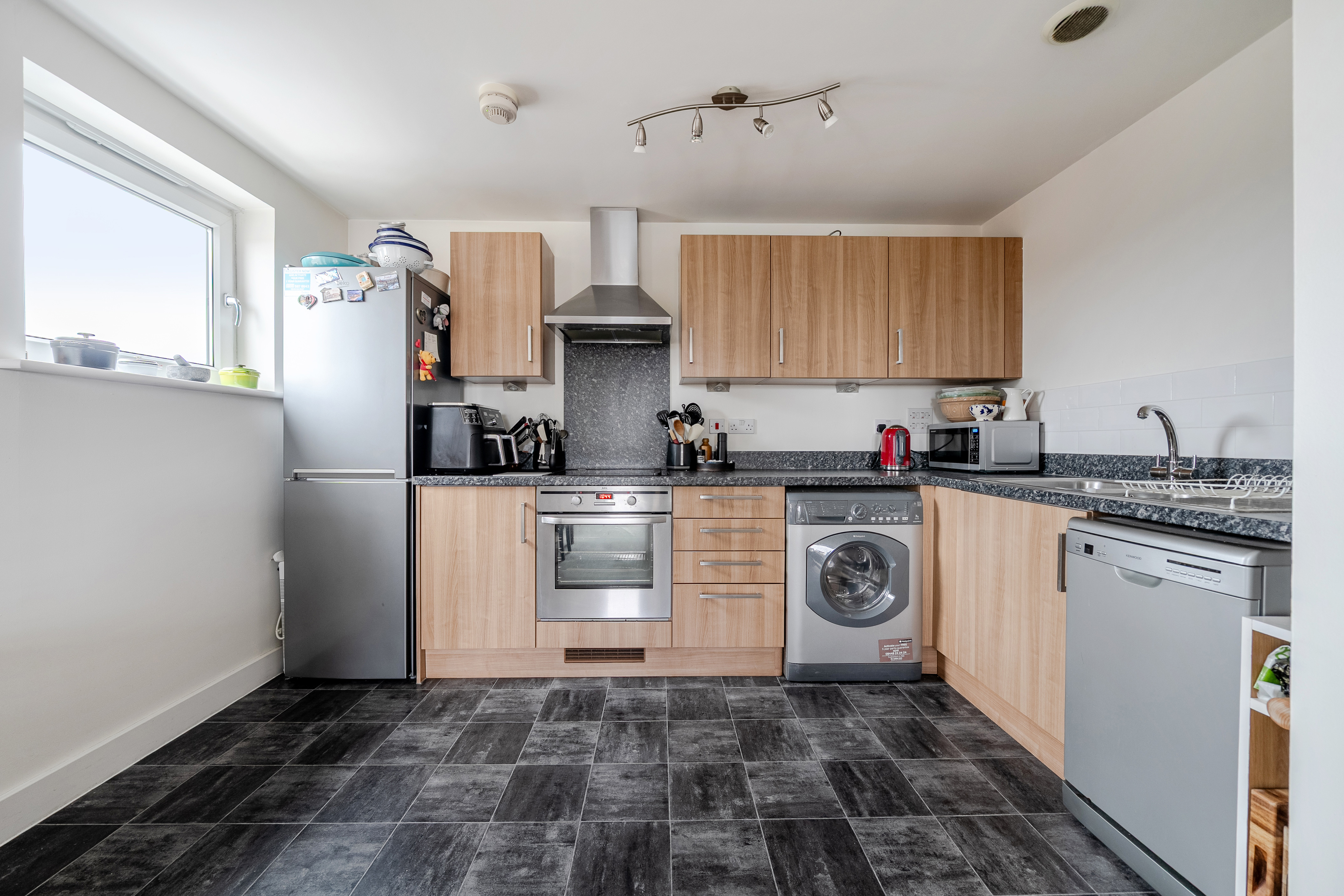 The kitchen is well equipped for everyday use, featuring a built-in oven with electric hob and extractor, stainless steel sink with drainer and a good range of wall and base units with roll top work surfaces. There’s space for a full-size dishwasher, washer dryer and upright fridge freezer.