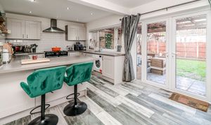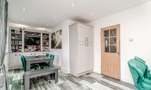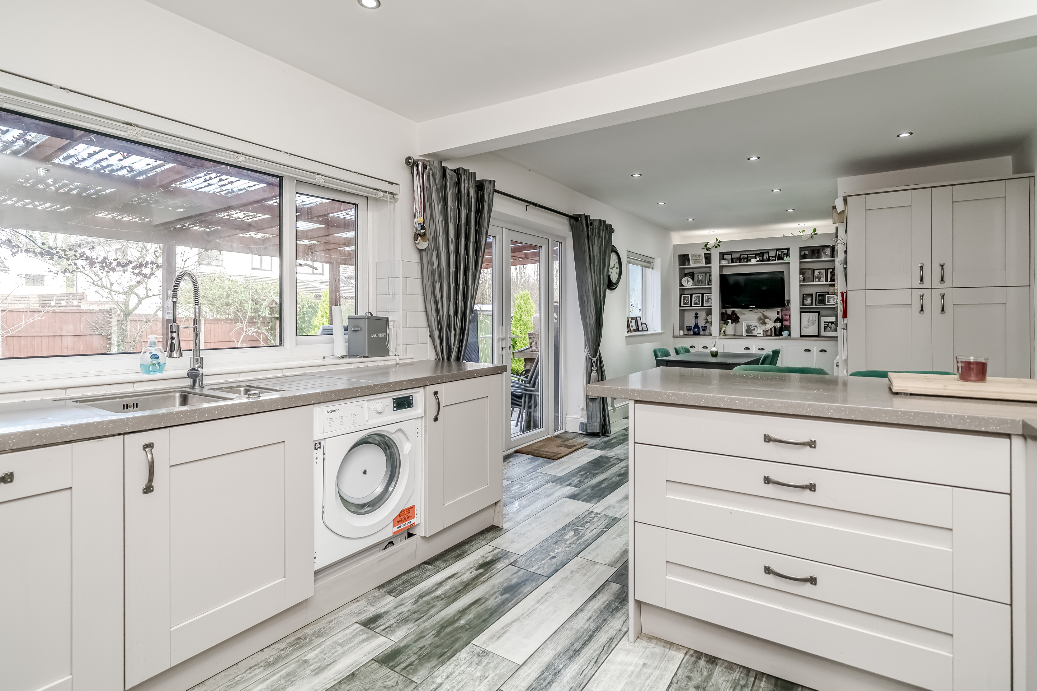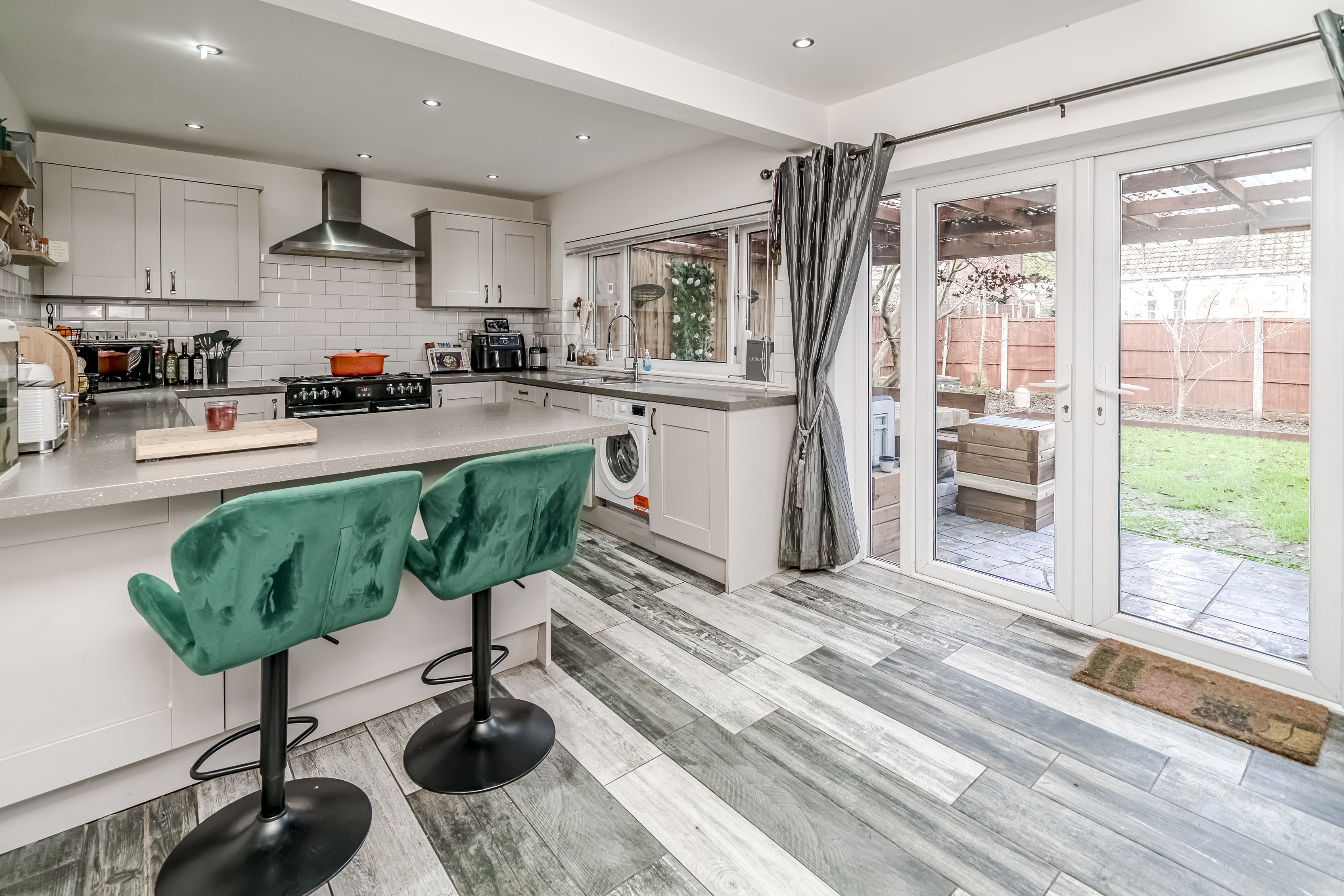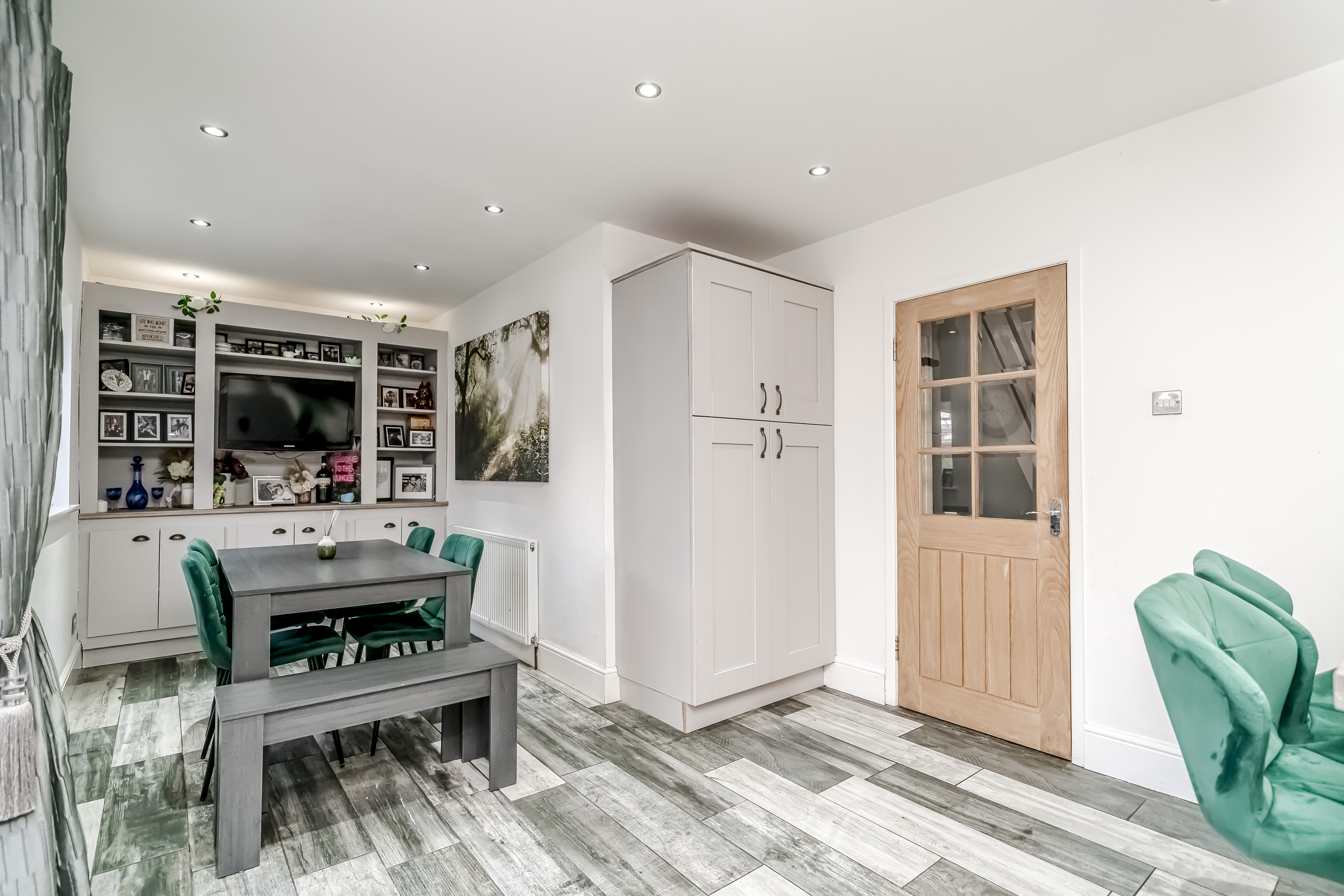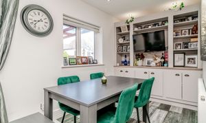 Adjacent to the lounge, the second reception room offers flexible living options, whether you envision it as a snug, playroom or formal sitting area. This room also boasts a lovely bay window and patio doors, ensuring the space is always bright and airy, while the built-in office space is perfect for remote working or homework. At the heart of the home lies the modern kitchen diner, designed in a timeless light-coloured shaker style that brings a fresh, contemporary feel. The kitchen is thoughtfully arranged with a breakfast bar for casual meals or morning coffee, and there’s ample space for a large dining table, making family mealtimes and entertaining a true pleasure.