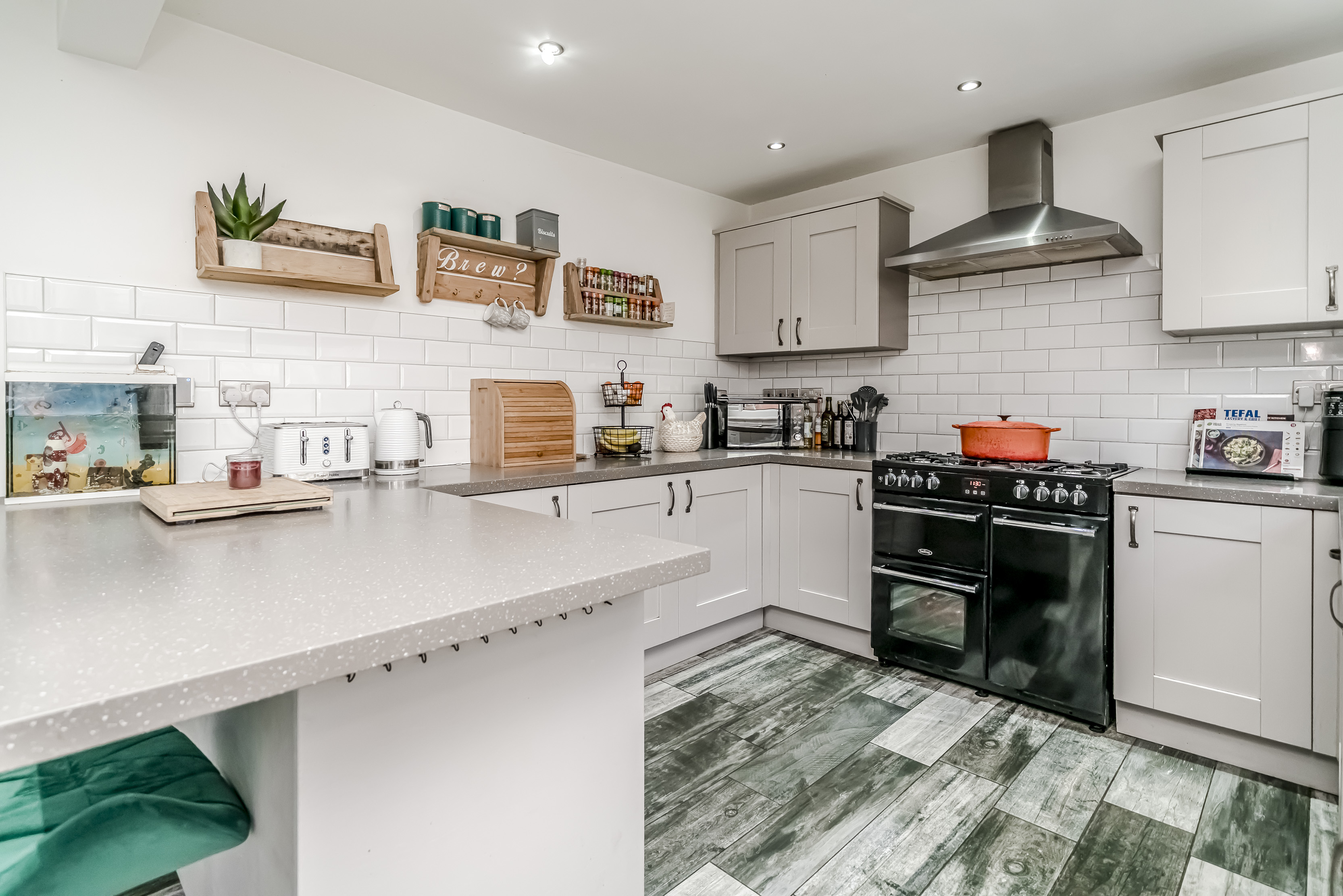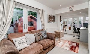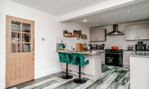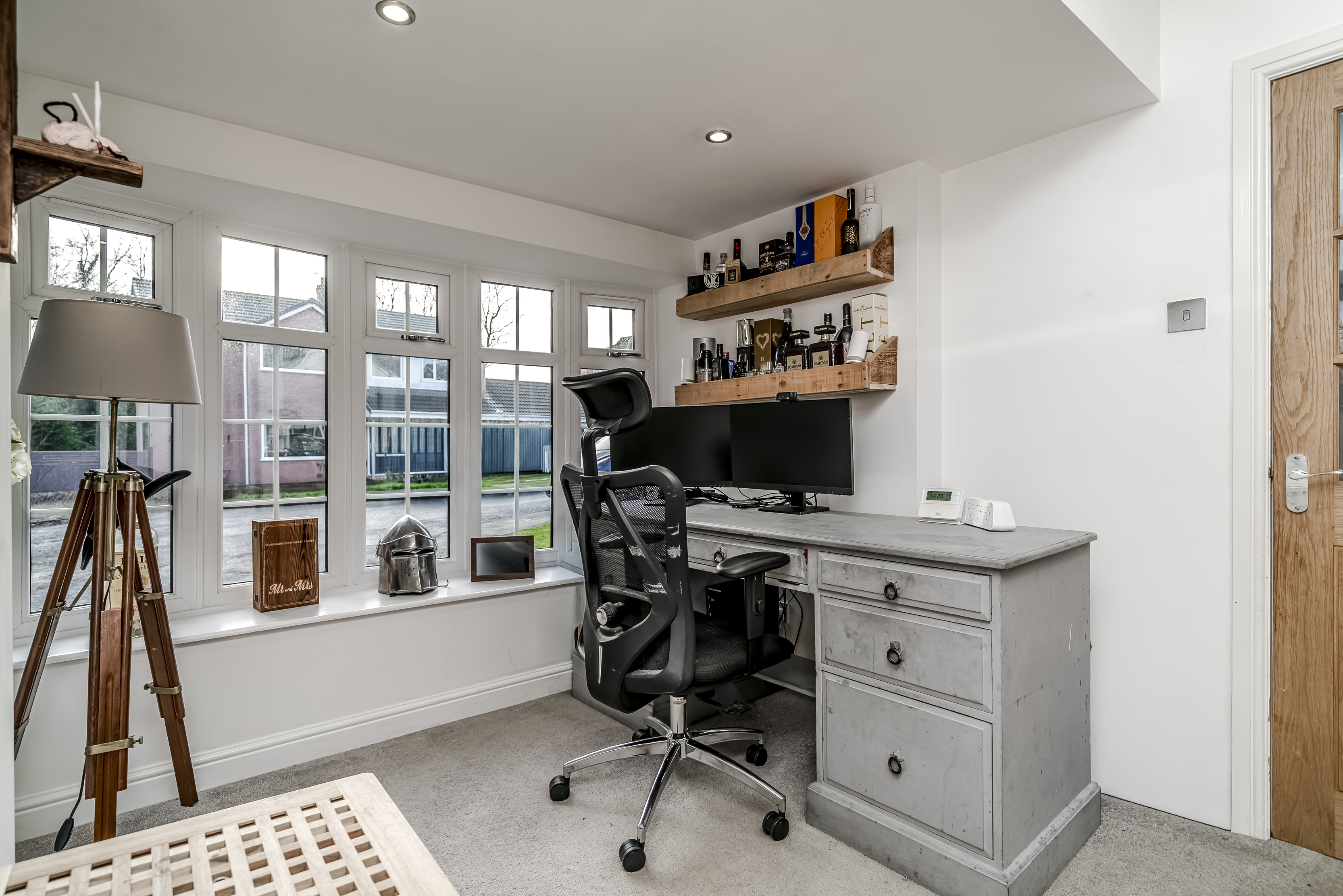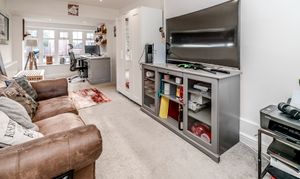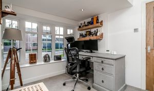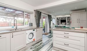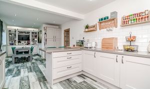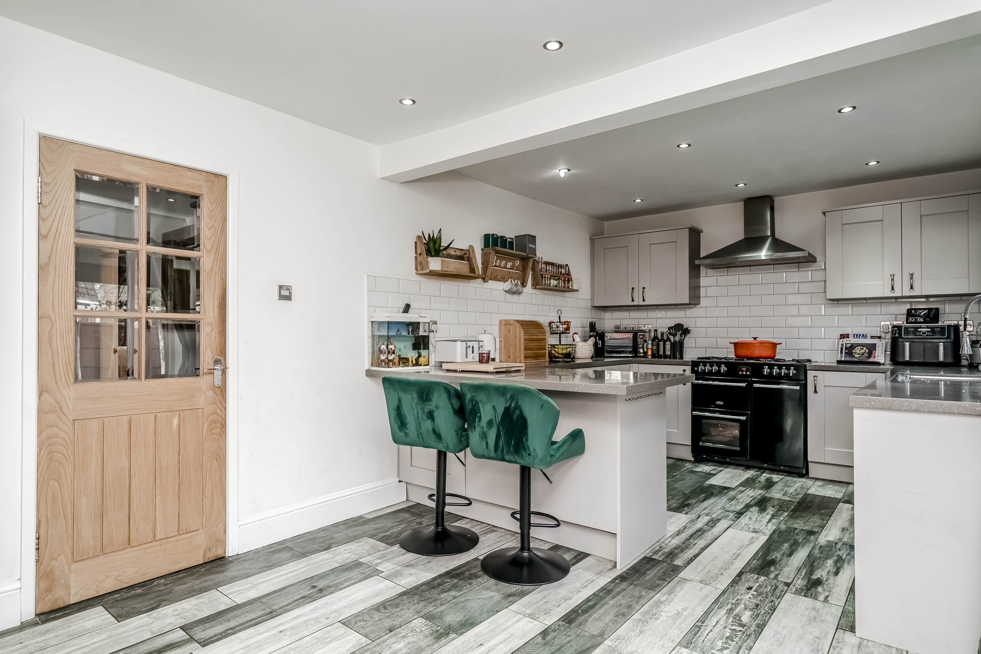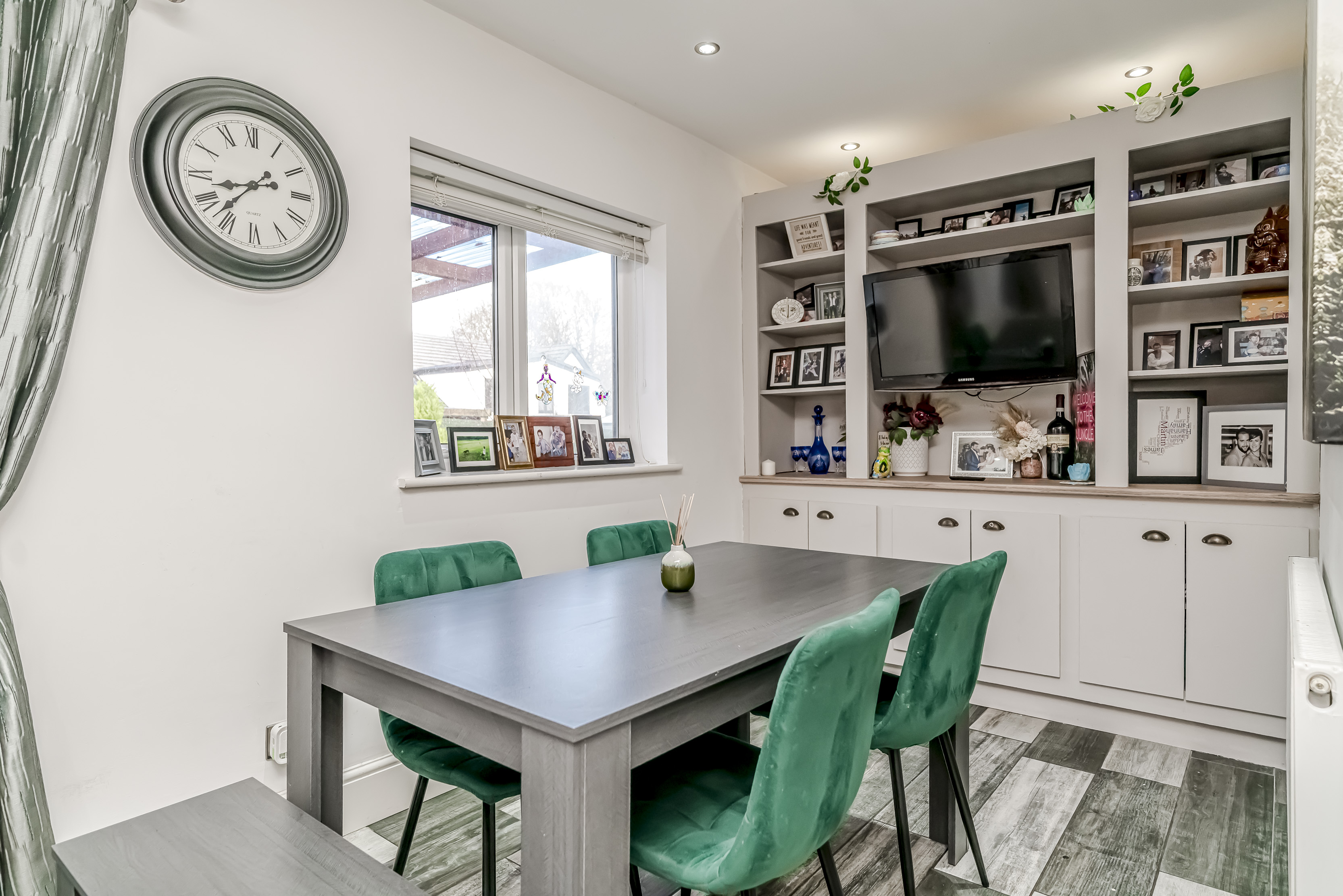 Adjacent to the lounge, the second reception room offers flexible living options, whether you envision it as a snug, playroom or formal sitting area. This room also boasts a lovely bay window and patio doors, ensuring the space is always bright and airy, while the built-in office space is perfect for remote working or homework. At the heart of the home lies the modern kitchen diner, designed in a timeless light-coloured shaker style that brings a fresh, contemporary feel. The kitchen is thoughtfully arranged with a breakfast bar for casual meals or morning coffee, and there’s ample space for a large dining table, making family mealtimes and entertaining a true pleasure.