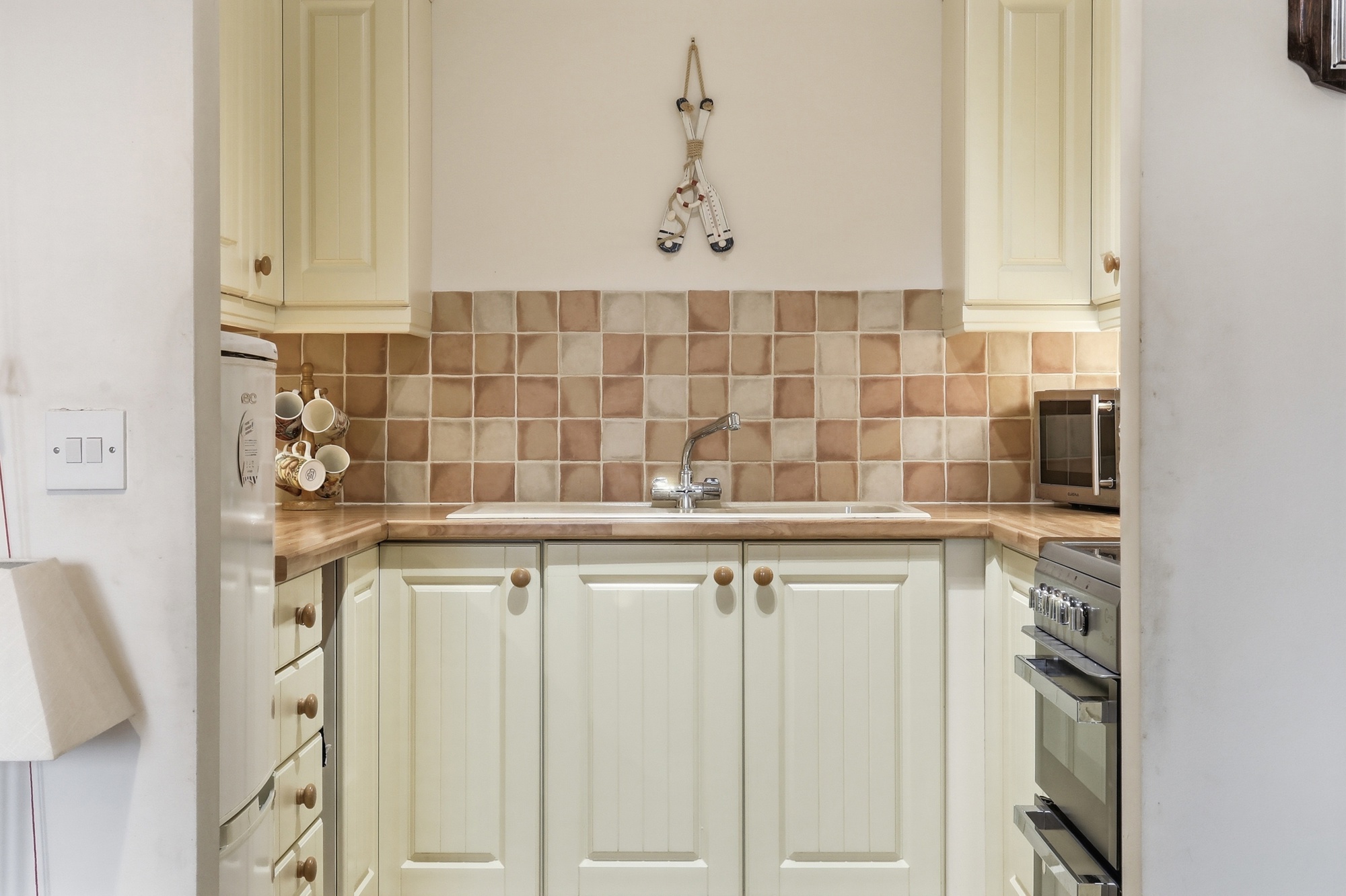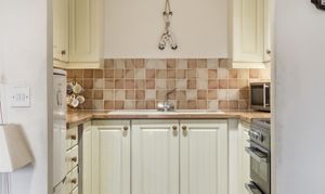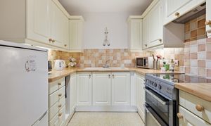 Beautifully fitted with a range of matching eye and base units, worksurface. Built in oven and hob. Space for fridge/freezer