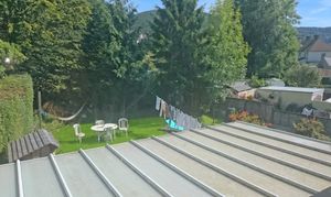 The summer room flows effortlessly out to the expansive garden, offering a seamless indoor-outdoor living experience.