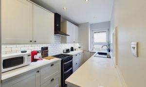 Modern and in good condition throughout, the kitchen offers ample work surface space, plenty of storage and a handy hatch to the living room.