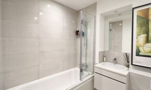 - Bathroom with shower over bath and heated towel rail