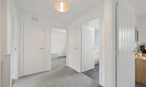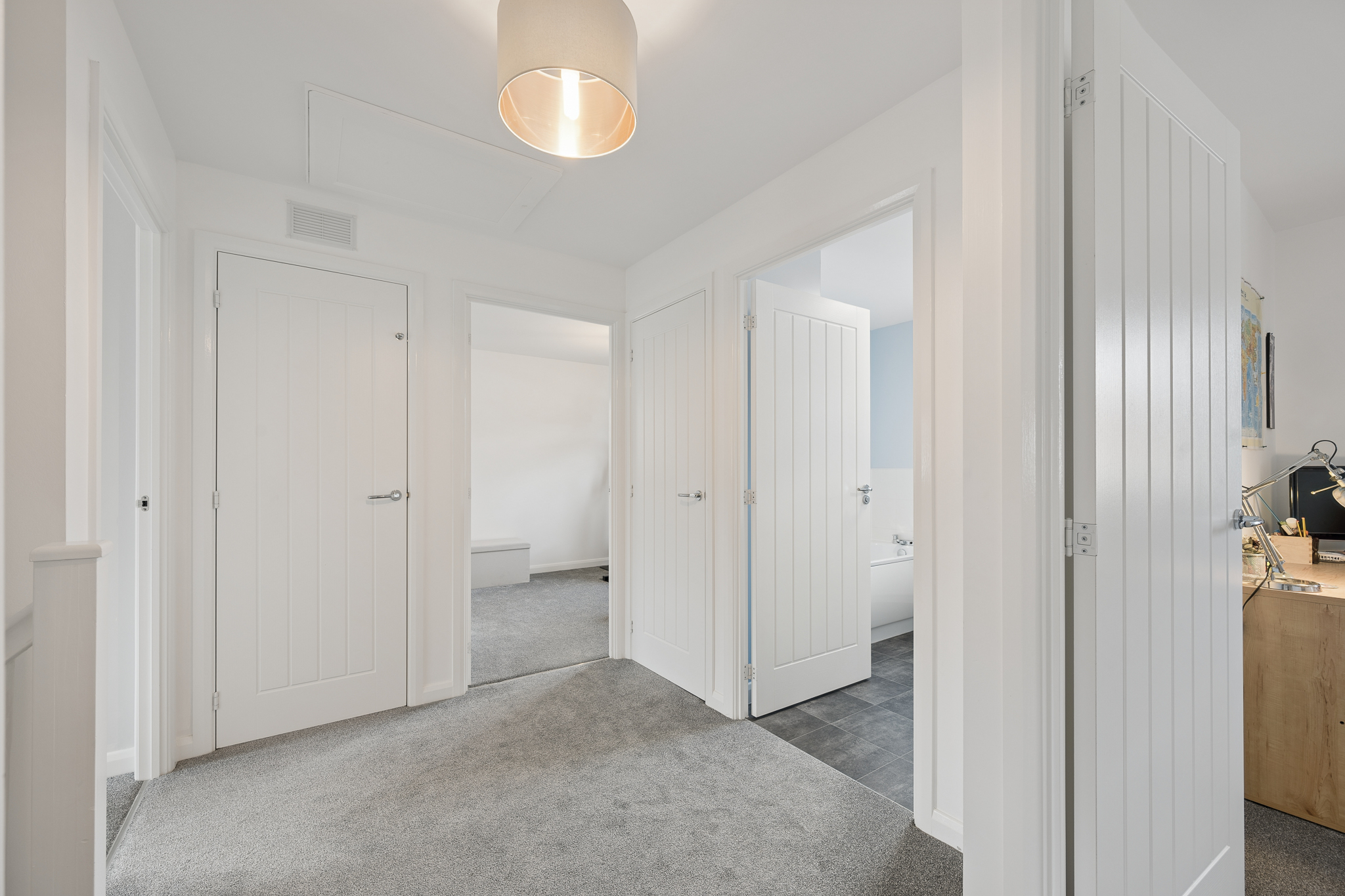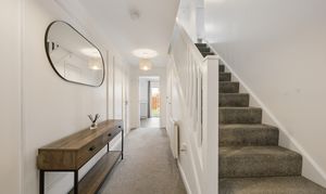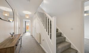 Step inside and you are welcomed by a bright, spacious hallway, finished with crisp white walls and elegant decorative panelling that immediately creates a sense of style and refinement. The soft grey carpeting running through the hallway and into the main living spaces adds warmth and comfort underfoot, while the generous proportions make this a truly impressive first impression. The hallway also benefits from excellent practicality, with useful storage cupboards including a generous under stairs cupboard, ensuring everyday essentials can be neatly tucked away.