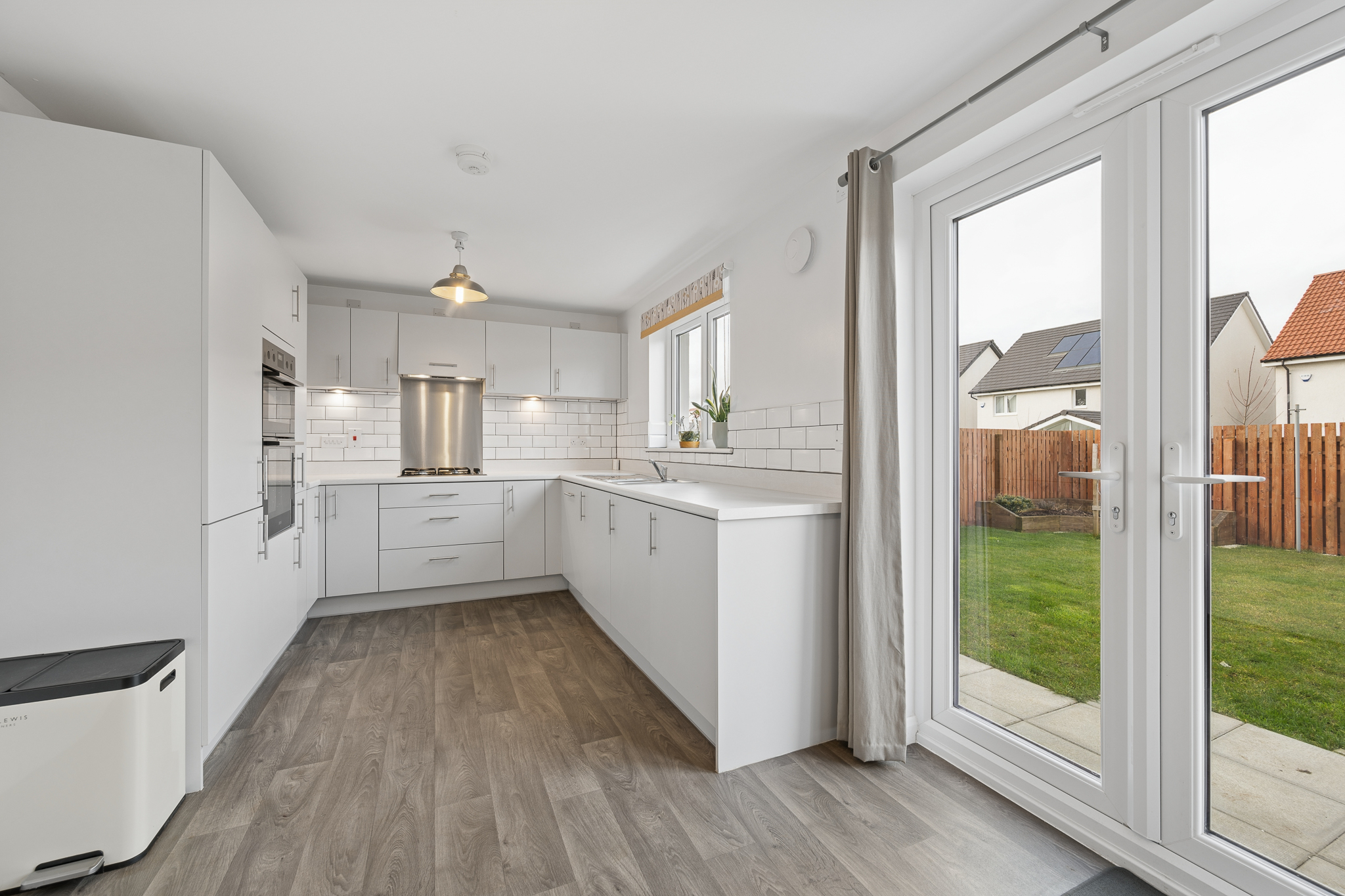Flooded with natural light, the kitchen area also enjoys patio doors leading directly out to the rear garden, seamlessly connecting indoor and outdoor living.