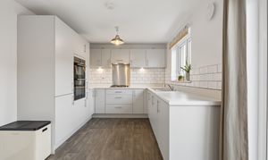 The modern kitchen is beautifully finished with sleek light-toned cabinetry, contemporary chrome handles, and light worktops that complement the clean aesthetic of the space. The stylish white metro tile splashback adds texture and visual interest while maintaining the bright, modern feel. A gas hob with stainless steel splashback and extractor hood provides a practical cooking space, while integrated appliances ensure the kitchen remains streamlined and uncluttered, including an integrated fridge freezer, dishwasher and washing machine. Thoughtfully designed storage solutions ensure everything has its place and the room also benefits from a fantastic additional storage cupboard, perfect for keeping household items neatly organised.