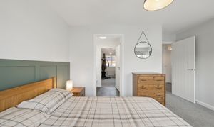 Positioned to the front right of the property, the living room is a wonderfully calm and inviting space that offers the perfect blank canvas for buyers to make their own. A standout feature of this room is the bespoke built in shelving and bookcase wall, finished in a rich sage green tone, which instantly adds character, personality and a sense of luxury. The shelving is beautifully styled with integrated lighting, creating warm pools of light that highlight books, décor and personal pieces, giving the room a boutique, designer feel. This custom feature elevates the space beyond a typical new build living room and creates a stunning focal point that feels both sophisticated and homely.
