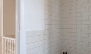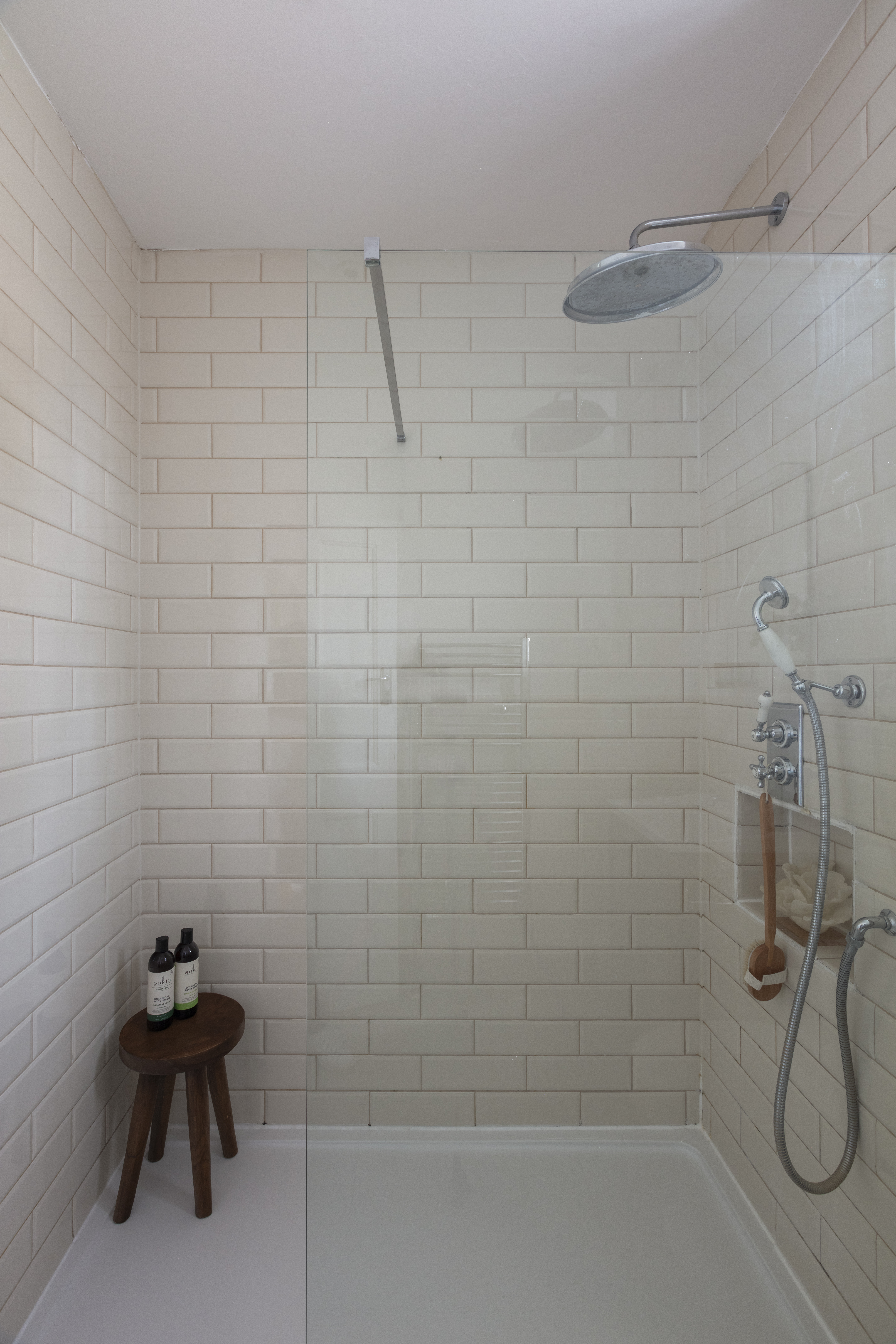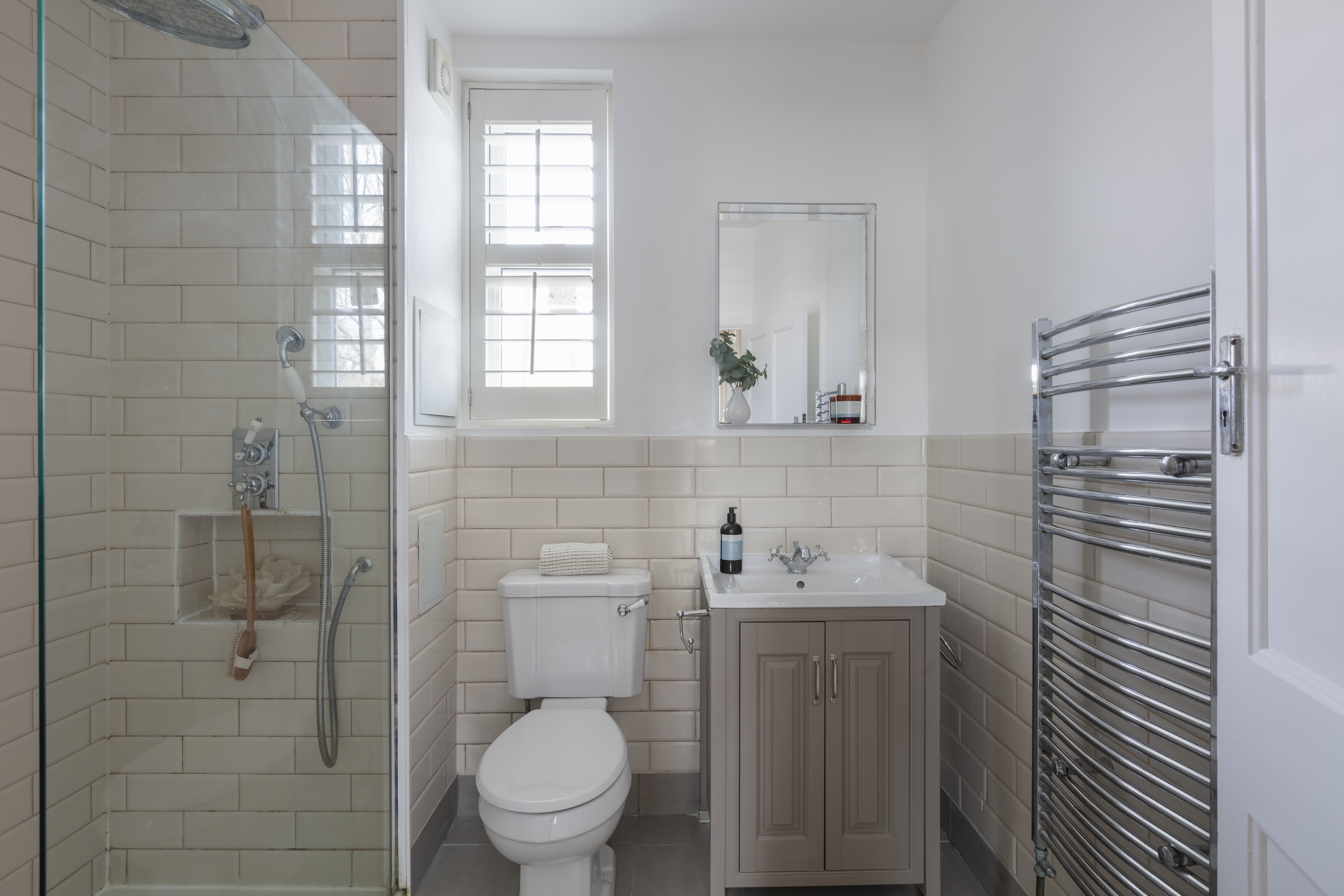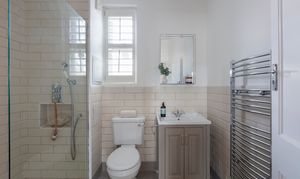 You’ll find the family bathroom towards the rear, lit by a garden-facing window with louvred shutters to match those elsewhere. Grey floor tiles pair with white metro wall tiles, while the fittings and fixtures are by Burlington. There is a luxurious walk-in rainfall shower with a frameless glass screen, toiletries niche and shampoo attachment; a basin with grey storage vanity and chrome mixer tap; and a chrome towel rail radiator. A traditional-style close-coupled loo completes the suite.